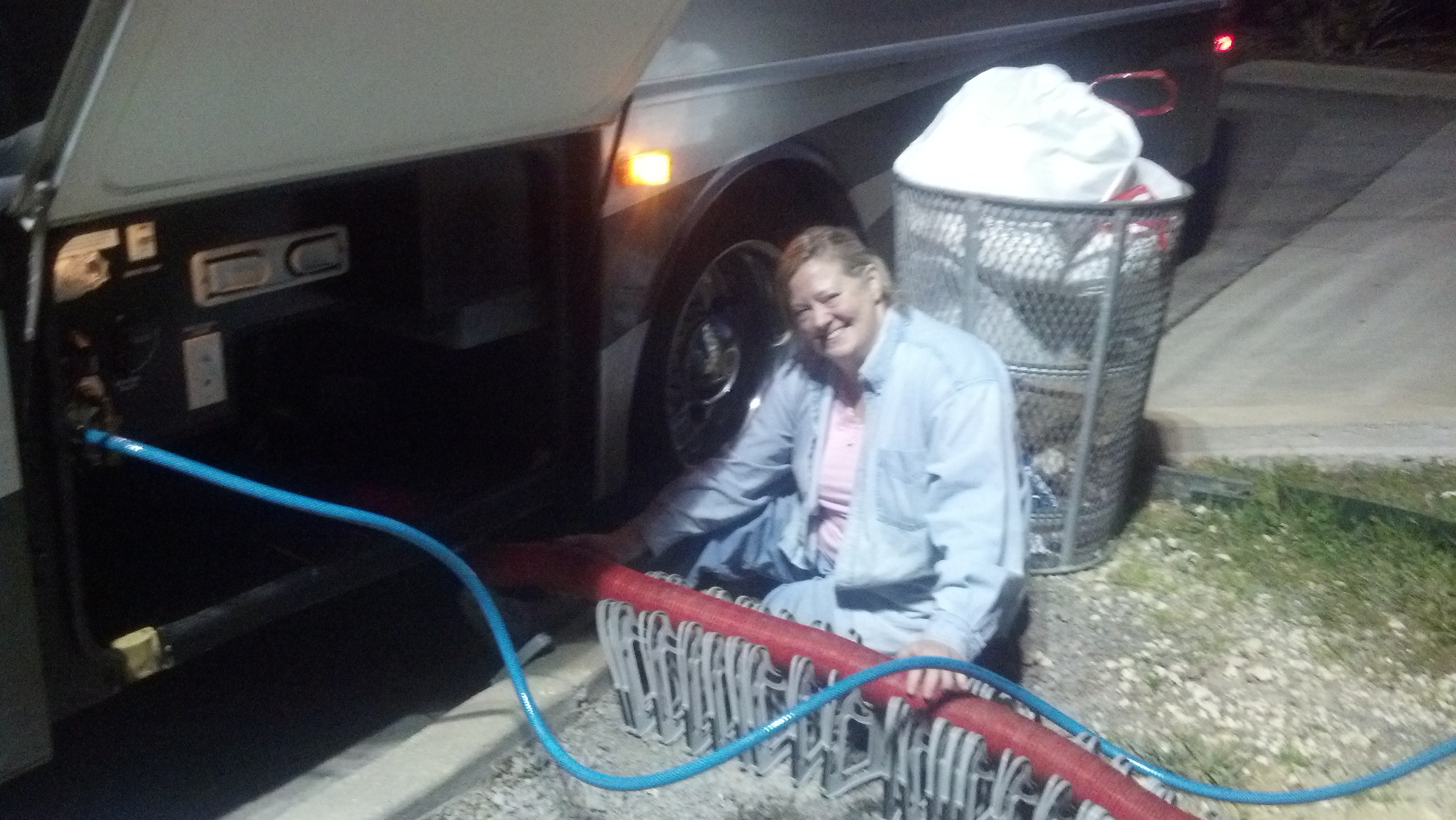 In this picture I am holding up the red tube used to empty Dora’s “stuff” every two weeks. The tube has its own holders (the grey things underneath) but it seems to dip just before those grey things start holding it up and we want to make sure it’s really empty and cleaned out so I help hold it up a bit! My friend Susan told me this picture reminded her of Eddie emptying his RV tanks in his bathrobe in the snow on the movie Christmas Vacation. I’m at least a little better dressed for the occasion!