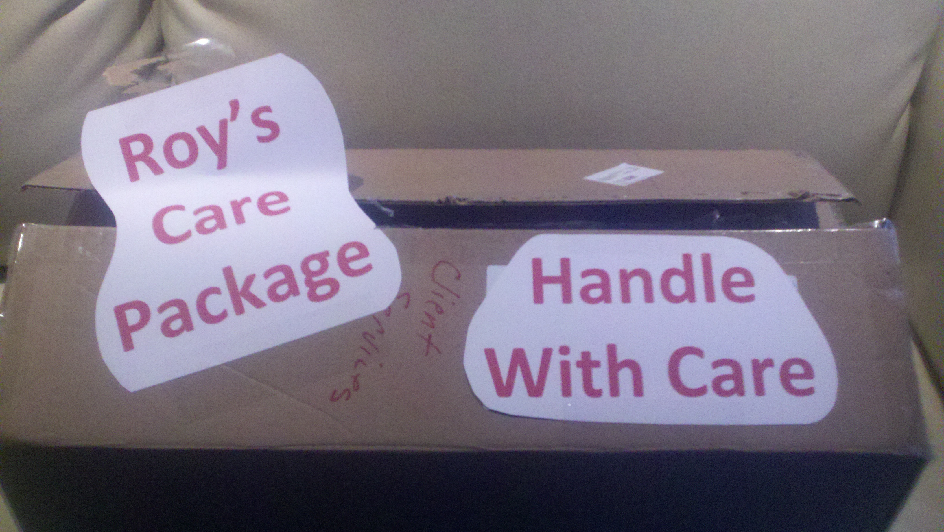 I’ve included pictures below of a couple of the things he got and of the care package. They all had cute little sayings attached to them, pertaining to whatever the object was as it relates to Roy’s retired life. You can read what they say in the pictures.