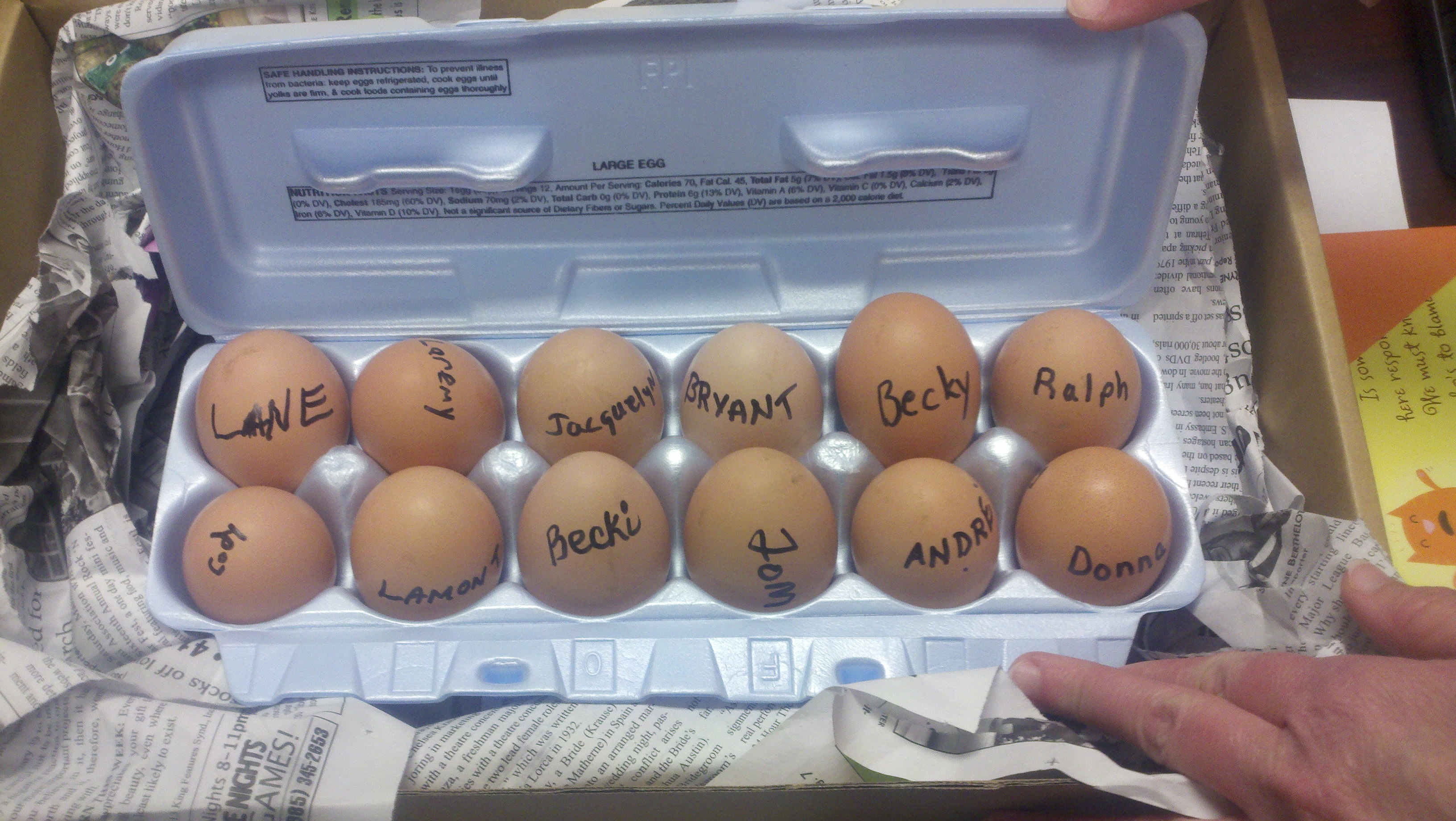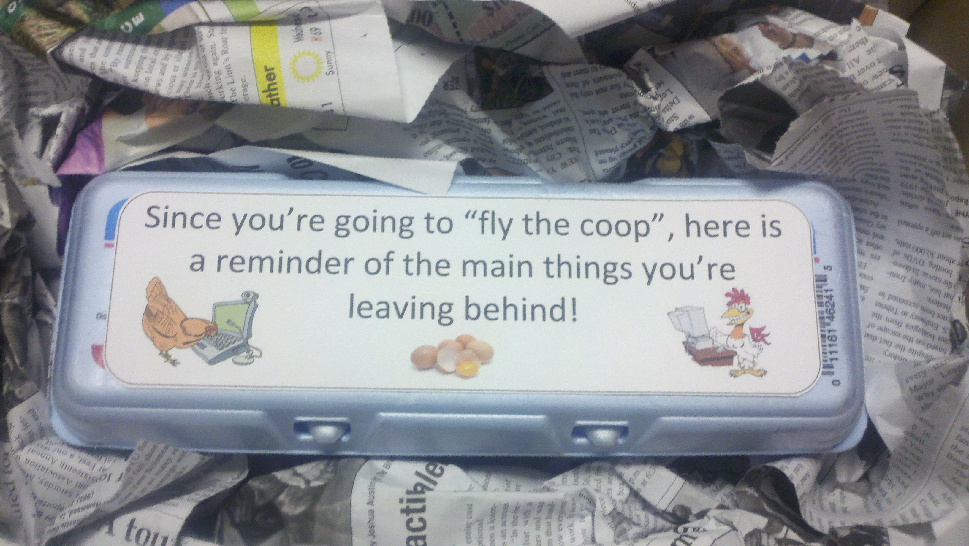 He received a second smaller care package with a message on top of an egg carton “Since you’re going to “fly the coop”, here is a reminder of the main things you’re leaving behind!” Inside were a dozen fresh yard eggs that the 12 staff members wrote their names on.