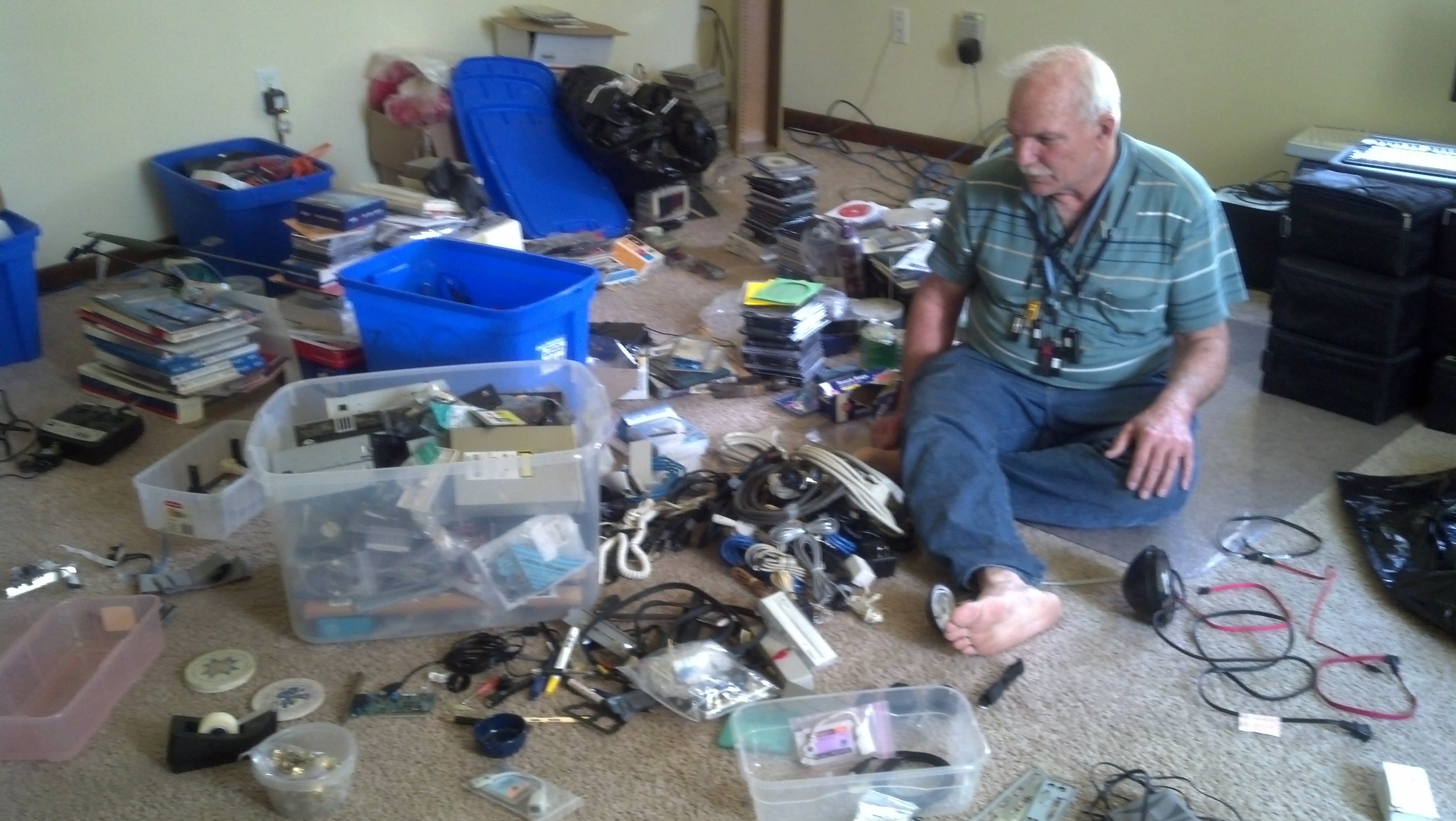 We’ve begun the formidable task of going through all his computer accessories, programs, disks, parts and computers getting them ready for his computer sale.  Chip and his friend Stan helped us by moving the two desks and bookcase out to the garage this past week.  Yesterday at work I received a text message from Roy that said:  “I’m a hoarder.  I can’t do this by myself.  I need your help.”  I could just hear the desperation in his voice.  When I got home we spent Friday evening getting the garage ready with the tables, two desks and bookcase.  He placed 6 of the computers, monitors and keyboards in place.  Today we worked in the computer room for several hours dividing things into piles of things to keep, sell or trash.  The sale pile got priced and packed in storage bins to make out to the garage. Seeing him sitting in the middle of all his little toys with a dozen jump drives around his neck I had to take a picture of him.  He made comments like “This is a sad, sad day.” and I made comments like “You have more computer stuff than any 10 families should have.”
