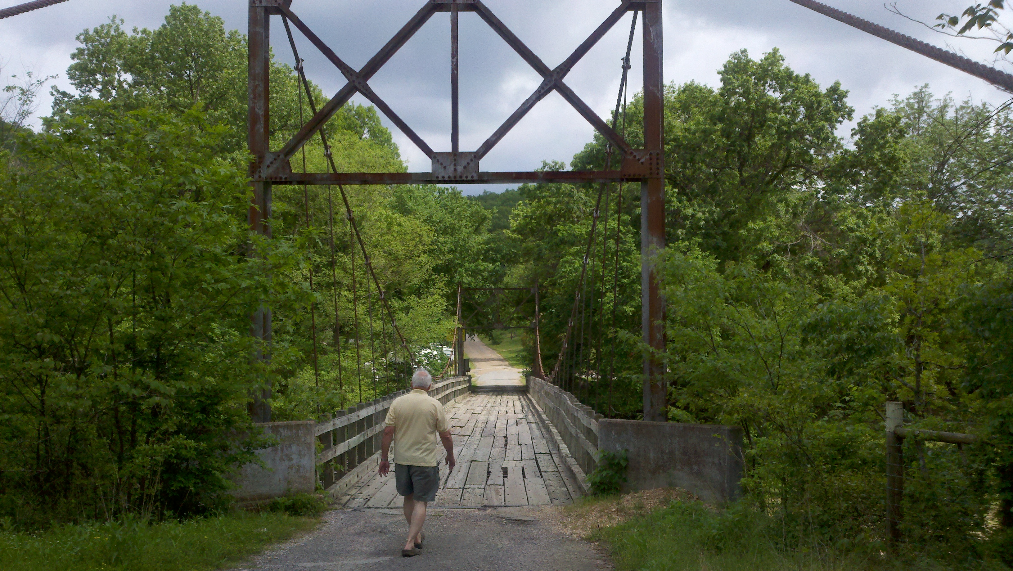 51royonbridge  51rockbybridgeOn our way back to the campground we went to the swinging bridge on the campground property. What a marvel of old, old bridge design this was. Wooden boards made up the road we drove on and it actually swung. It wasn’t in the best condition (that’s putting it very gently) but was fun to see the river that runs through our campground from that view. We parked on the other side and walked over the bridge to enjoy the view. We took lots of pictures throughout today and are including a few of them in here.