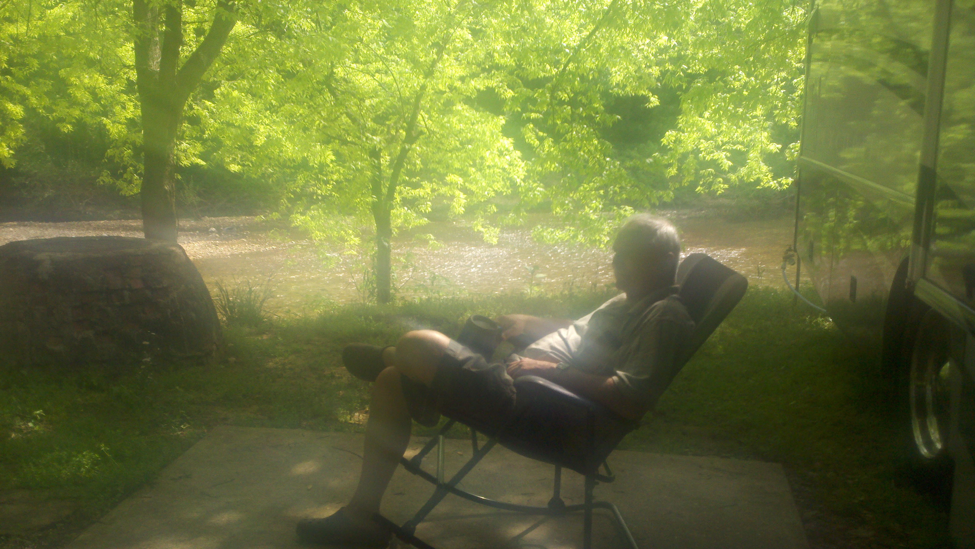 Since waking up this morning the day has been an A++. We sat in our rockers under the awning next to the beach and rushing waters drinking our morning coffee. Talk about washing your cares away! We made our way down the hill to the beach, played and walked in the waters for a while totally enjoying ourselves. While we wanted to cross the water to the beach on the other side, the current was so strong we were afraid we’d wind up way down the stream and not by choice! I walked along the beach to the bridge that goes over the water and up the hill to the office to tell them we want to stay again tonight. Picked up a rock to send to Madisyn and enjoyed my stroll tremendously. Listening to the water rushing by, hearing the birds chirping and getting some exercise made for a perfect morning.