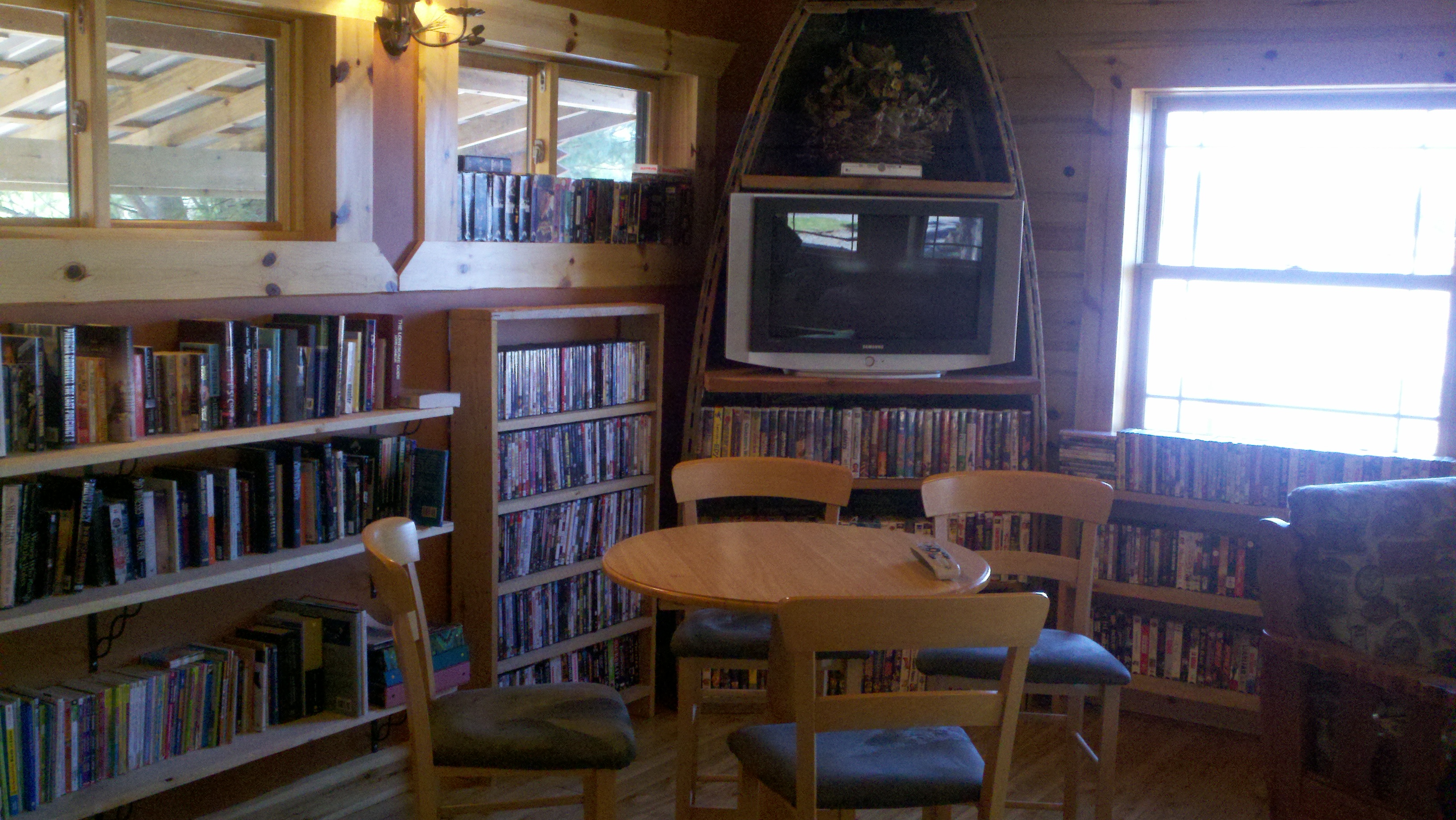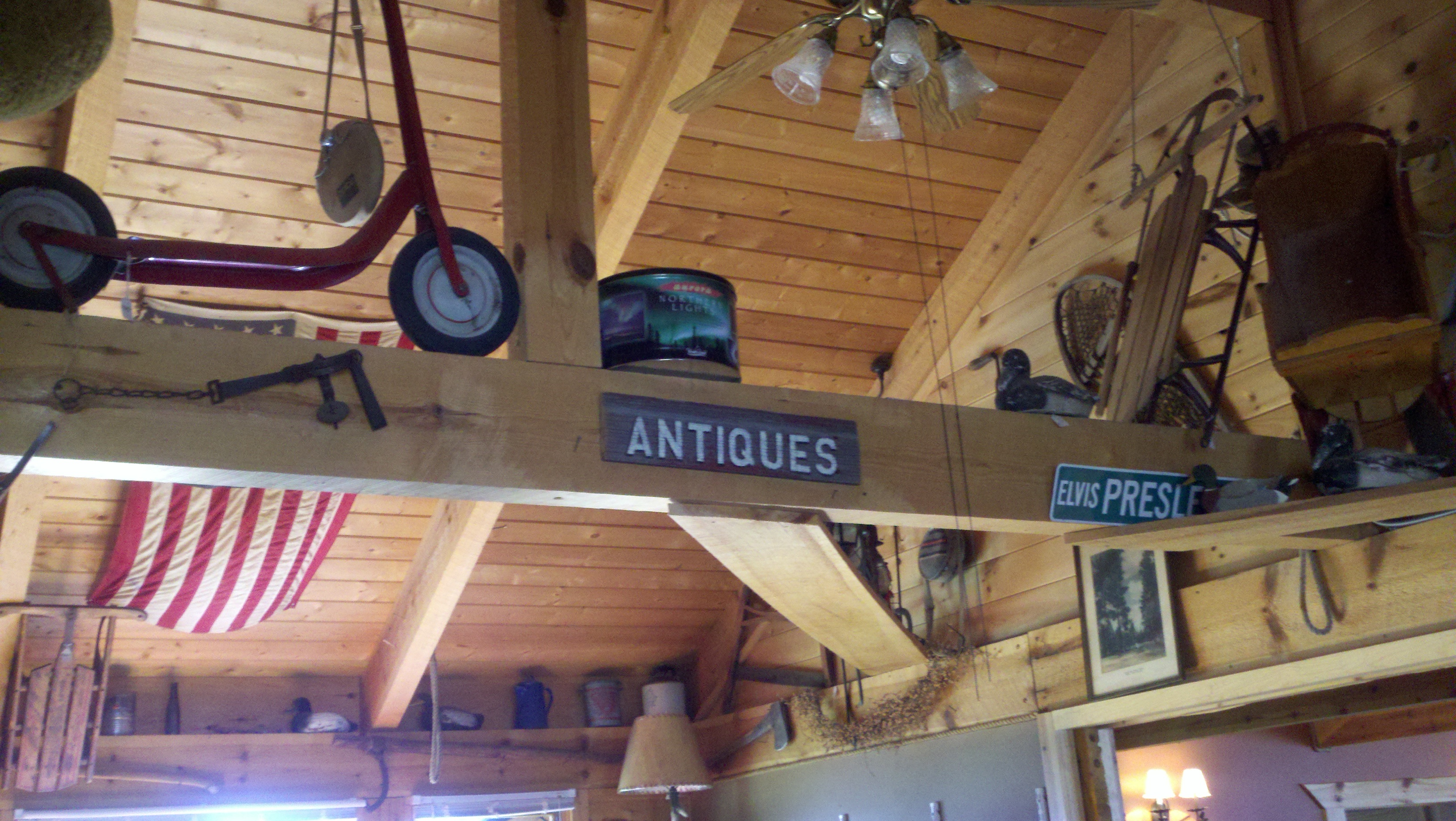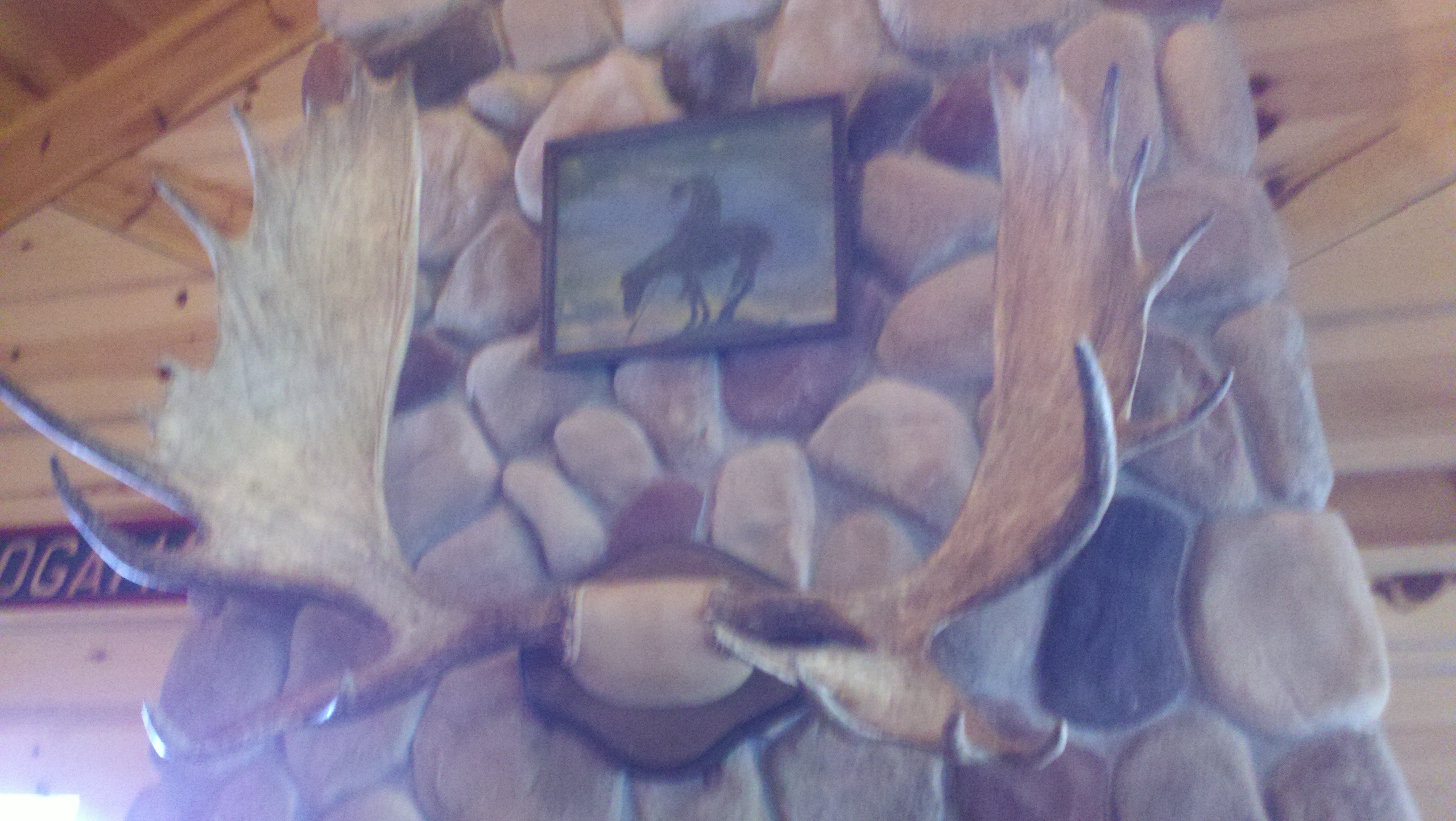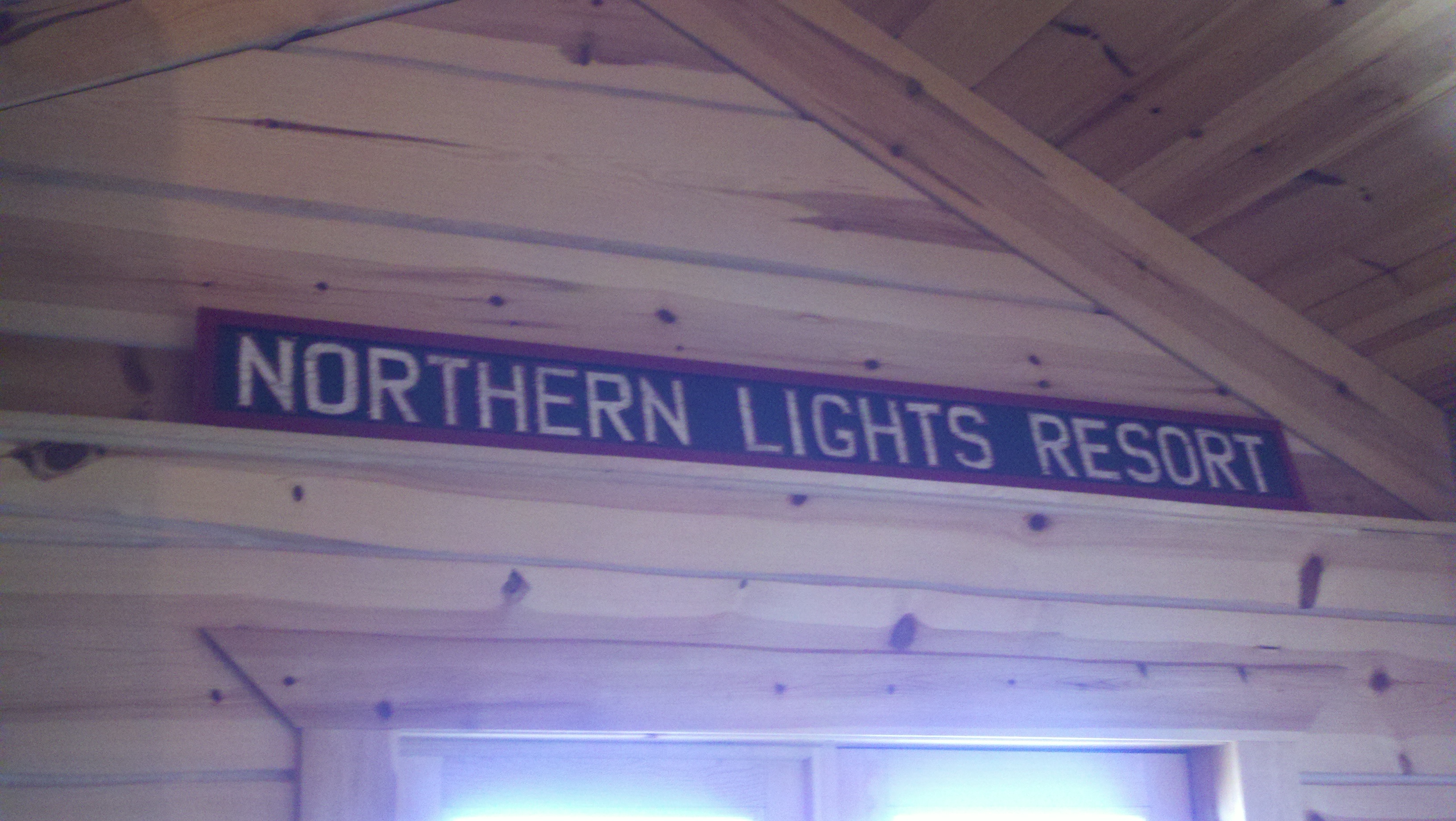 Welcome to The Lodge at Northern Lights Resort!I didn’t even know these were moose antlers, they are huge – I feel fairly sad for the poor moose who has to have those on his head!A sign inside the lodge.The wall of books and movies for the guests to enjoy. The TV is in the front of a boat (you’ll see the rear in a later picture). The view from there is just beautiful but the picture just shows glare!Mr. Moose with his antlers!Even the bathroom in the lodge is cool!This picture does not do the store counter justice. it is beautiful.This is the rear end of the boat. There are goggles, kites and other things for sale in it.Some of the really nice Northern Lights Resort sweatshirts and hoodies for saleMore collectibles on the store rafters!A partial view of the lodge from the store doorwayRight out the back door of the lodge is a huge deck that leads in all directions to the docks. Beautiful place to sit and eat, right next to the water