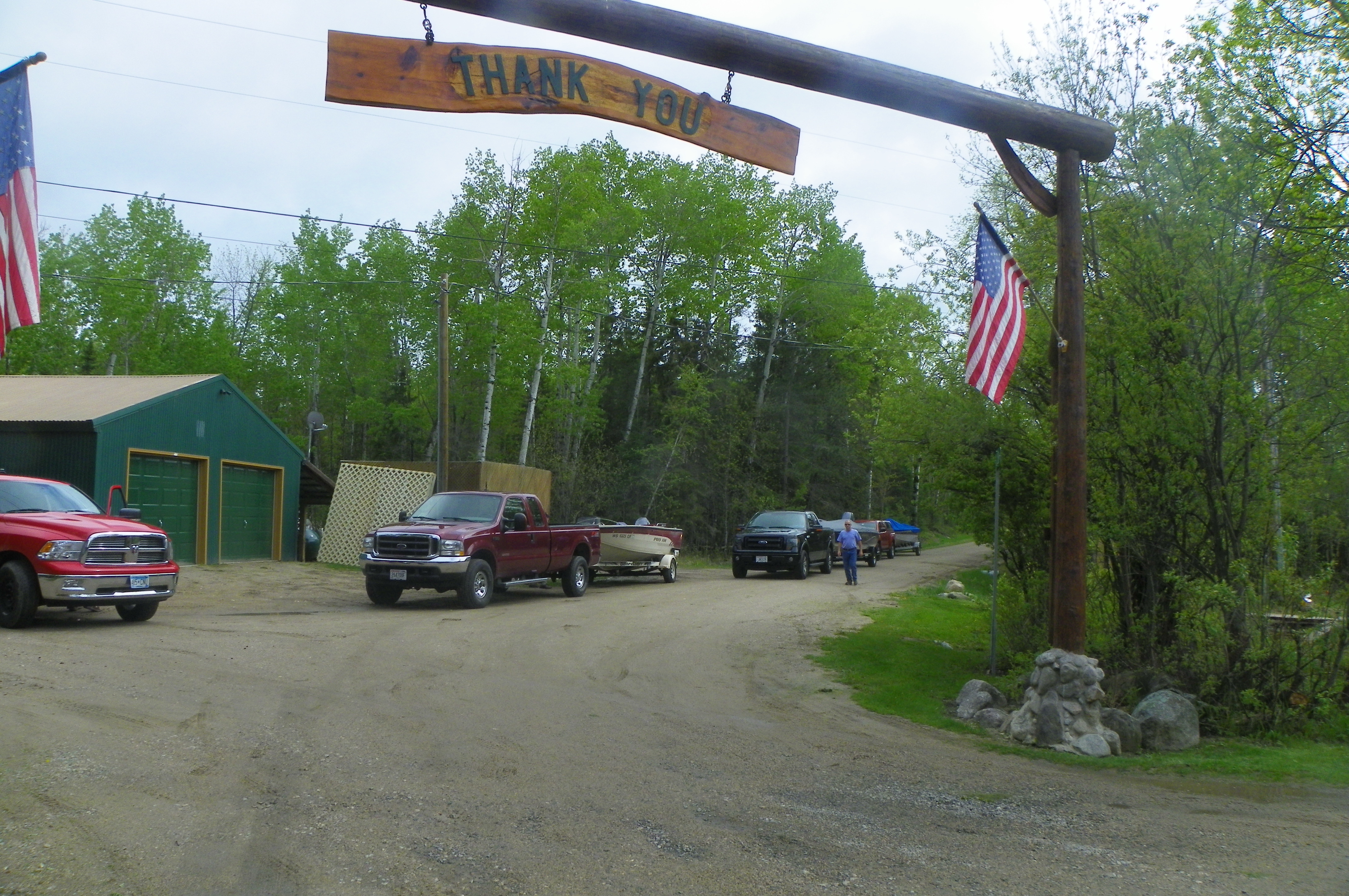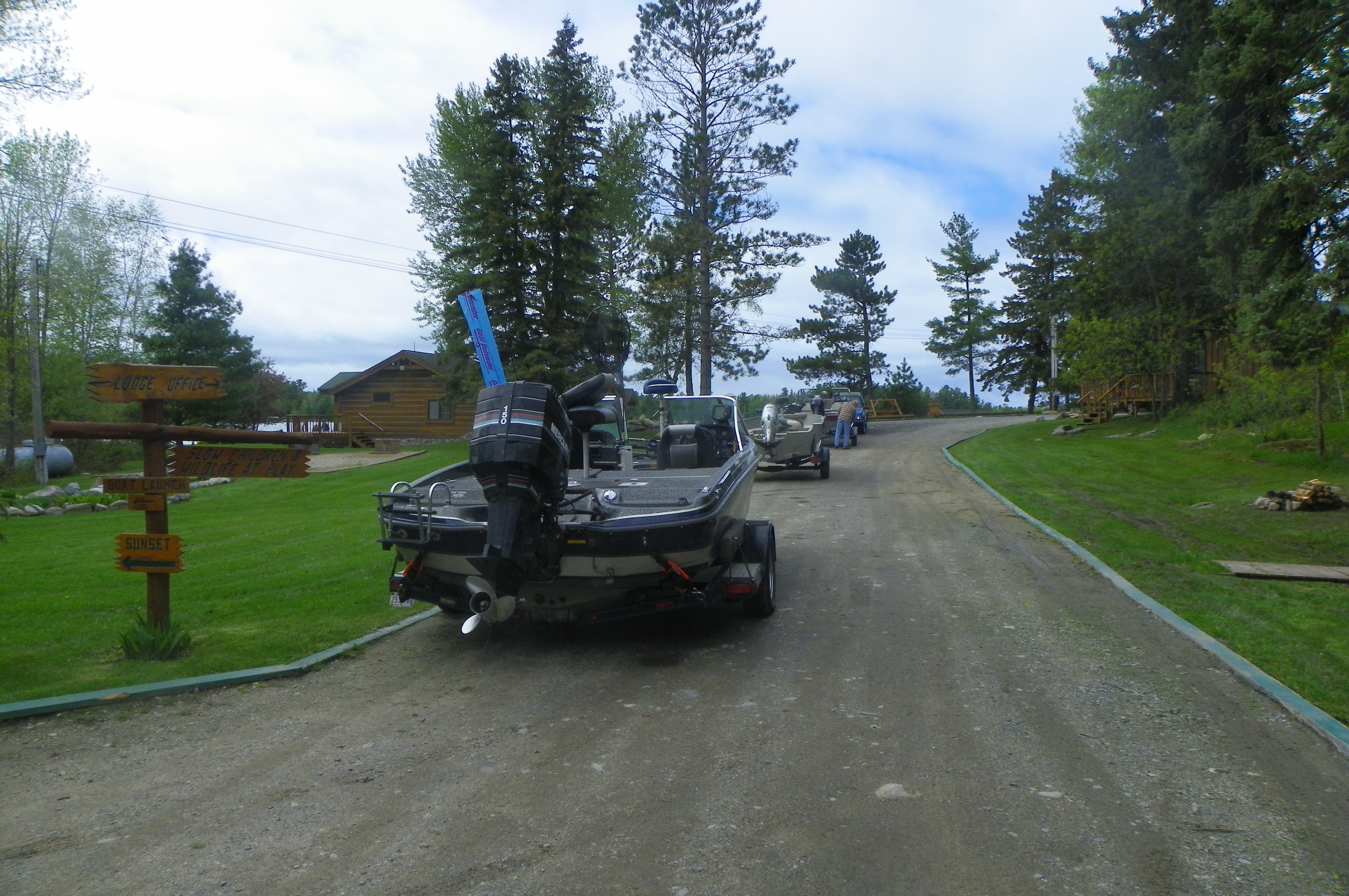 With Saturday came the arrival of guests and for the first time all cabins have occupants. They aren’t allowed to arrive until 4 since we need the whole day until then to clean up inside the cabins and the grounds after the guests depart. None of our motorized vehicles are allowed to run during the guests stay so things are very peaceful here. This means that Saturdays between 8 and 3 everything is running to get it all accomplished. Roy and I finished our morning work between 1 and 2 so we were in our home when they all arrived at 4. There were trucks with boats attached lined up down the road as far as we could see. It was like a boat parade on land. I didn’t get my camera out in time to take a picture of all the boats but here’s a couple of pictures showing some of the parade!