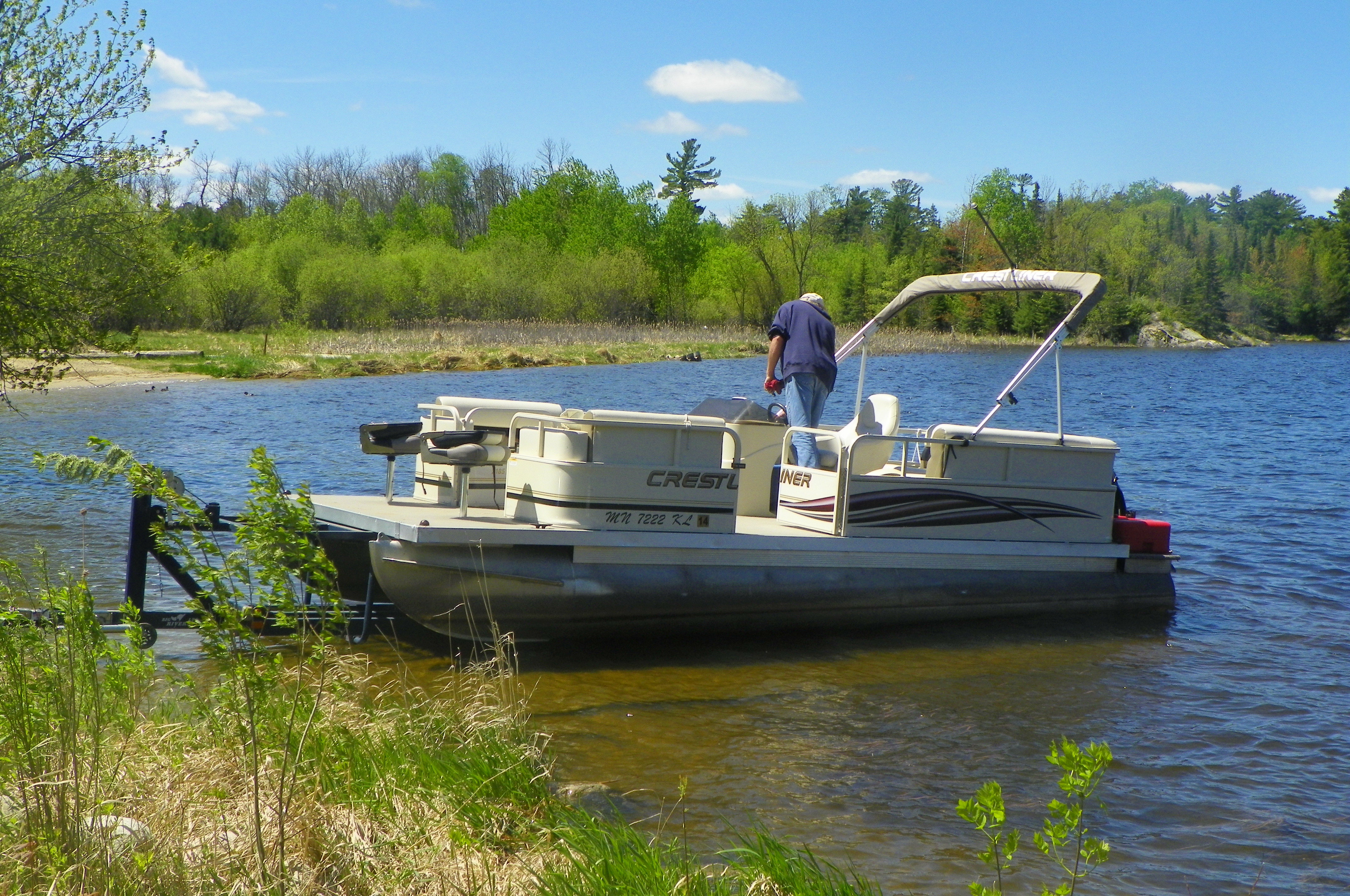 Rick and Jim put one of the pontoon boats (party barge) into the water today. That’s what I want to get out in the lake in. There are four pictures of this starting with them going in front of our RVs with it and then getting it into the water. They have exercise bike’s that go out in the water too but I’m waiting for some warmer water before trying that, just in case I fall in. It was 31 last night and is predicted to be 32 degrees tonight. Crazy June weather. Our grass seed is starting to come up and before long we’ll have a real lawn to play in!