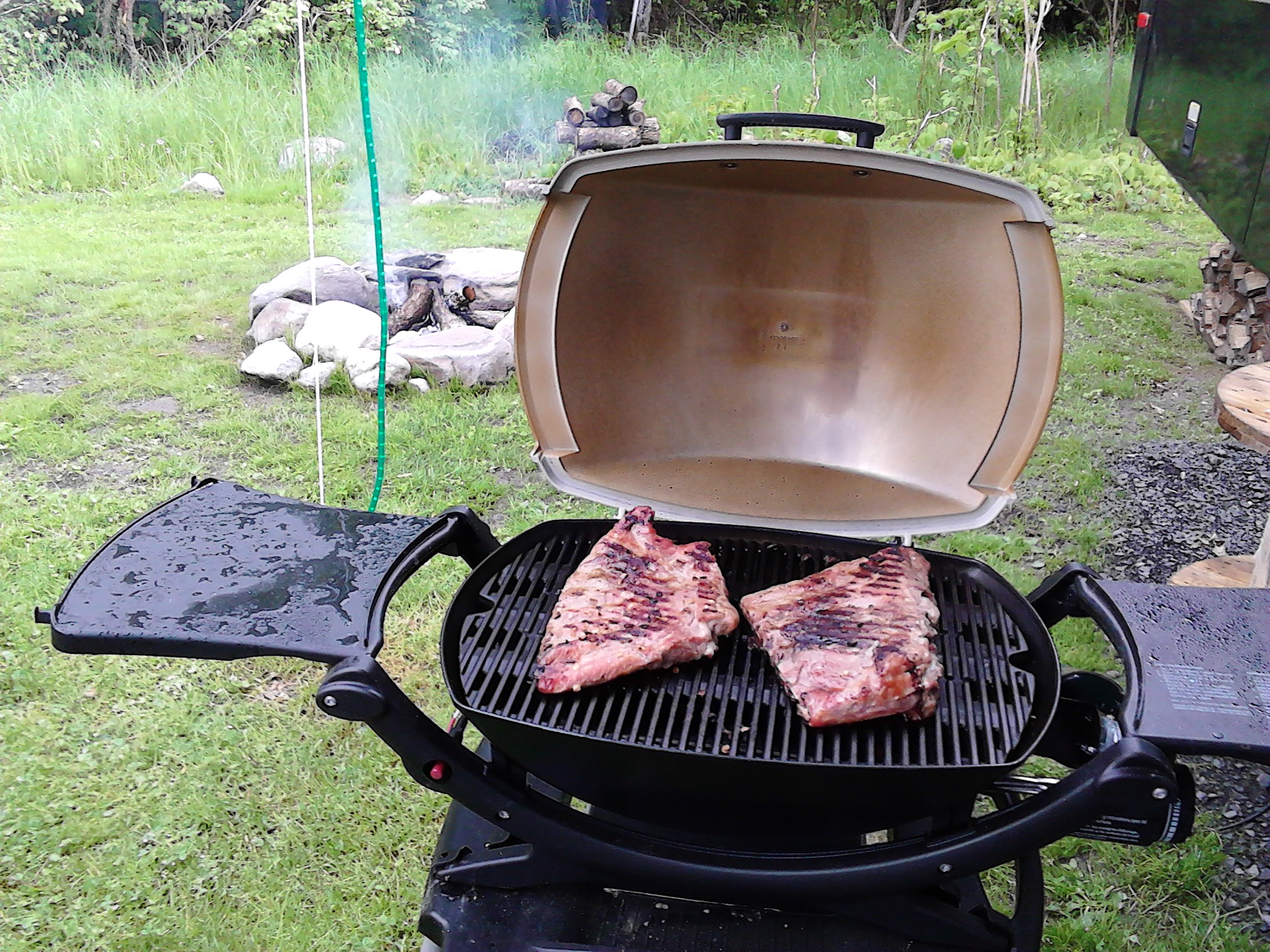 and use the rudder to guide yourself. We wore life vests for safety! We went out pretty far and just let the waves and wind take us where it wanted to go out there before heading back. Good exercise too and it was fun to feel like two kids! We barbequed some pork ribs after our ride. They were parting gifts from Russ and Annie and they were sure delicious!