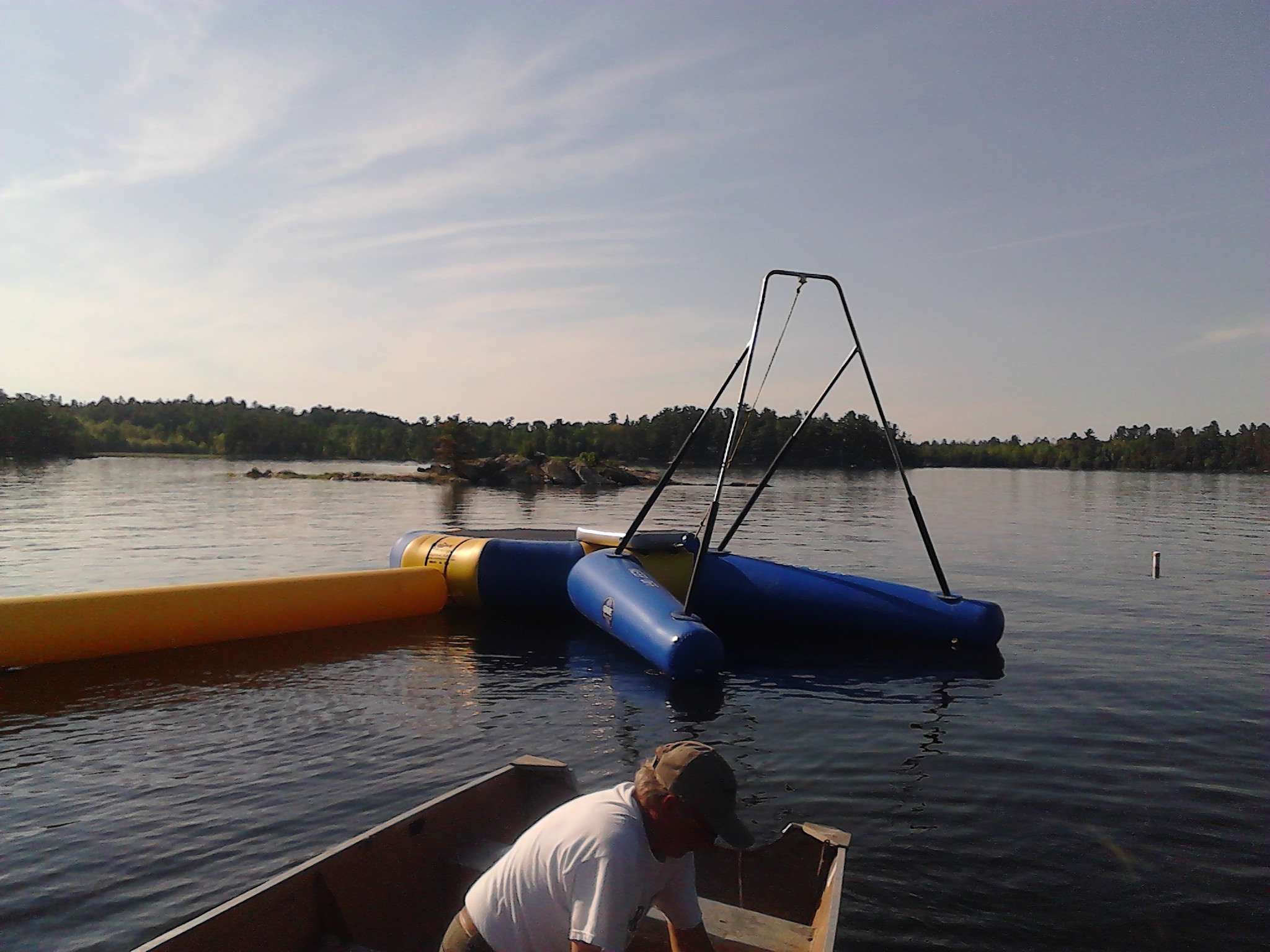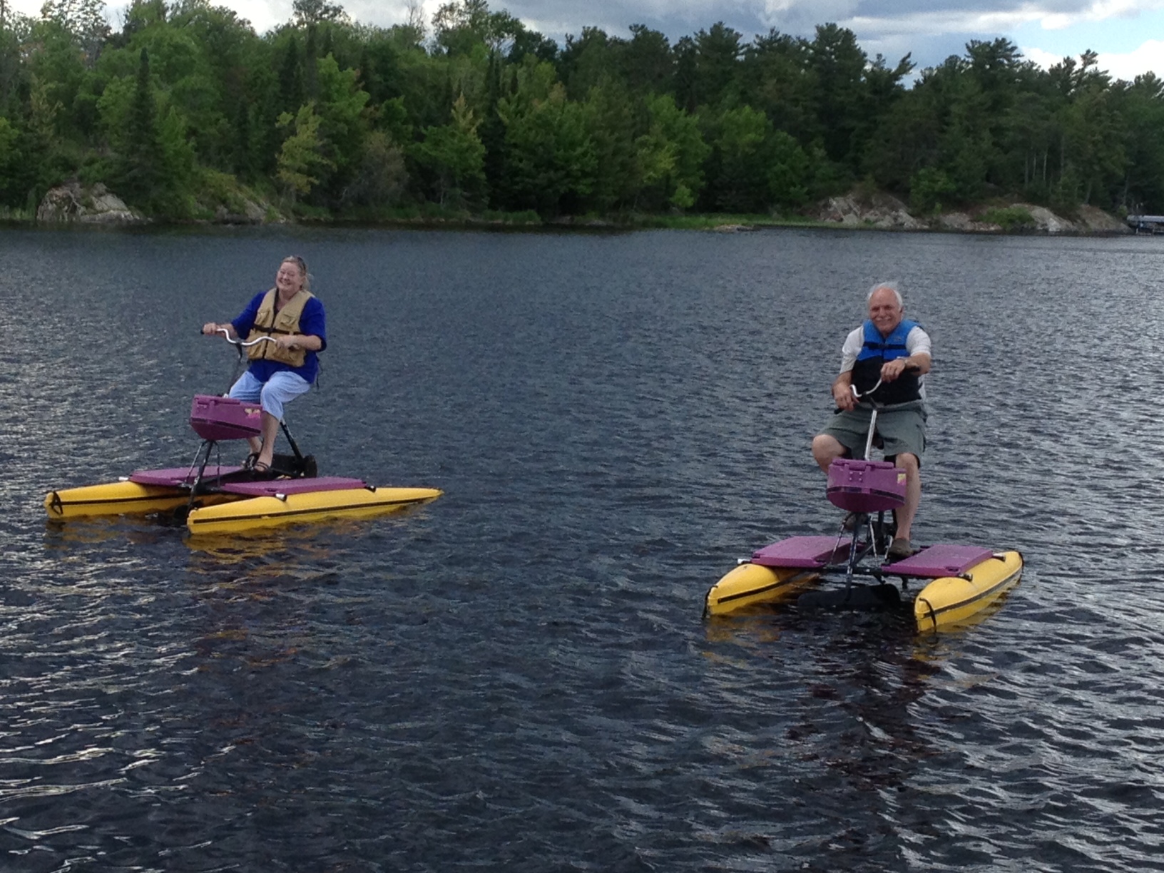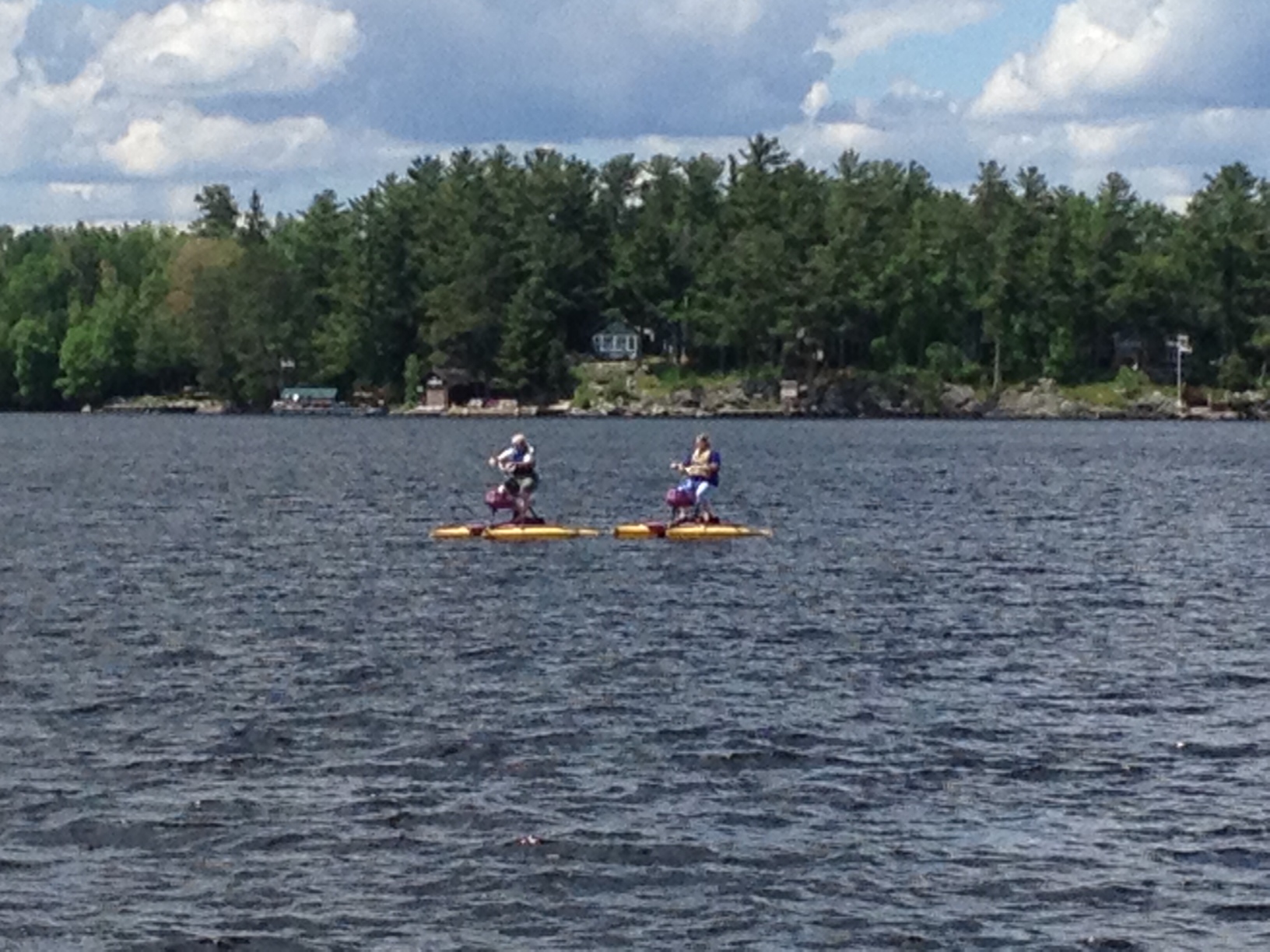 Roy and I just got back from riding around the lake on two hydro-bikes (see the pictures). Very cool bikes on two floatation things that you pedal where you want to go