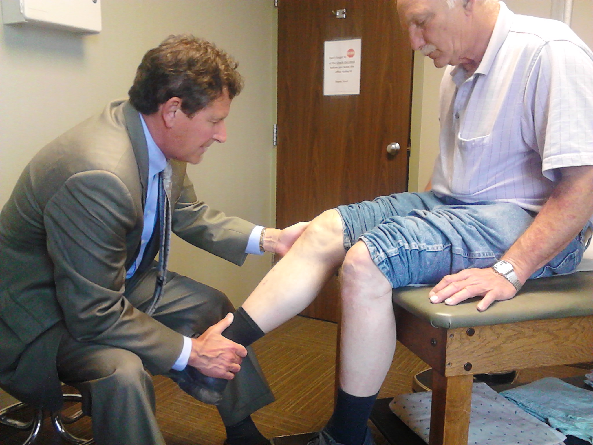 We got to the waiting room at 3:00 and were in to see the examination room at 3:02. The nurse did her thing, they took Roy to have his knee x-rayed, and the doctor came in shortly thereafter. I don’t remember having a doctor come in wearing a suit before but Dr. William Schnell did. He looked just like a TV doctor would, handsome, tanned and extremely nice. Roy gave him his medical history concerning his knee and the recent pain he’s having since he stands up so much at work now. Roy was previously told he needs a knee replacement but until now it hasn’t given him the pain he’s experiencing. The doctor agreed with that but since he can’t have surgery right now he gave him a cortisone shot which should help the pain for the remainder of the time he’s here. He even let me take a picture of him examining Roy’s knee. After the shot, while we were leaving, he told us about a hole in the wall store outside of Orr, MN on Highway 53 called Cold Springs where they make delicious pastries. We’re going to make a day trip to Orr on one of our days off and we know for sure we’ll stop at Cold Springs. In total we were at the doctor’s office 45 minutes and that included the x ray and cortisone shot. On our way out Dr. Schnell showed us Roy’s x-ray. Roy’s top and bottom bones on the inside of his right knee are rubbing on each other. The other knee and the other side of the right knee are fine, thank goodness! Roy liked this doctor so much he’s thinking about having the knee replacement done by him but we don’t know how we’d work out the logistics of him being laid up here. Time will tell!