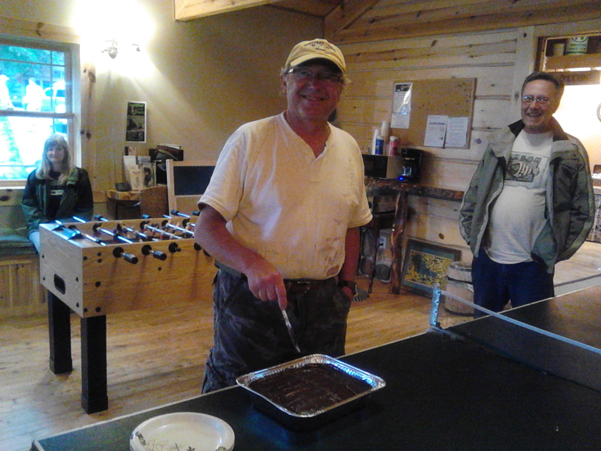 Friday night we celebrated Tom’s birthday with a chocolate cake baked by Debbie. We all gathered in the Lodge for this and really enjoyed the cake! Hope you have many more Happy Birthdays Tom! The man behind Tom is Russ, the man who was Pastor Roger’s best man.