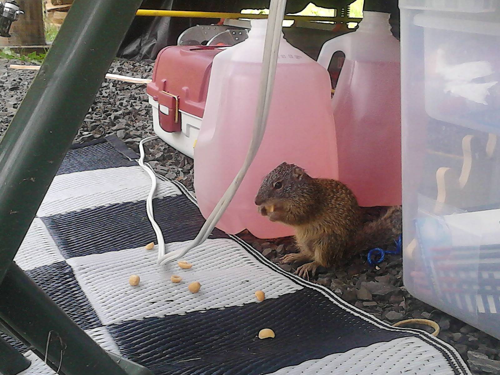 I’ve shared with ya’ll about the chipmunks who live here at the resort. Well there are a couple that visit our RV quite often and like to play around our feet. Yesterday I was outside reading with my shoes off and I felt something tickling the bottom of my feet, when I looked down there was one of the chipmunks nibbling at my foot. As soon as I jumped he scurried off. That shows how friendly they are. Last week one day Roy and I were sitting outside and Roy put a few peanuts on the ground and sure enough two squirrels came to visit. They weren’t quite friendly enough to come up close but we did get pictures of one of them nibbling away at his treat.