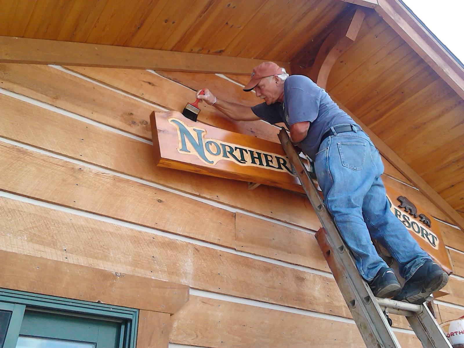 Before we close down the resort for the winter the exterior walls on the lodge and all of the decking around each cabin and the lodge need to be re-stained.  Roy started today on the lodge and worked several hours on this.