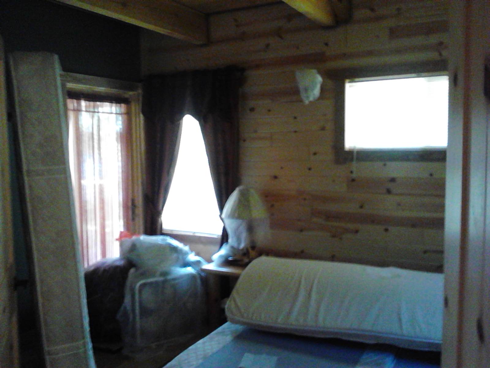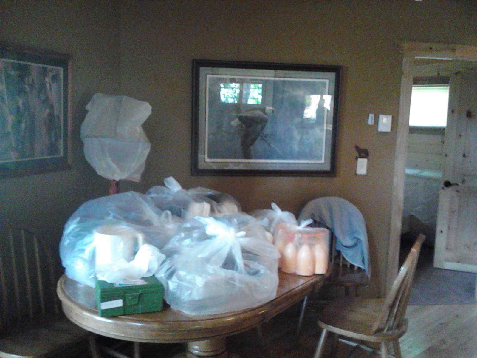 All lamps, TVs and moose/deer antlers are covered with plastic bags. Every electrical thing including refrigerators is unplugged and opened. All decorations are taken down (which includes the forest of pine cones on top of the cabinets) and bagged. All the blinds are closed and windows locked. Any window that doesn’t have blinds gets a sheet over it.