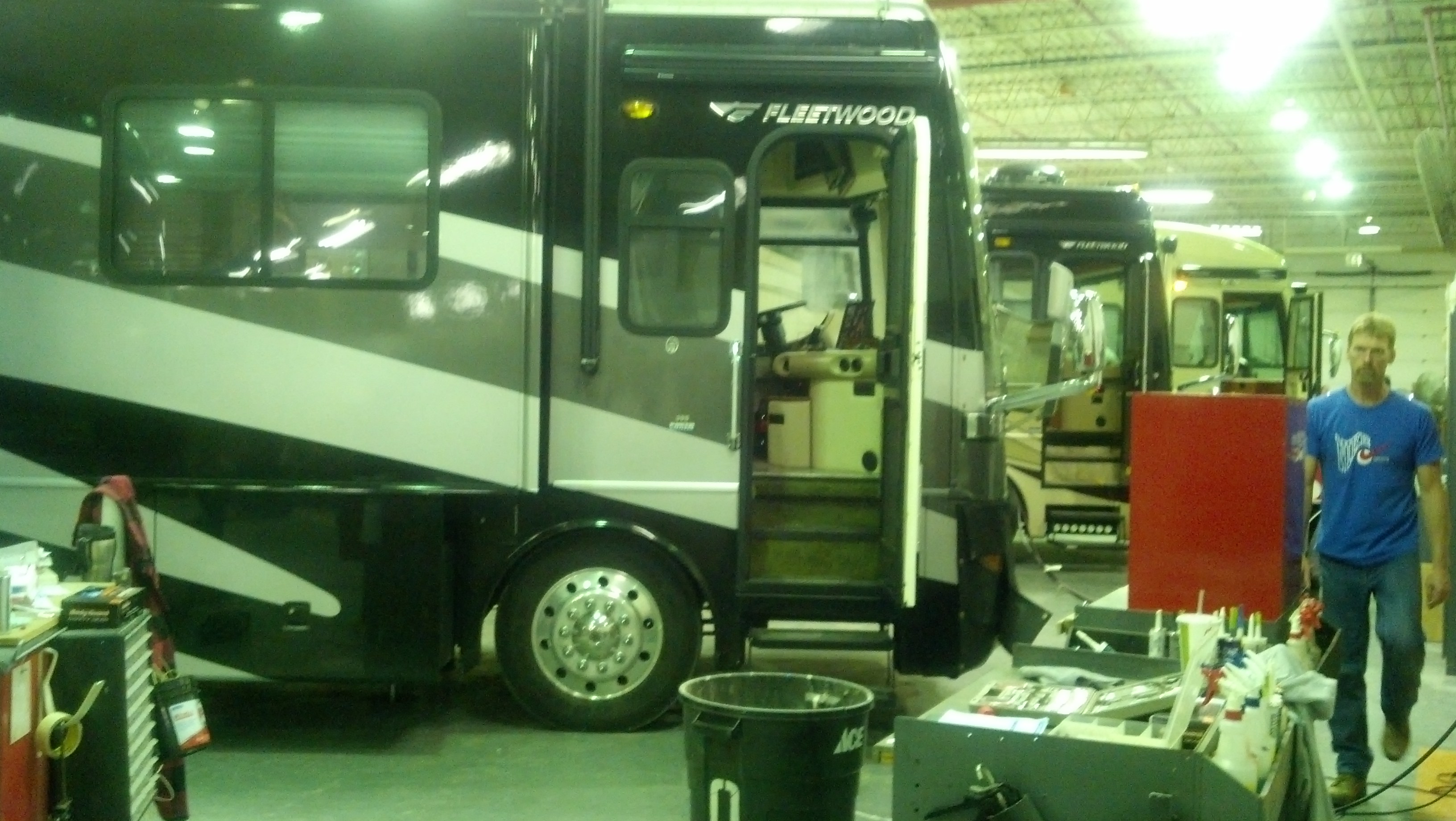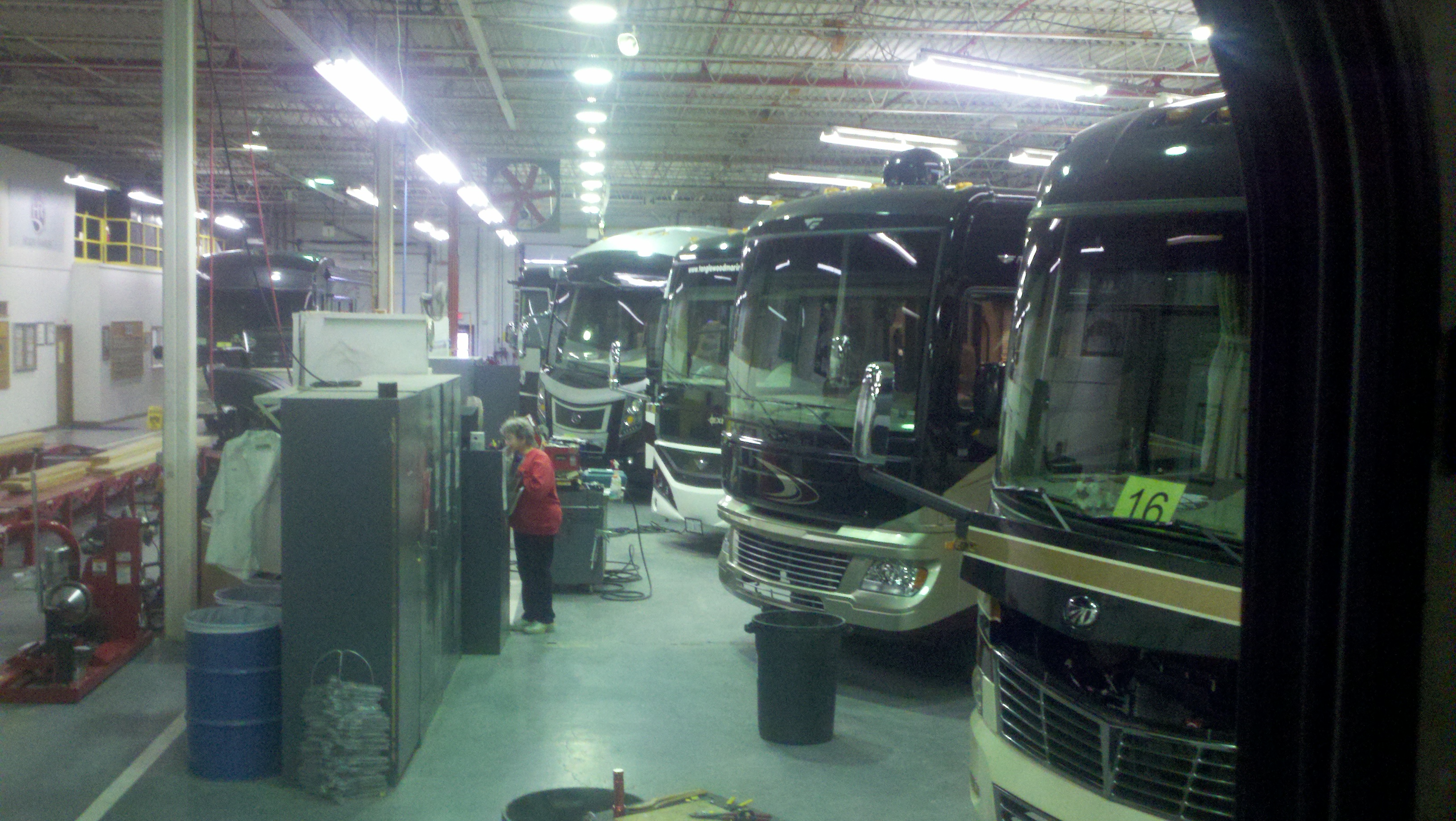 Looking out of Dora’s door inside the maintenance garage with about 25 other RVs