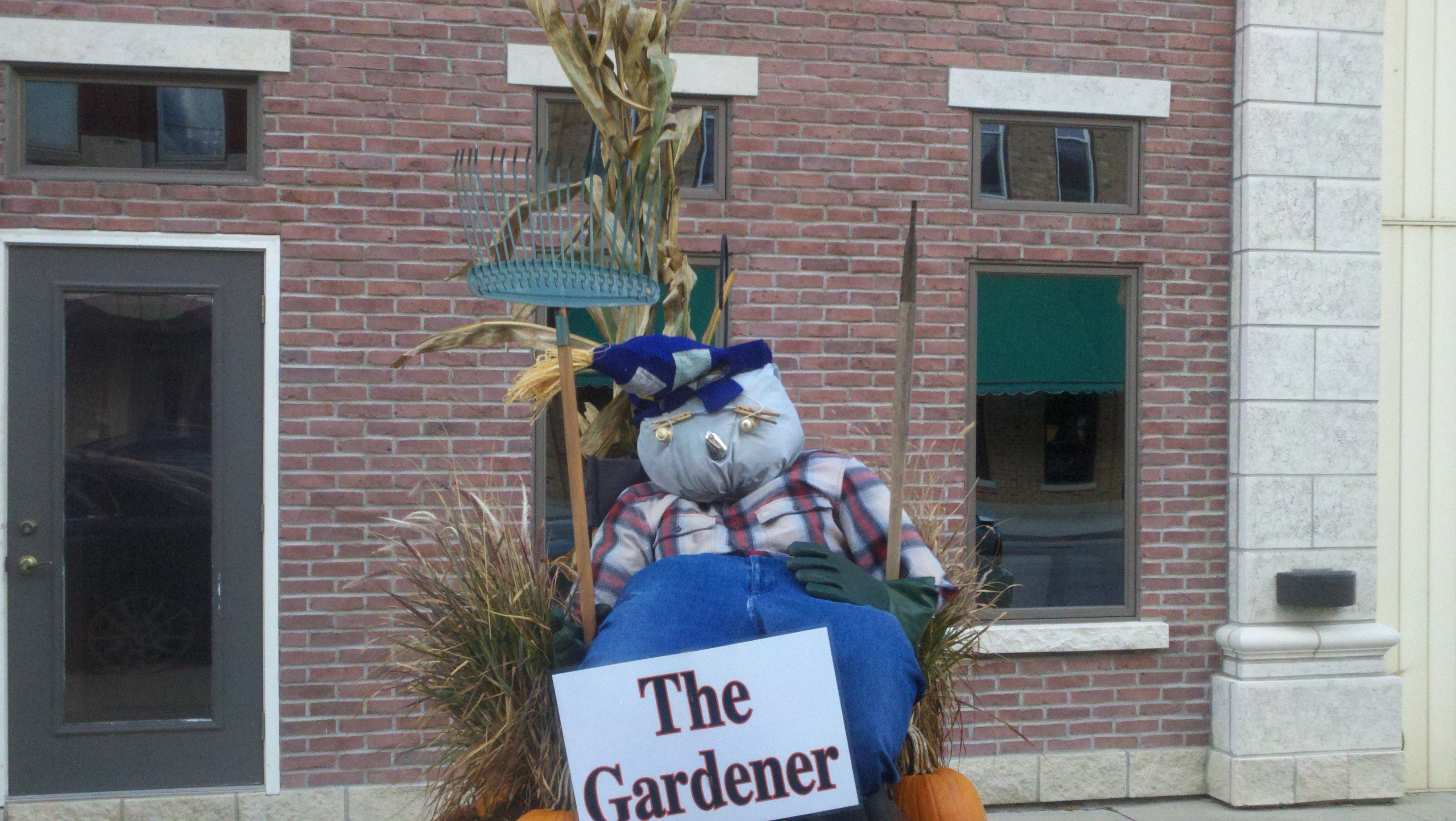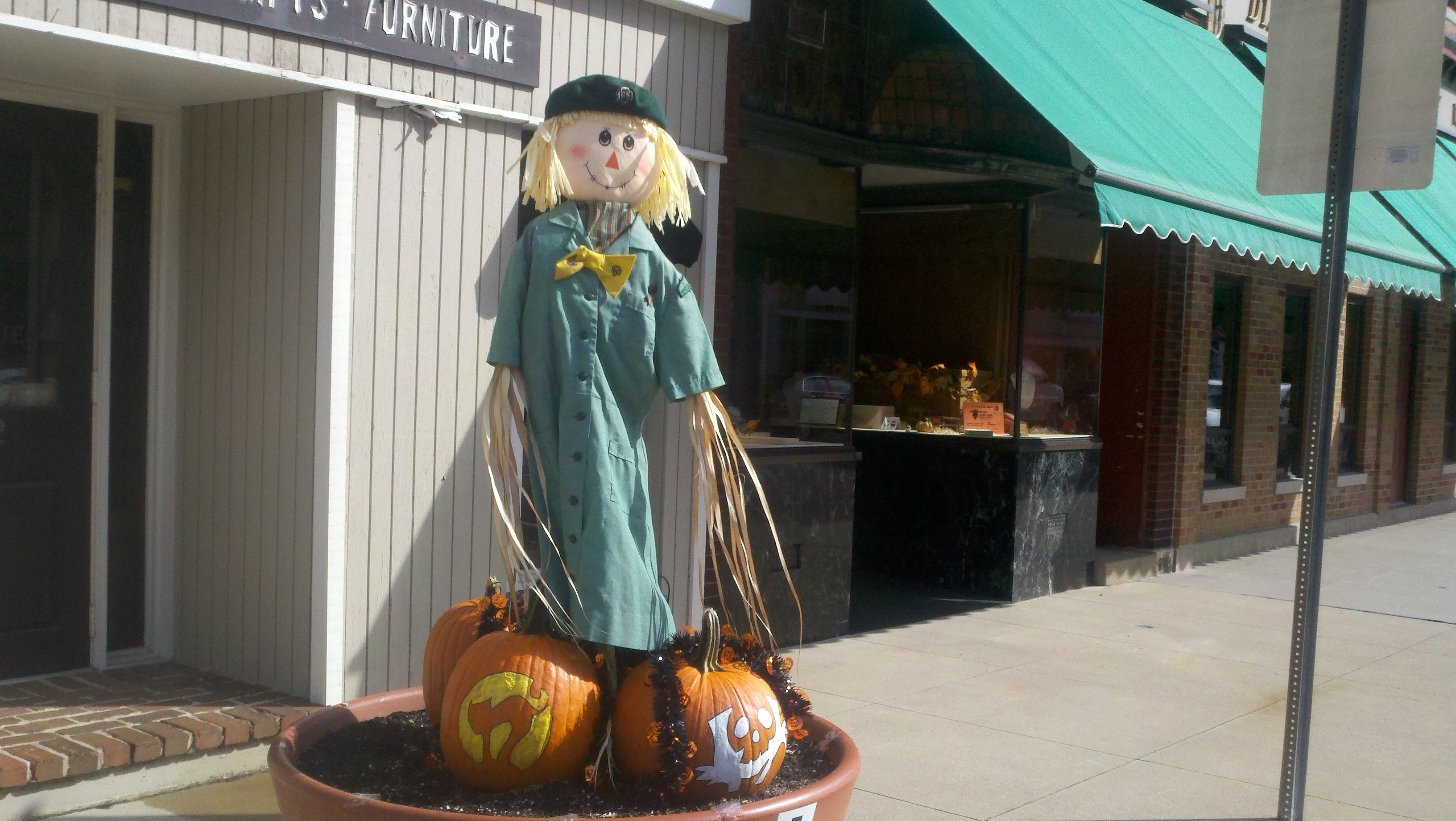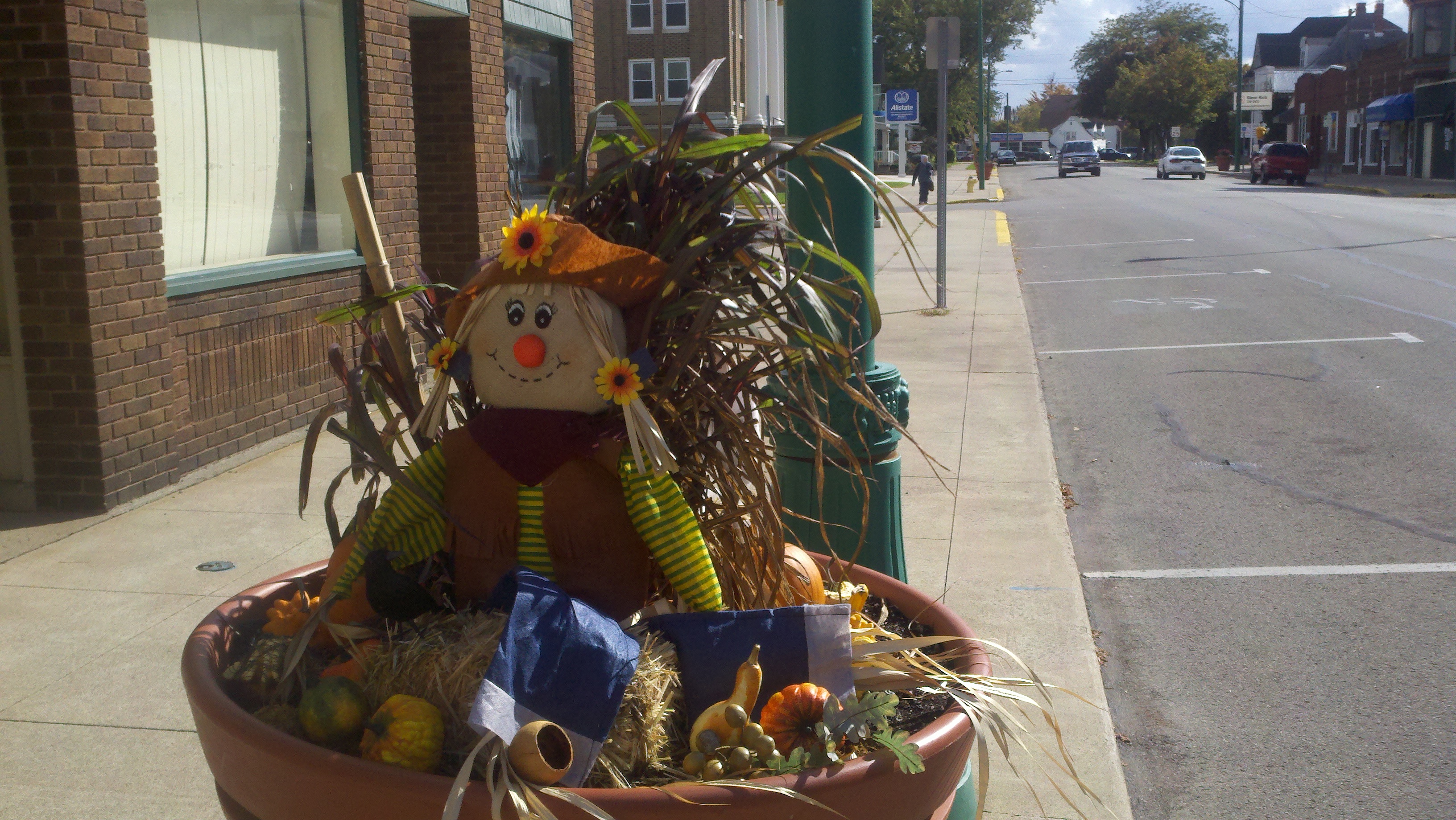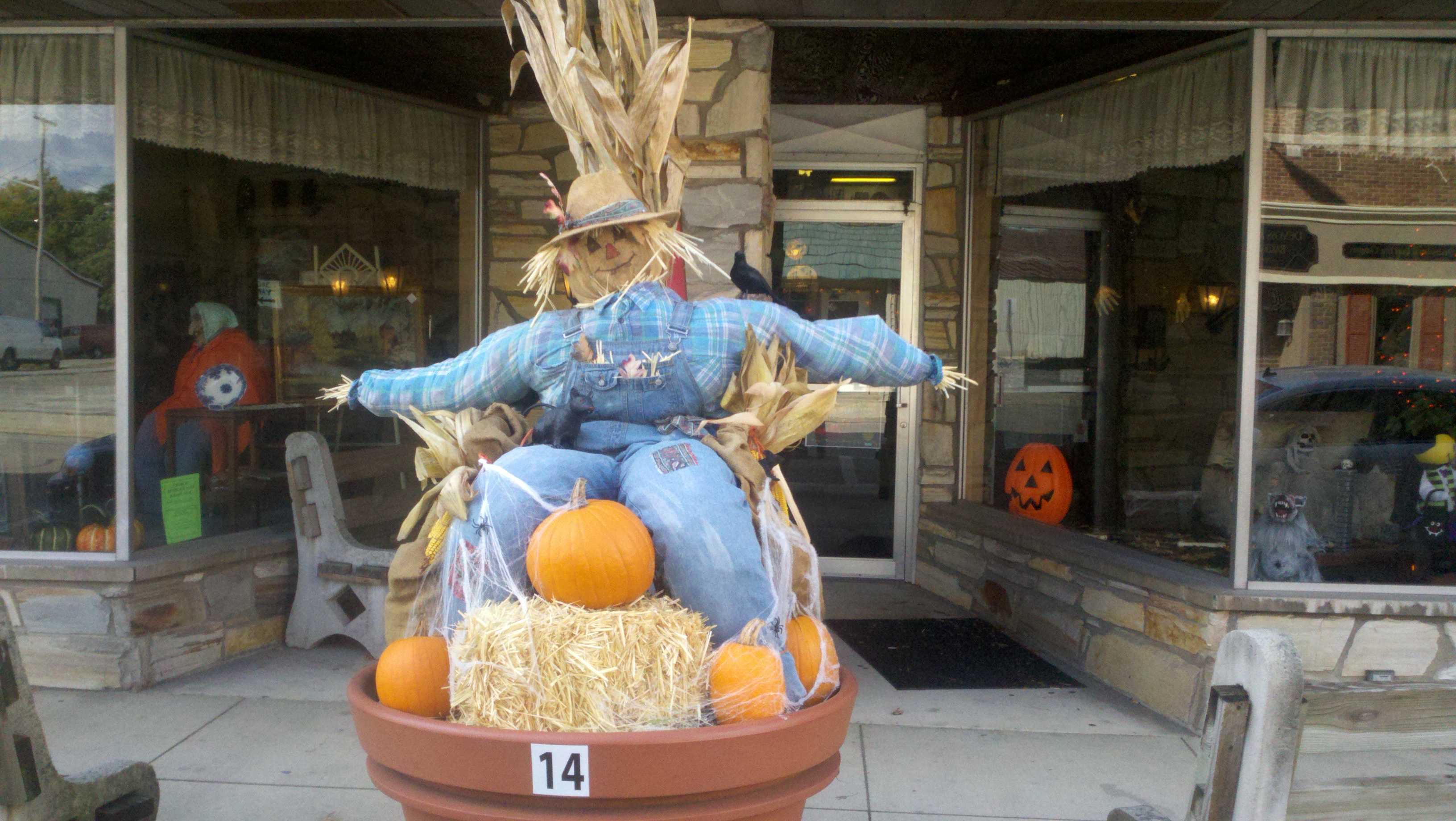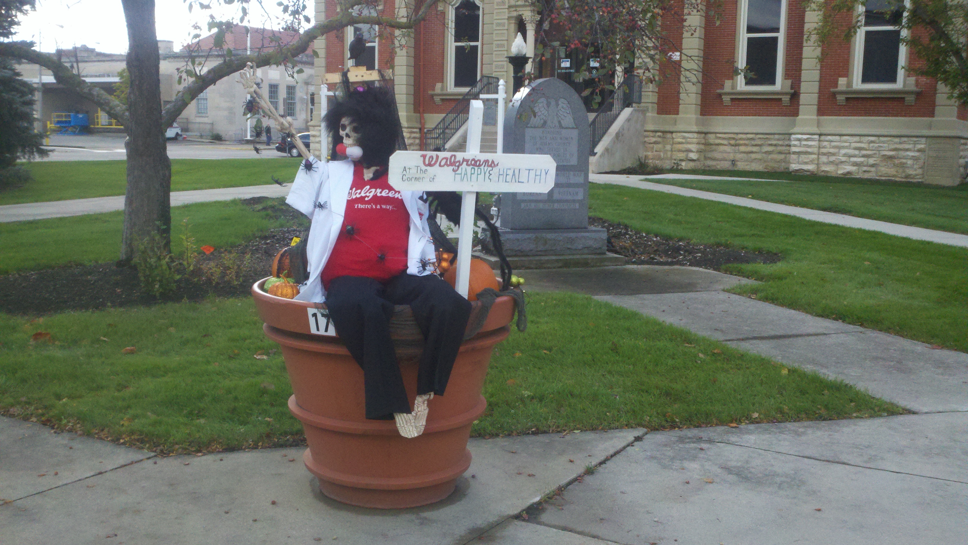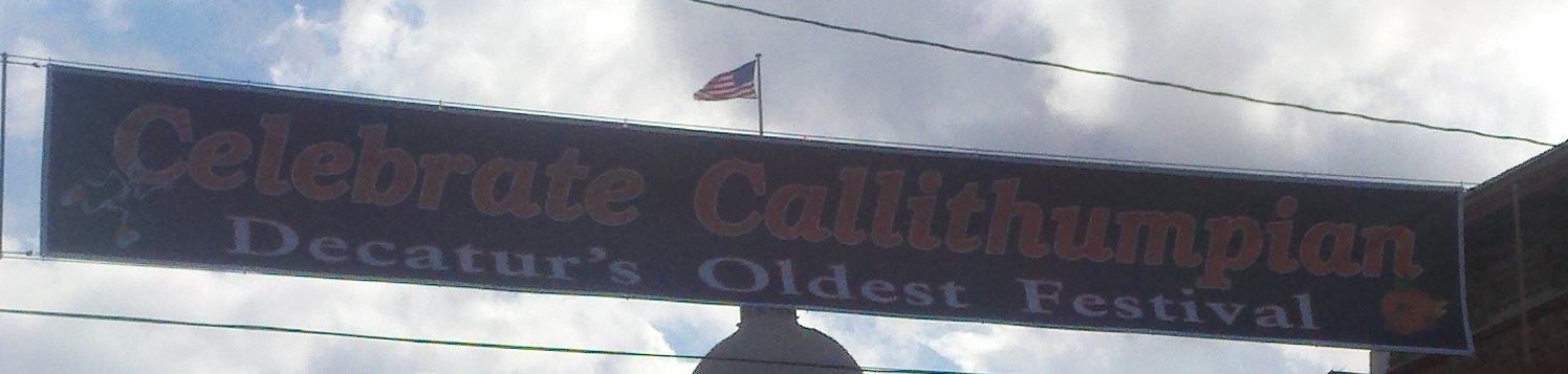 The weather has been wet, windy and cold this week which made us not want to get out too much. Saturday afternoon the sun came out and it wasn’t raining but was still windy. We decided we needed to get out and enjoy the day so we went to see some of downtown Decatur. What a nice surprise it was to find a really neat town. There are several sculptures at various spots downtown and due to the Fall season there are many big planter pots decorated by a company, group or organization about 3-4 per block. I found out that the city is decorated getting ready for the Callithumpian parade later this month. The folks here vote on their favorite decorated pot and the top three win a prize during the Callithumpian festival. I have no idea what Callithumpian means but they have a sign hung over the main street announcing it!