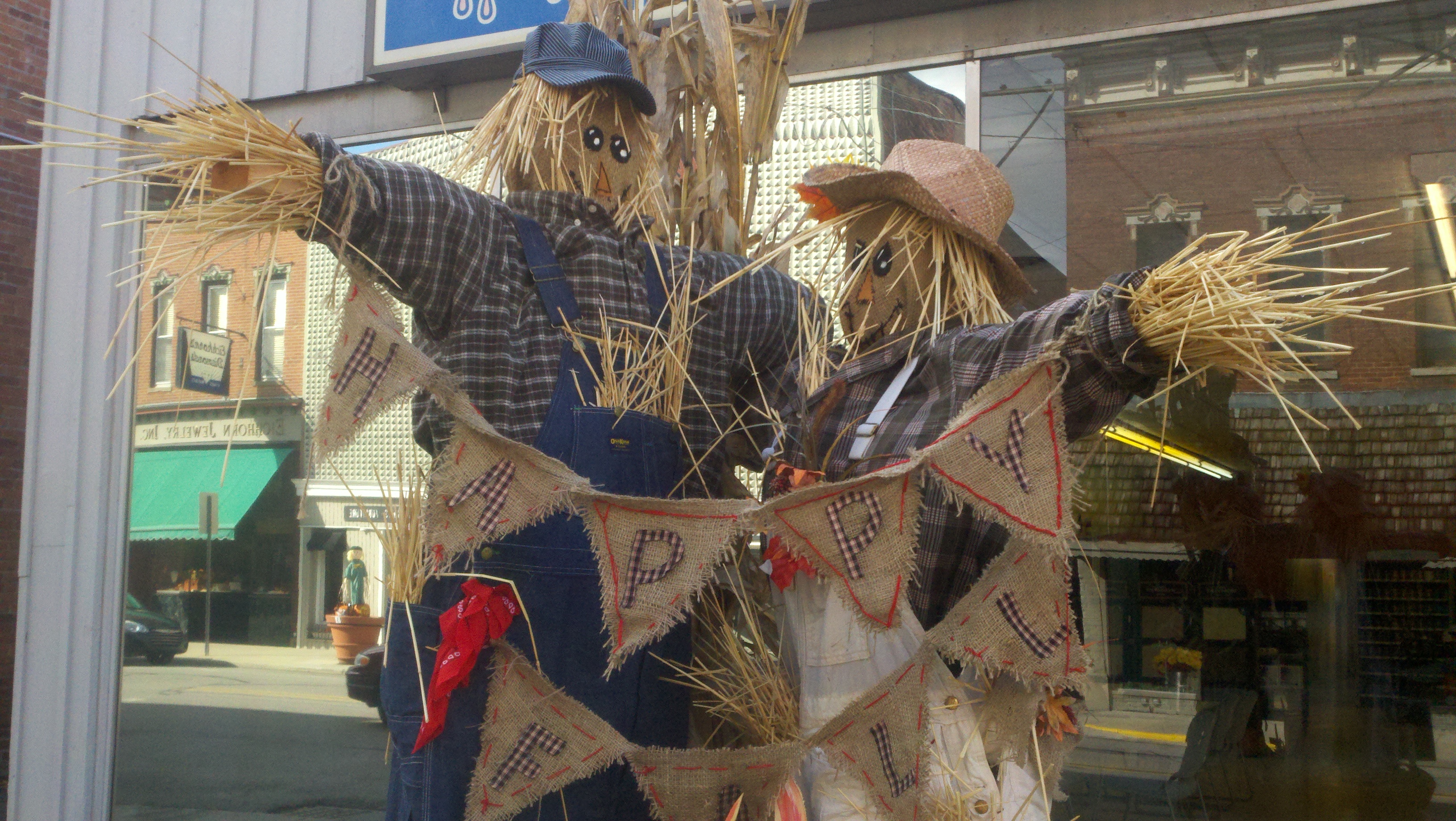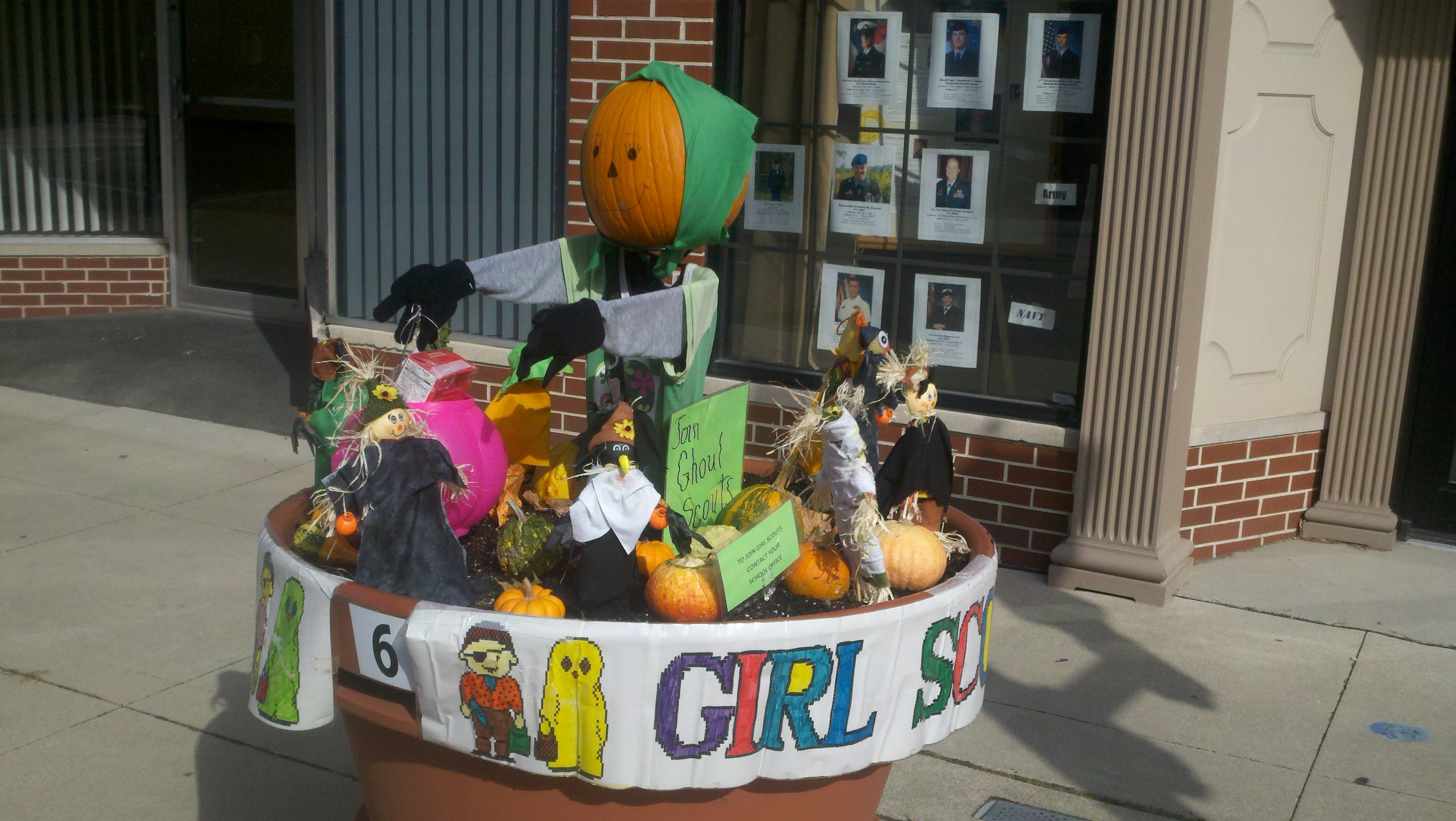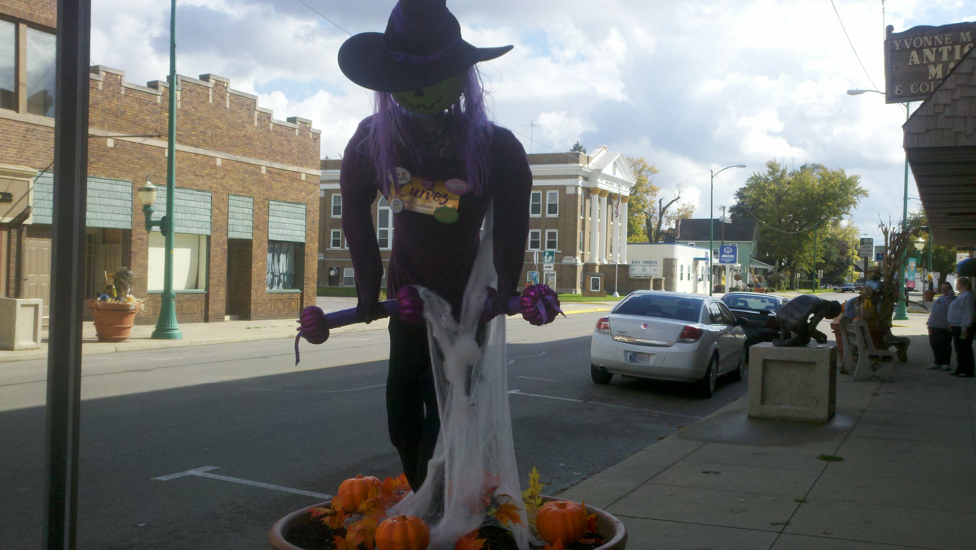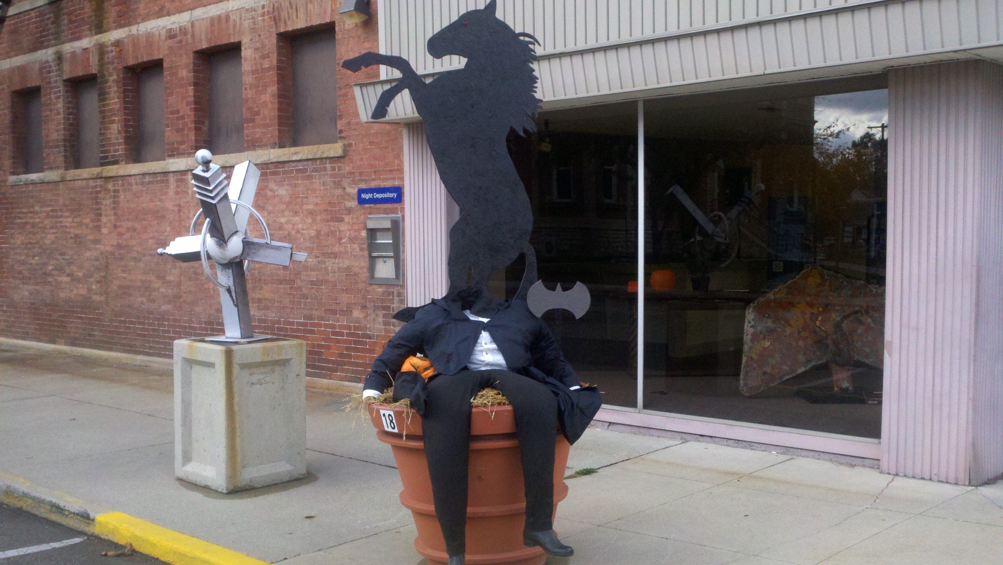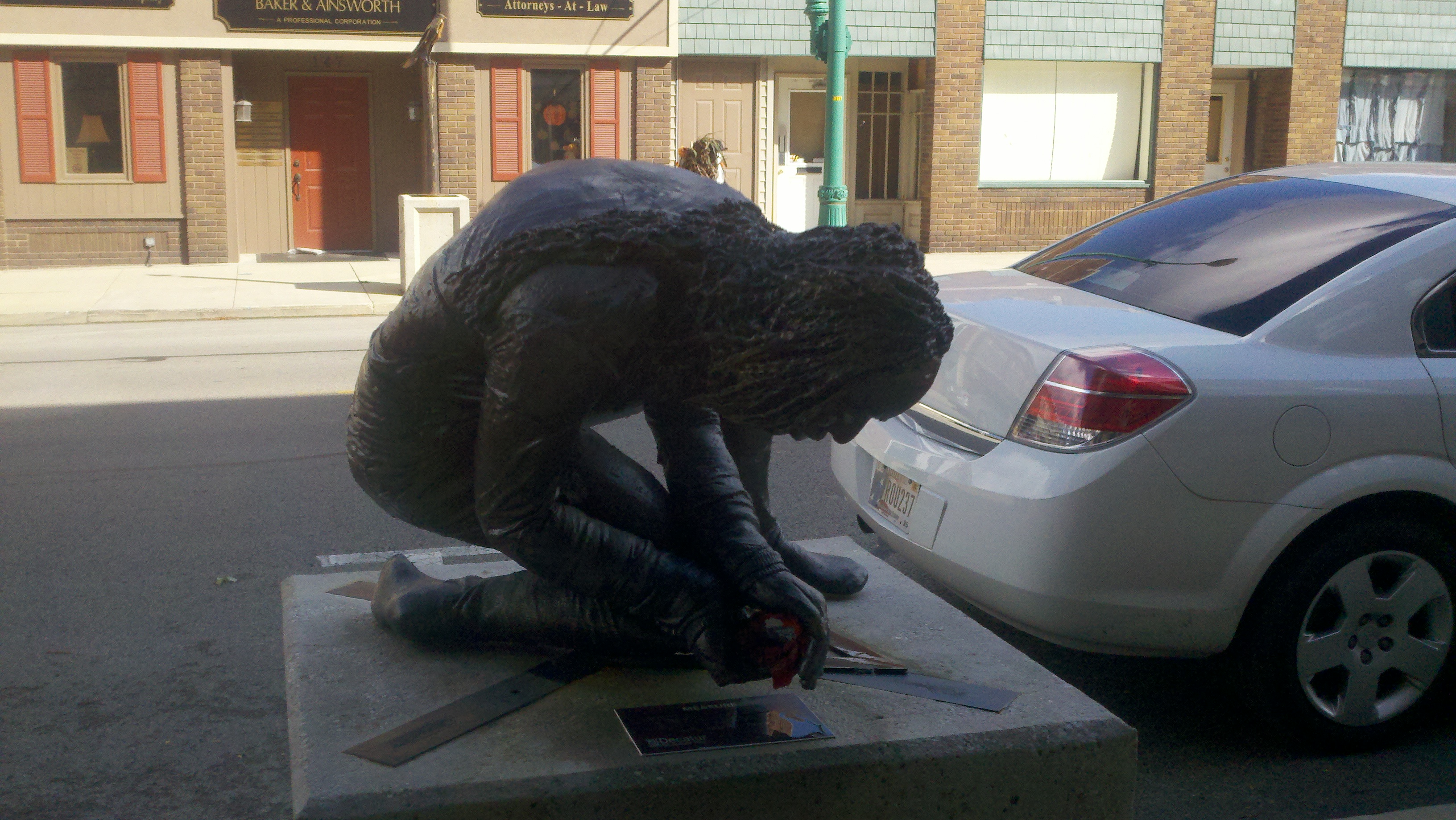 The weather has been wet, windy and cold this week which made us not want to get out too much. Saturday afternoon the sun came out and it wasn’t raining but was still windy. We decided we needed to get out and enjoy the day so we went to see some of downtown Decatur. What a nice surprise it was to find a really neat town. There are several sculptures at various spots downtown and due to the Fall season there are many big planter pots decorated by a company, group or organization about 3-4 per block. I found out that the city is decorated getting ready for the Callithumpian parade later this month. The folks here vote on their favorite decorated pot and the top three win a prize during the Callithumpian festival. I have no idea what Callithumpian means but they have a sign hung over the main street announcing it!