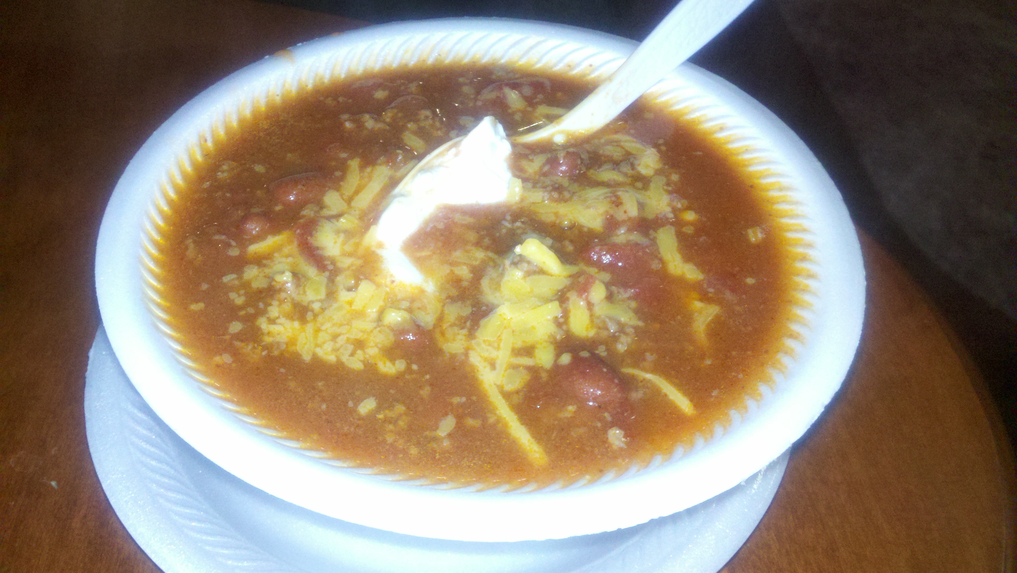 Just finished fixin’ the chili and eating a bowl of it. It is perfect for a really cold spell like we’re having here. Our son Chip will probably be drooling when he sees the picture I just sent him of our Chili! It’s what I always cooked to welcome Winter to Louisiana. We’re definitely in the midst of winter here so it’s time. Notice the Styrofoam bowl, plate and plastic spoon! All part of RV life at it’s best!