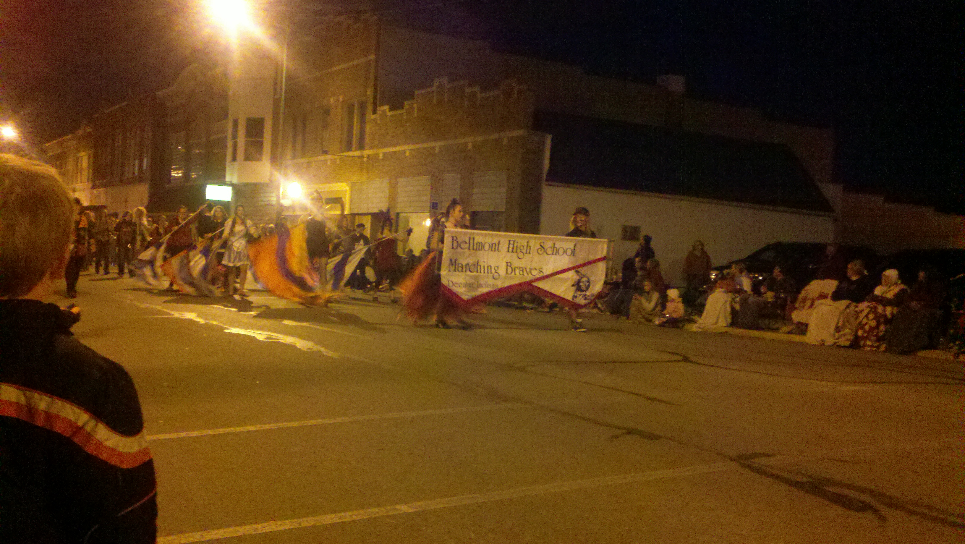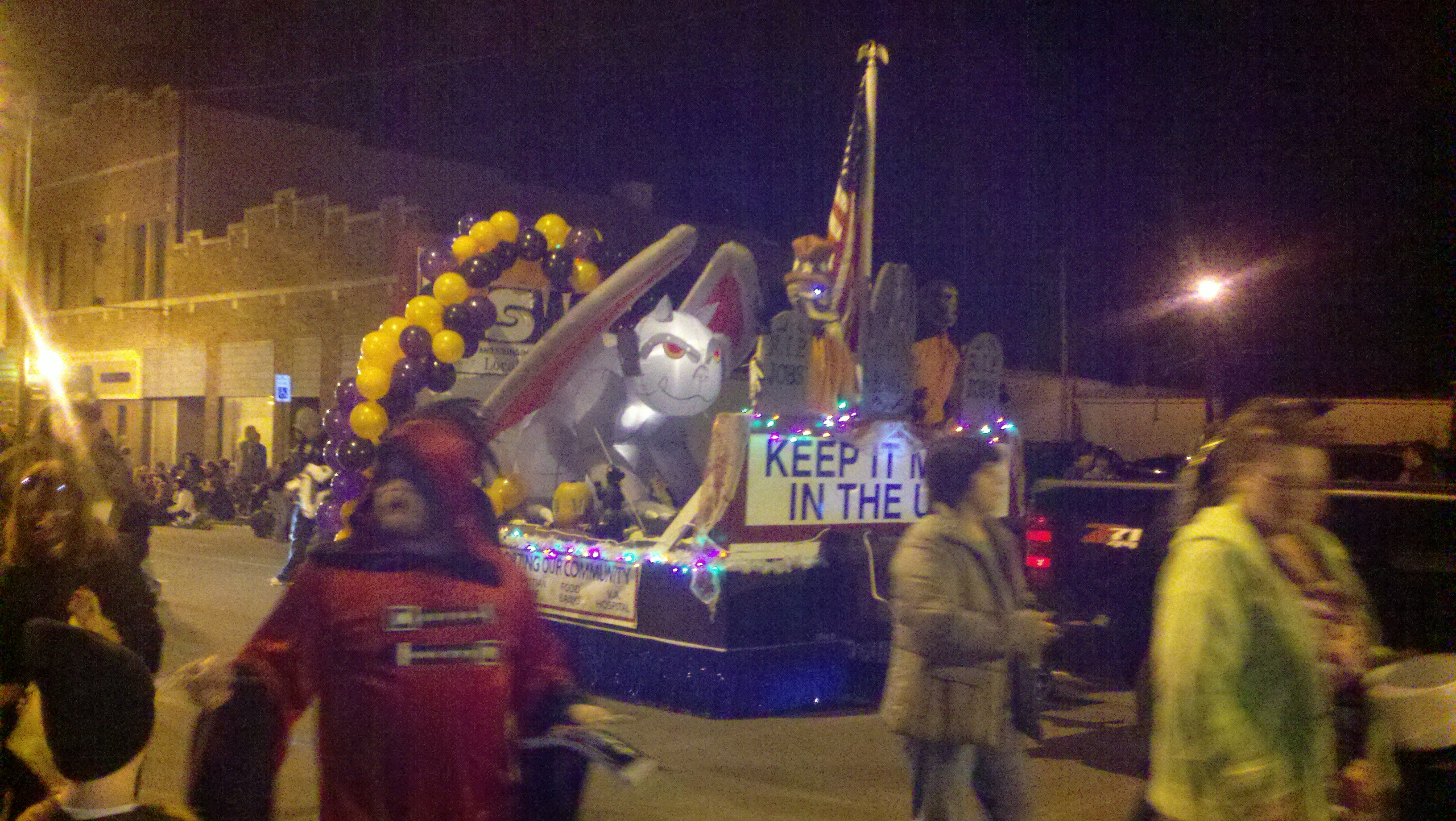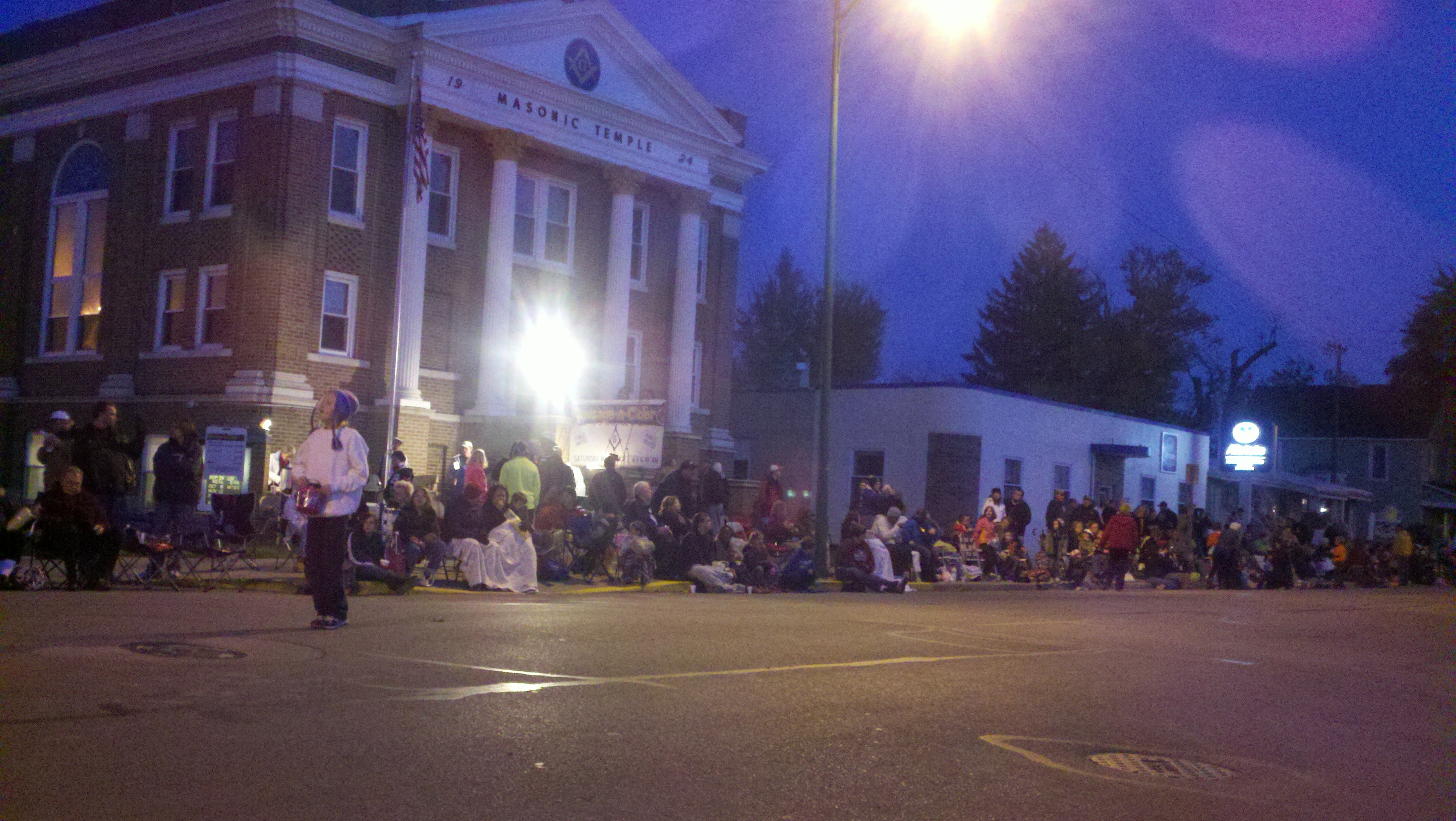 Monday night the town of Decatur held its Callithumpian Parade which we’ve learned just means Noisy Parade. It’s really a Halloween parade with lots of organizations having tents and booths set up selling food for fundraisers. When we arrived the first things we noticed was that all along the parade route through downtown Decatur there were folding chairs along every inch of the parade route on the sidewalks. They were not set up chairs but chairs in their bags just marking their space. We walked around and checked everything out, then went back to the truck and got our chairs and marked our spot! We bought a huge order of nachos with meat and cheese from one of the tents and enjoyed them while waiting for the parade.