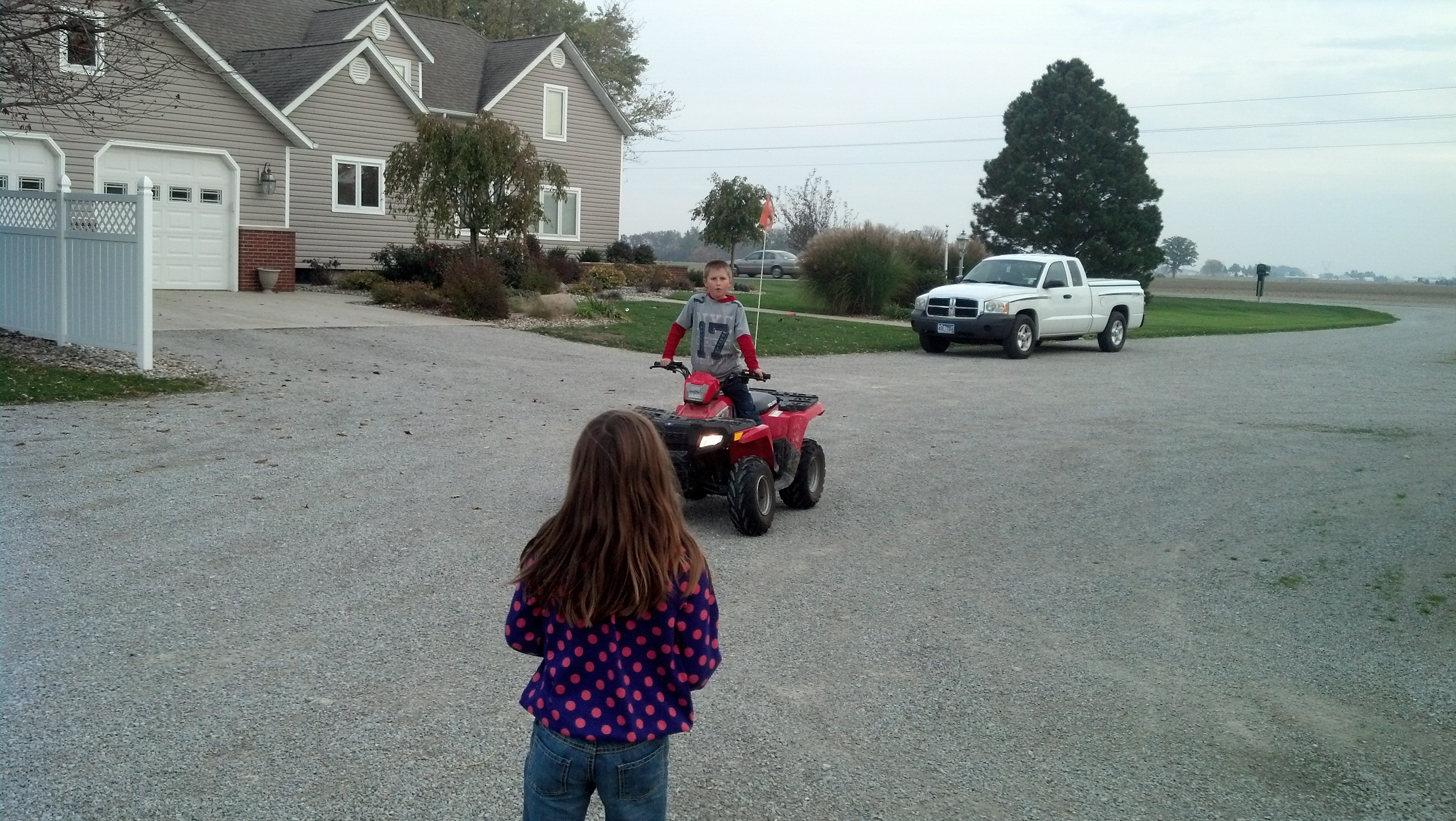 The children Trevor (5th grade), Melanie (3rd grade) and Holly (Kindergarten) are adorable and we thoroughly enjoyed visiting with and playing with them. Holly asked me during dinner how old I am and I asked her how old she thinks I am. She said 31 so guess who my new best little friend is!!!! We brought the kids a little craft making present and when Melanie opened it she said “You guys need to come visit more often!” They are all three adorable, active, well behaved children who have so much room to play and explore. They climbed on everything we saw no matter how high. Trevor rode his four wheeler all around having a great time. My heart stopped a bit when he rode real fast on the hill around the pond. Made me remember the days when our oldest son and Chip rode their go-karts and caused my mama to have little heart attacks when she saw them!