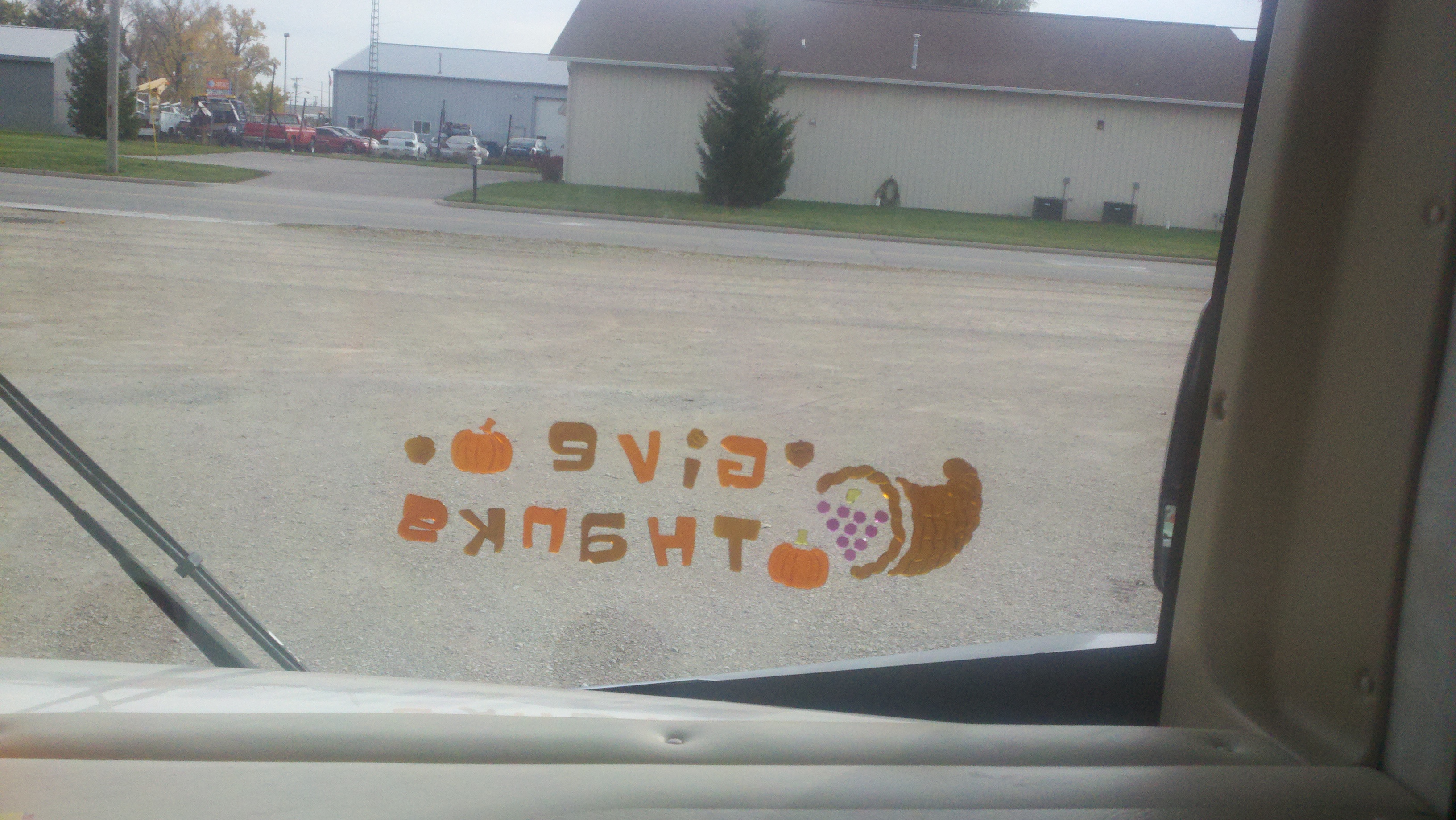 Now that Thanksgiving is the upcoming holiday we put our Give Thanks sign in the front of the window.  What you see in the picture is from the inside so it’s backwards.  It’s a challenge to decorate an RV and I really like these gel window signs!