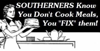 I believe I could write all day about this one but I’ll try to be brief. Southerners don’t realize that fixin is not a term that other folks use and certainly can’t imagine why they don’t understand it. I’ve been fixin food, fixin to leave, fixin to go to bed, fixin to go to work, fixin to go to church and fixin to dozens and dozens of other things all my life and never ever thought it was odd. Fixin means either “getting ready to” or “I am cooking”. And why we say it, I don’t know. Southern language can be a lazy language and somewhere back when someone must have started to say that one word instead of the three words and it stuck.