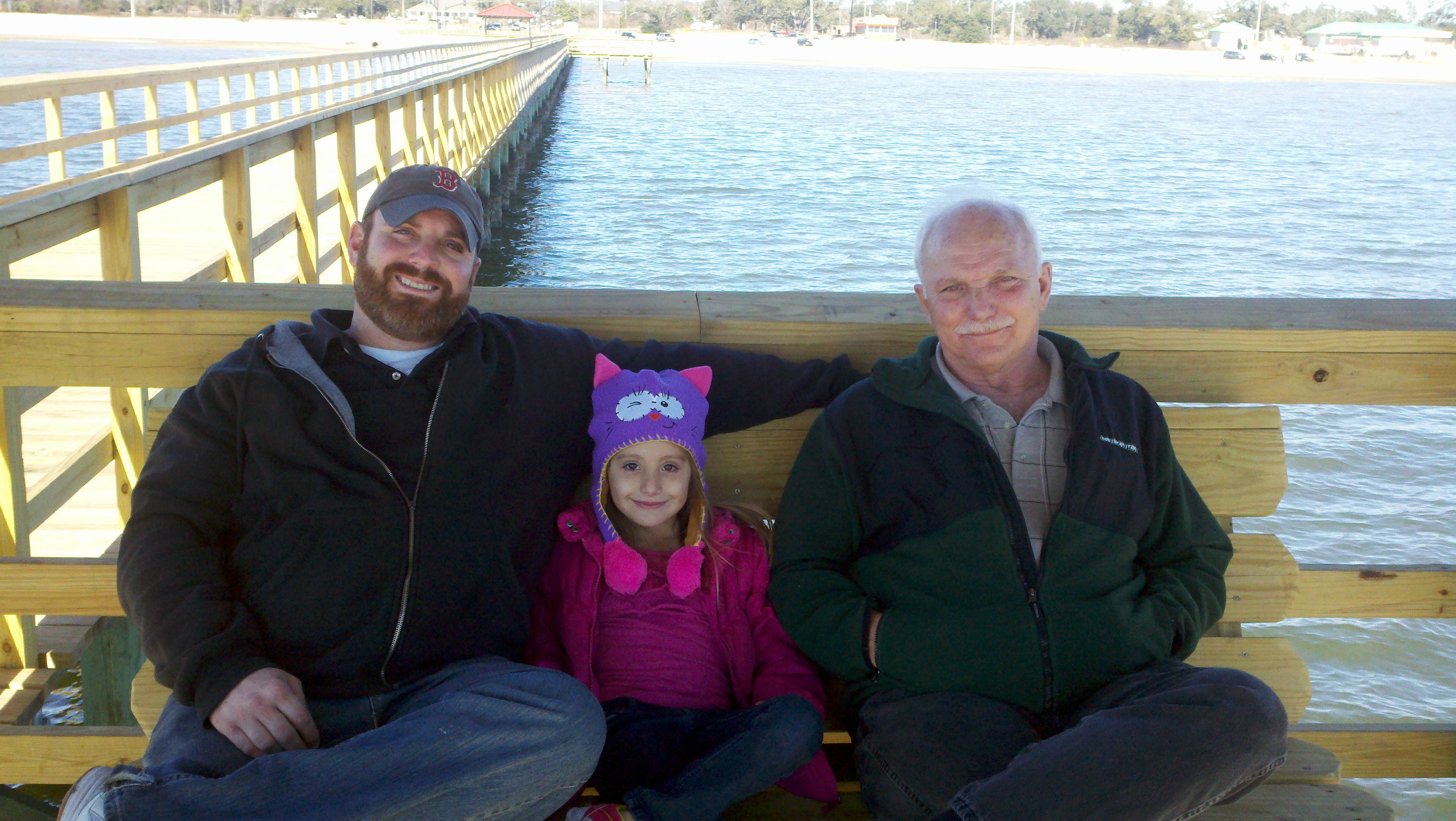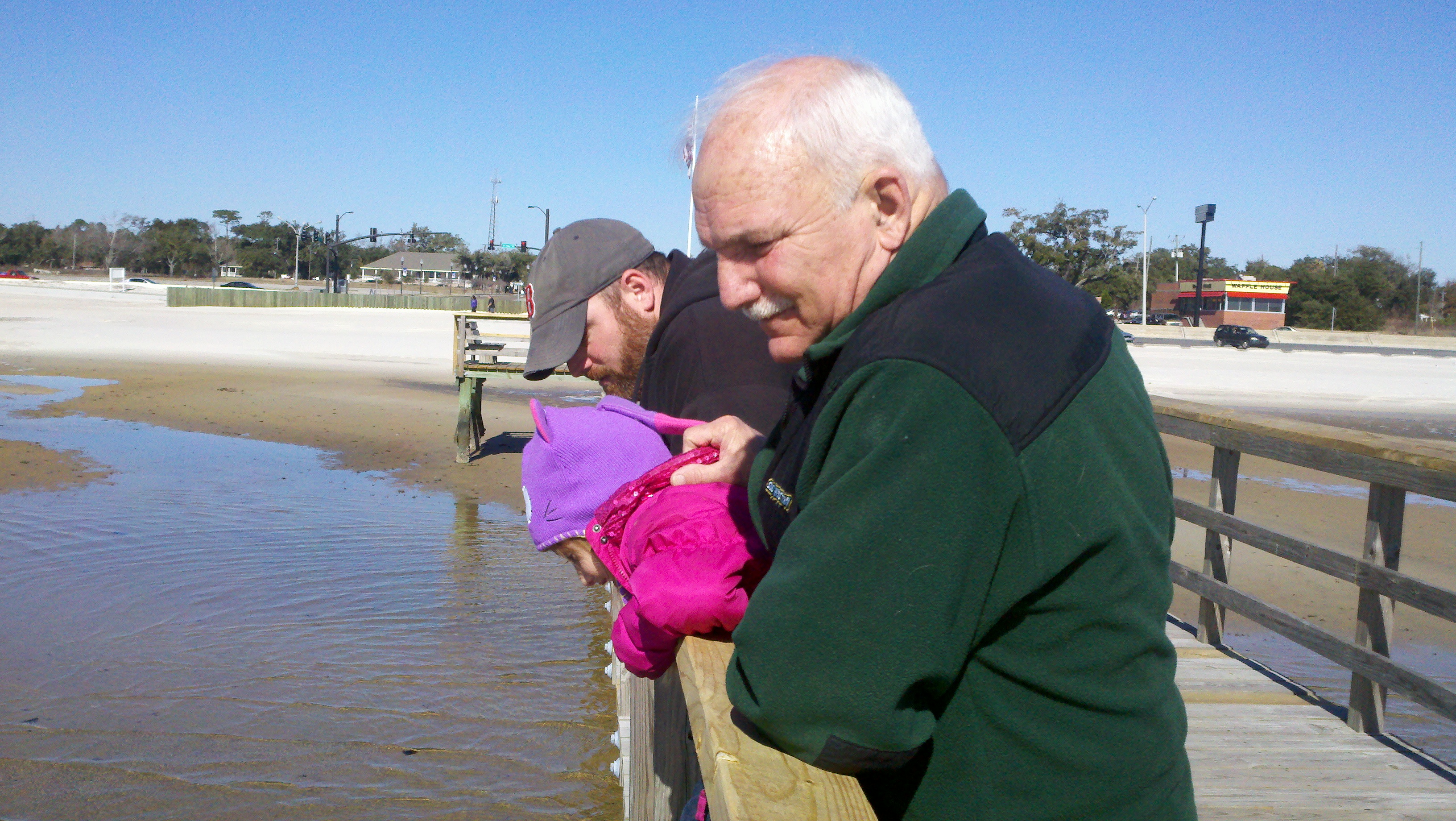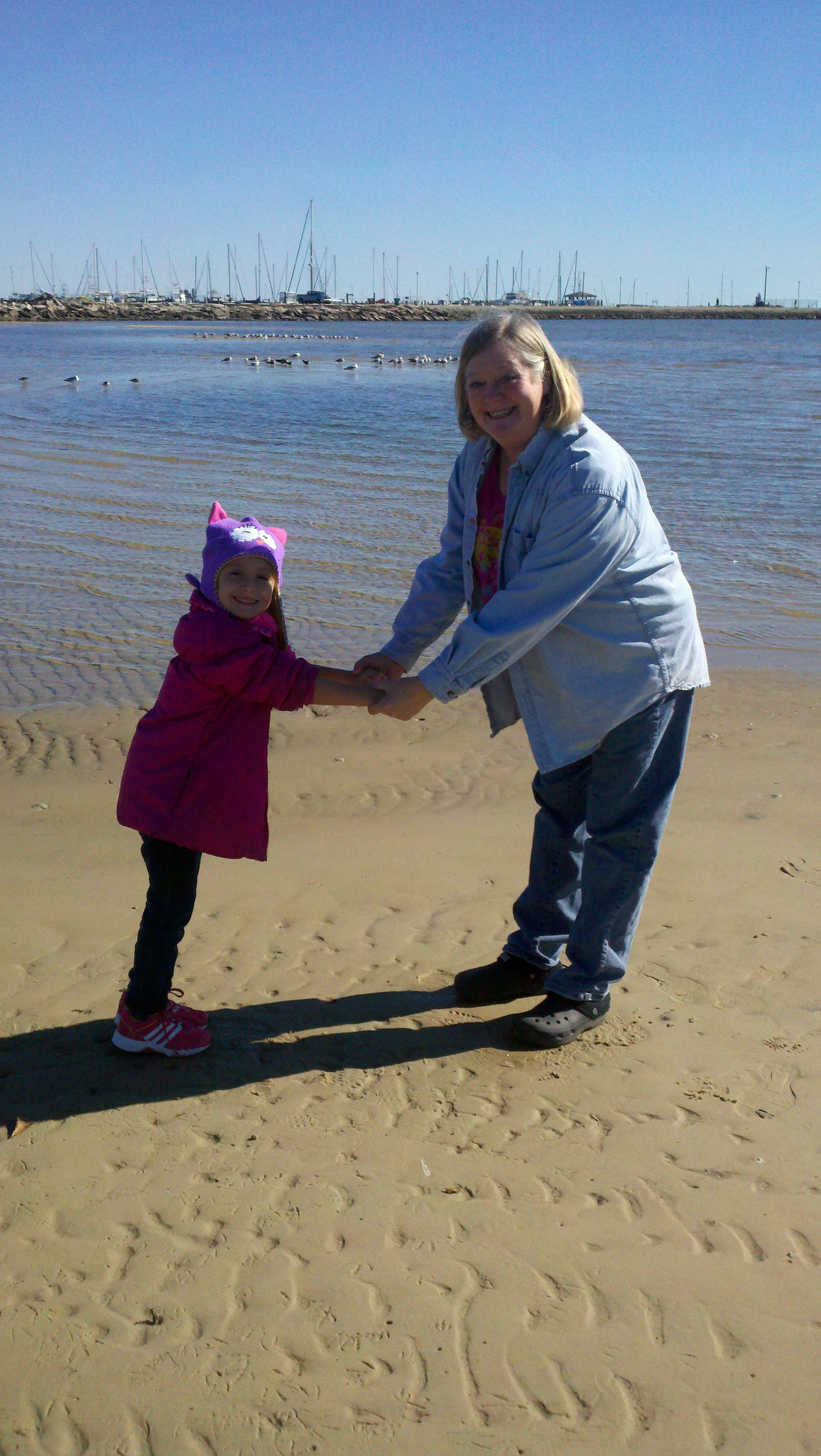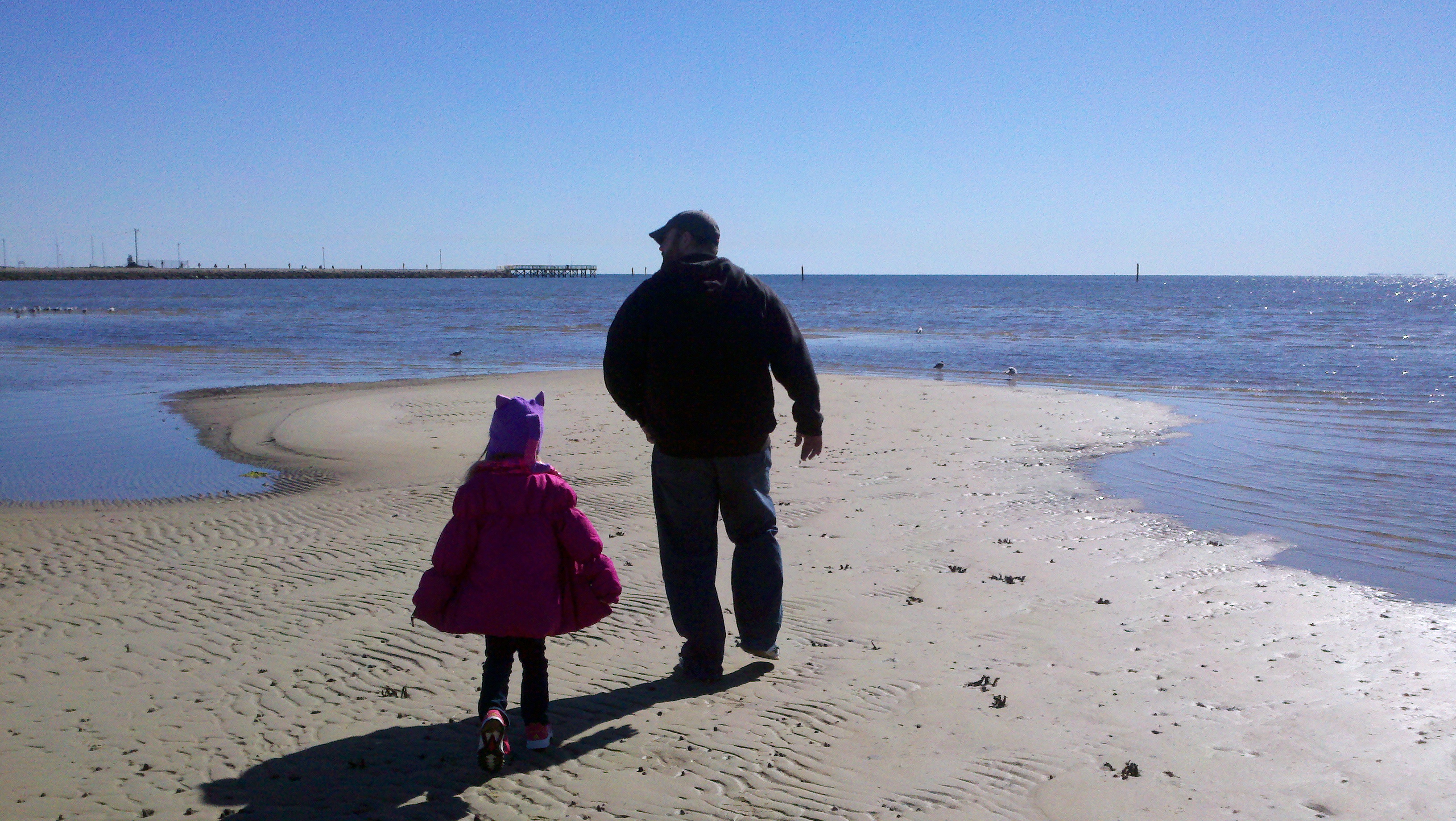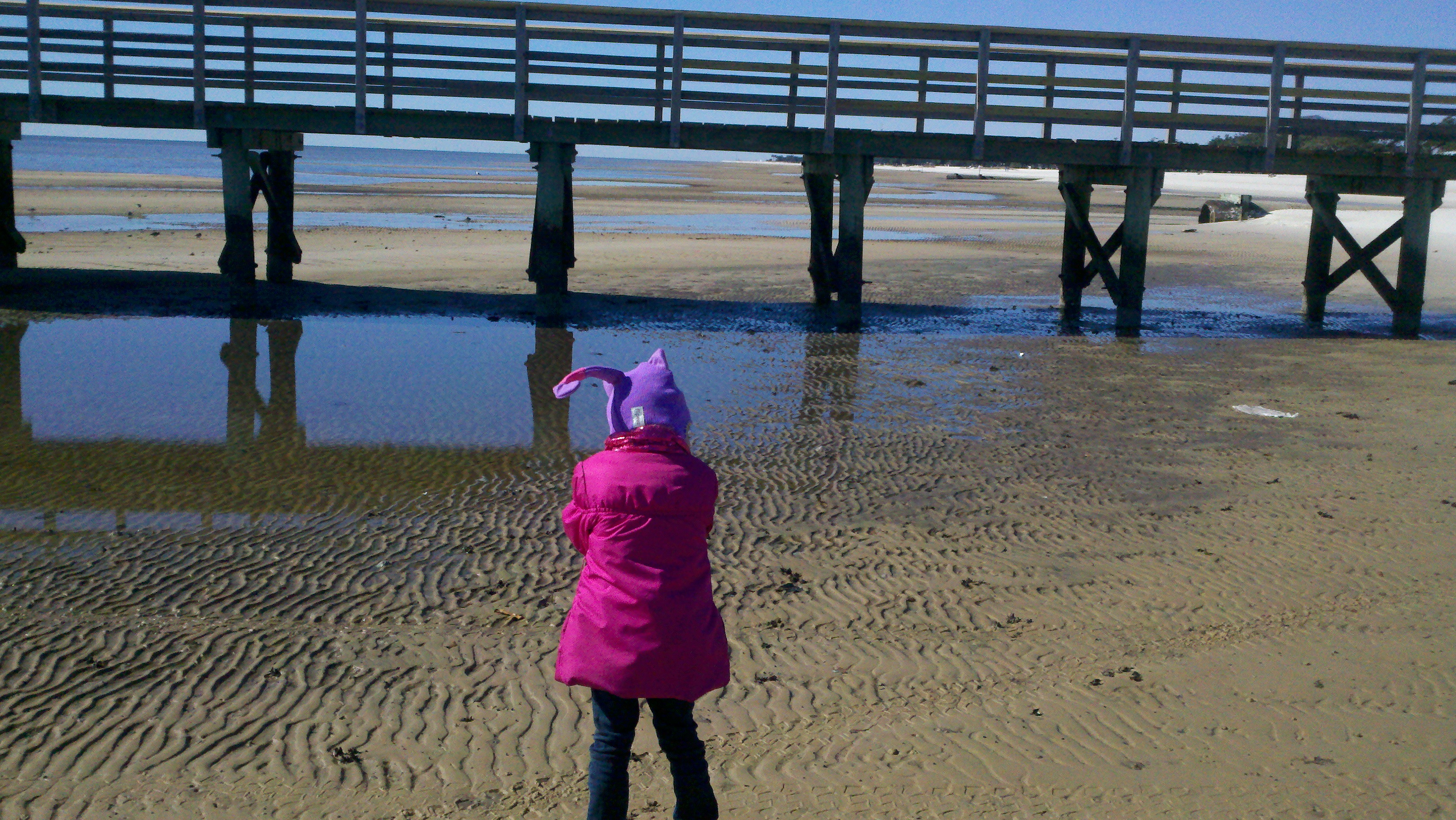 We then headed out to the beach for some fun – even though the temperature was right at freezing. We were all dressed warmly and the beautiful sun just added to the enjoyment We walked out on the sand dunes (I really don’t know if that is what they are called but that’s what I’m calling them) and she got to feel that the water was too cold to go swimming. Sometimes you just have to let them get out there and feel it to really understand why you have to say no!!! Roy isn’t a sand person, as you can tell from every beach picture we take that he is never in, so he waited for us on the pier.