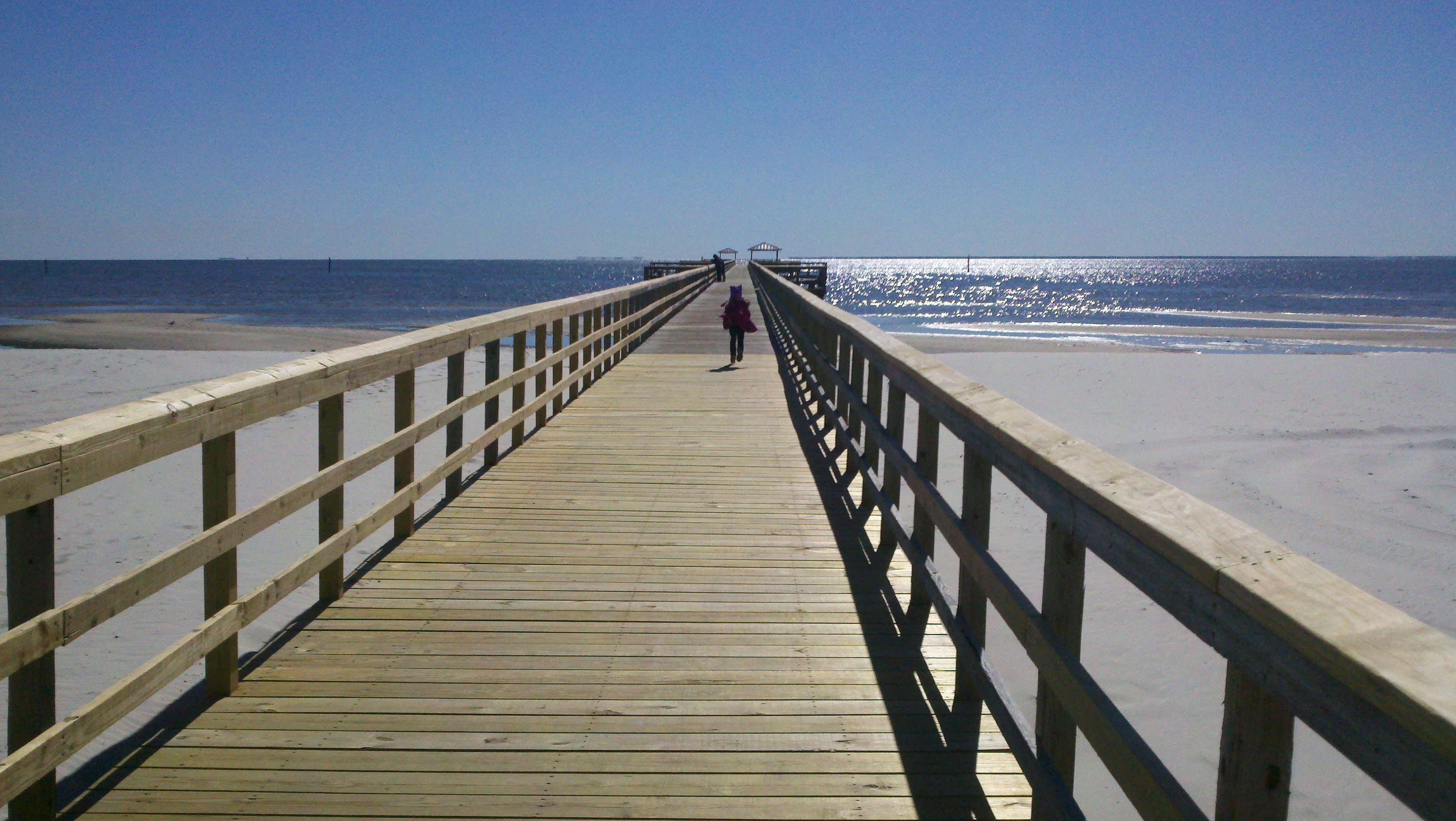 Once we had our fill of the sand we walked, skipped and ran down the pier together pausing every so often to see the water getting deeper a little at a time. We were very surprised to see how shallow the water was a very long way down the pier. It was fun seeing Madisyn and Chip playing together on the sand and on the pier. It’s a joy to see them together!