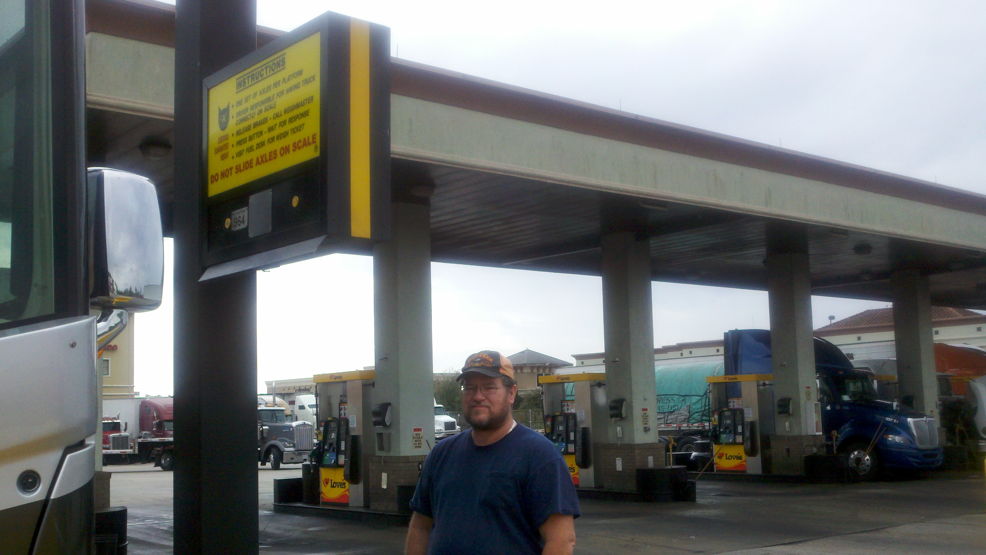 Having never done this before we asked inside the truck stop how to do it. They explained and it was a little confusing. A very nice trucker behind us in line followed us outside and showed us how to do the weighing. His name was Ray and this is him in the picture below. The other picture is of the weighing scale we used. Ray even helped Roy understand the information that was provided to us after the weighing.