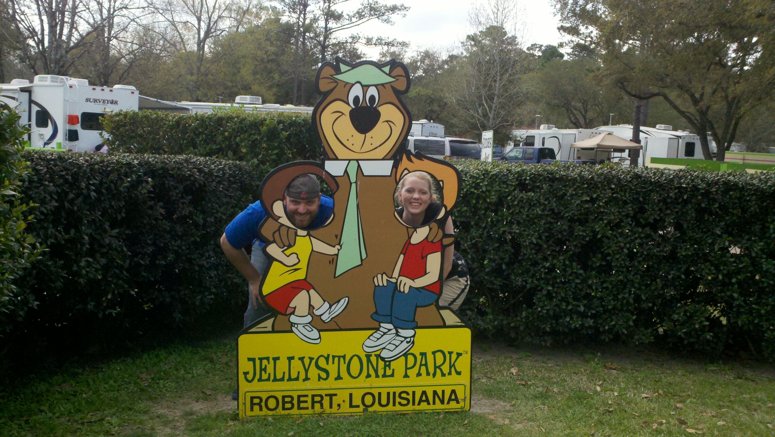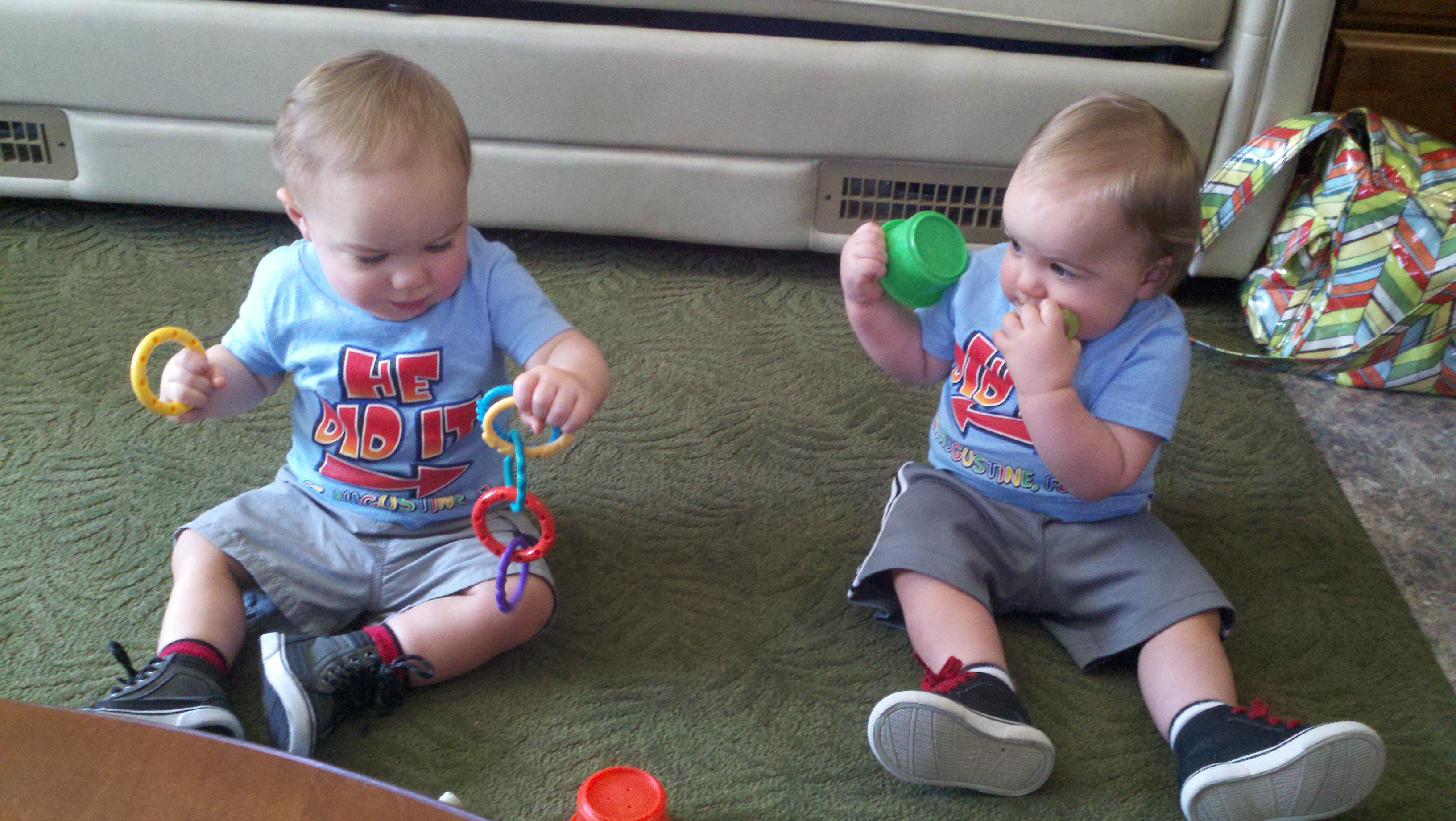 Over the weekend we were able to spend some time with Chip, Kim, Braxton and Bentley at Yogi Bear. We walked all around the campground with the boys in their double stroller. They are too little to participate in the many activities they have for children but we had a wonderful time visiting with the grown ups and playing with the little boys. The boys are extremely mobile now (not quite walking on their own) which makes the RV a wonderful land of new objects to touch, pull up on, try out and whatever they could come up with. They are sweet, well behaved, calm little boys and are a joy to have around. In one of the pictures below Braxton and Bentley have on little shirts we had made for them when we were in St. Augustine. Each of them says “He Did It” and points to the other one!! We thought the little kid ride around carts was cute sitting next to the grown up golf carts so of course a picture was taken. Chip and Kim were being kids having their picture taken with Yogi Bear!