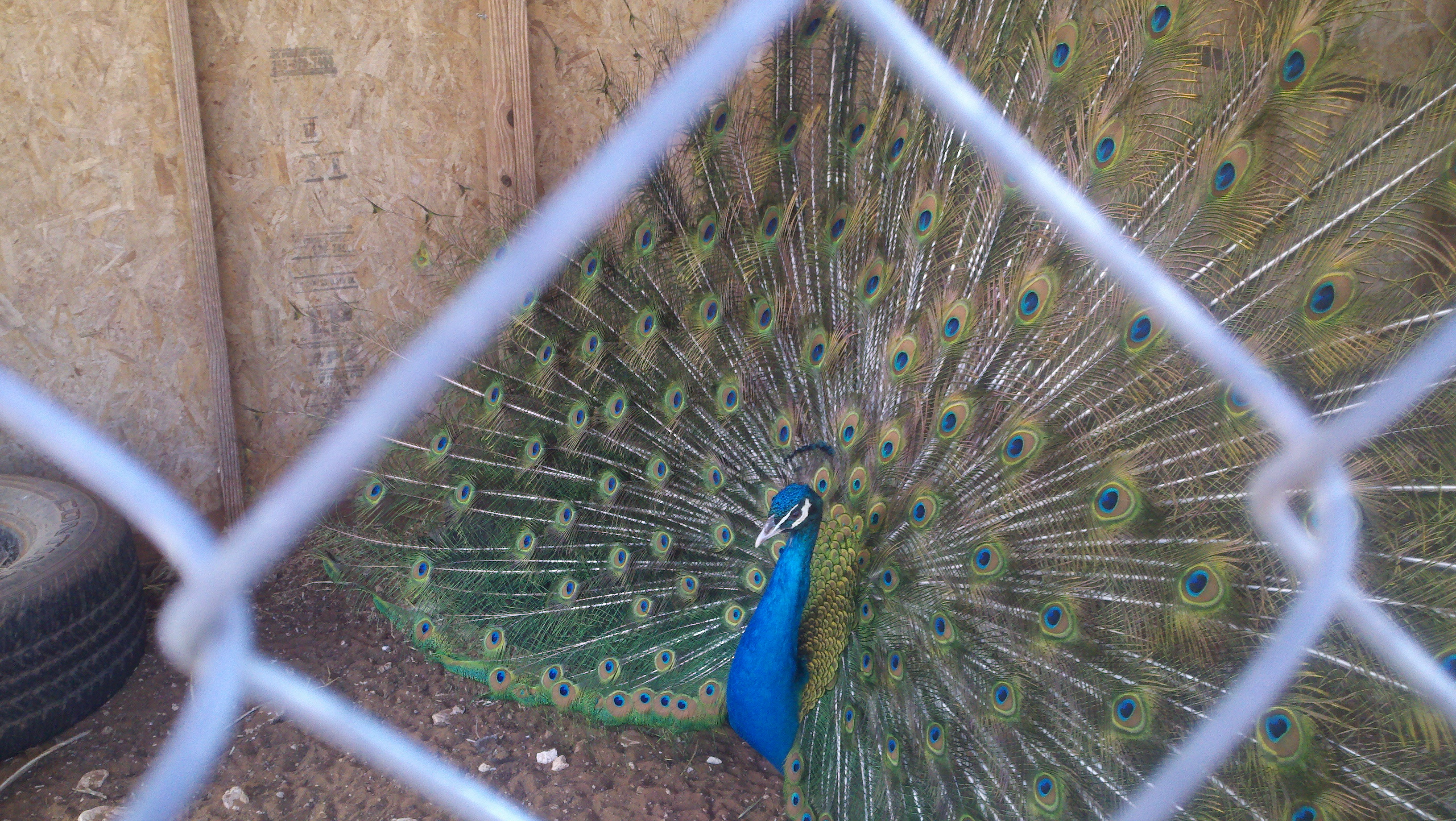 We are taking care of 6 peacocks as part of our responsibilities here at MEW Ranch in San Diego, Texas. I’ve only seen live (not in print) peacocks in zoos and when we visited the Fountain of Youth in St. Augustine, FL. I’ve never heard them holler Help but they do and they are so loud about it we can hear them at our RV from their cage by the Morgan’s house. The daddy peacock does it mostly and he’s also very protective of his flock. Roy has to protect himself when he goes in there as daddy peacock thinks Roy’s going to do something to his flock when all Roy’s there for is to feed and water them! Here’s some pictures of these beautiful creatures.