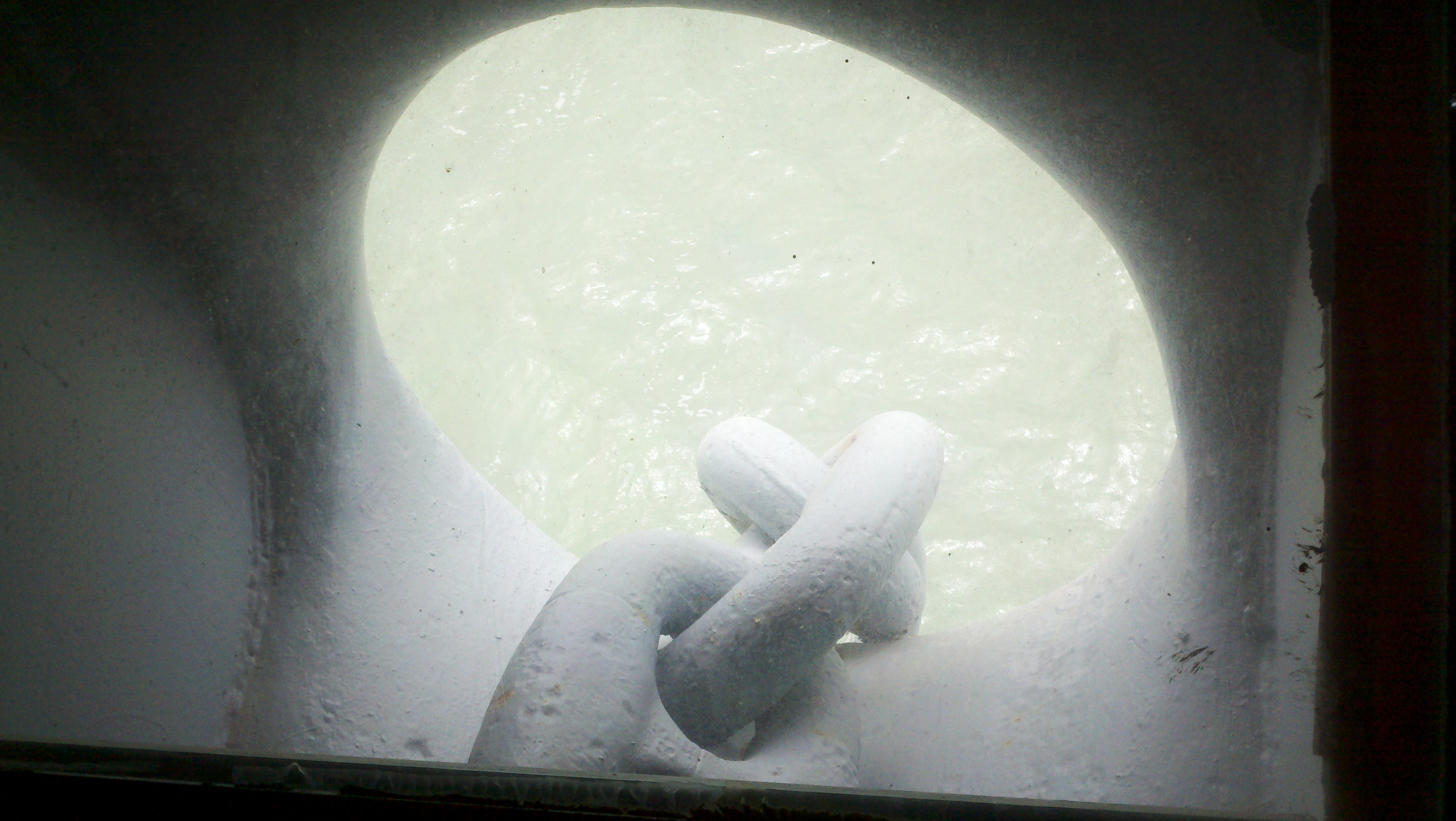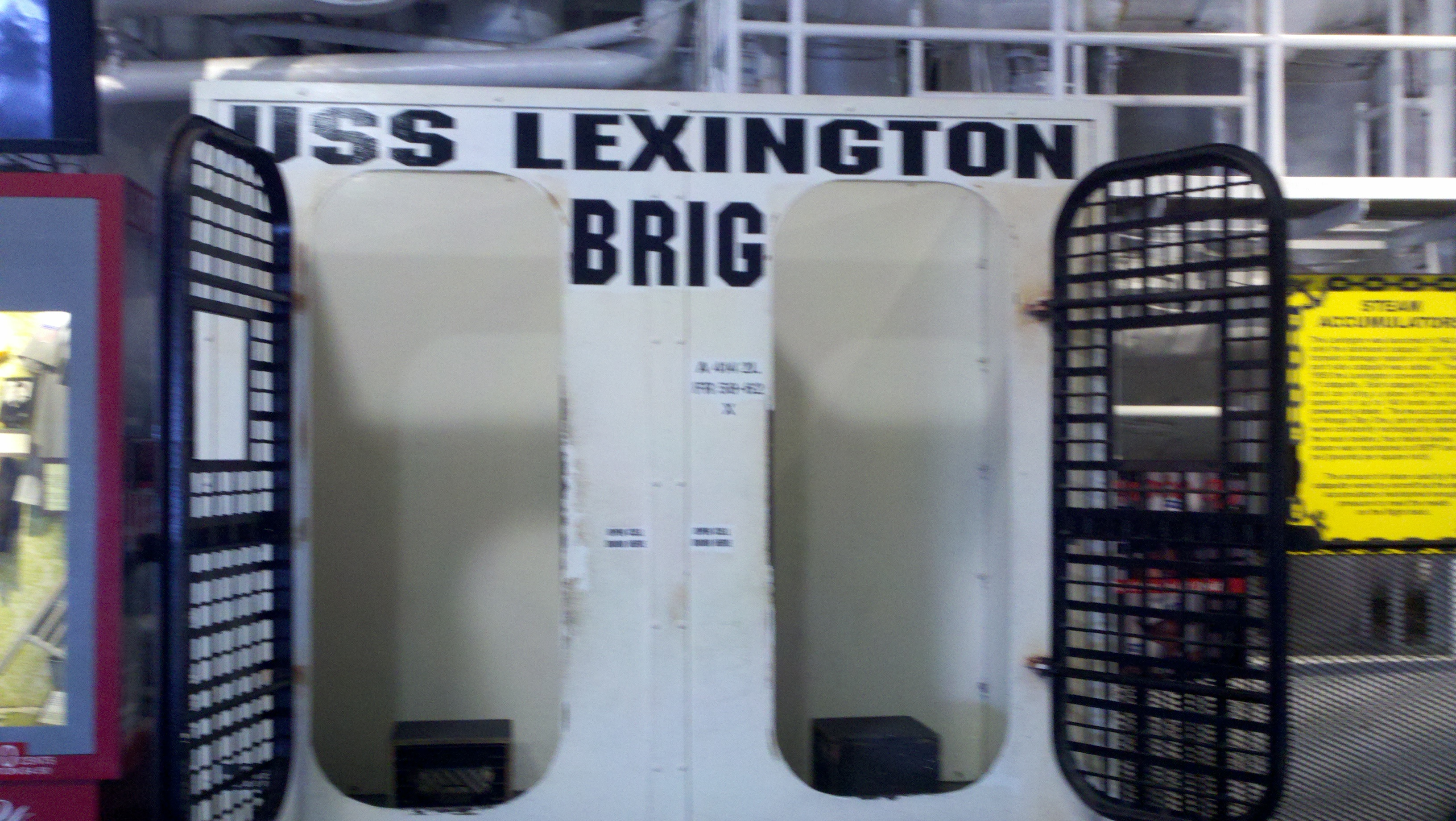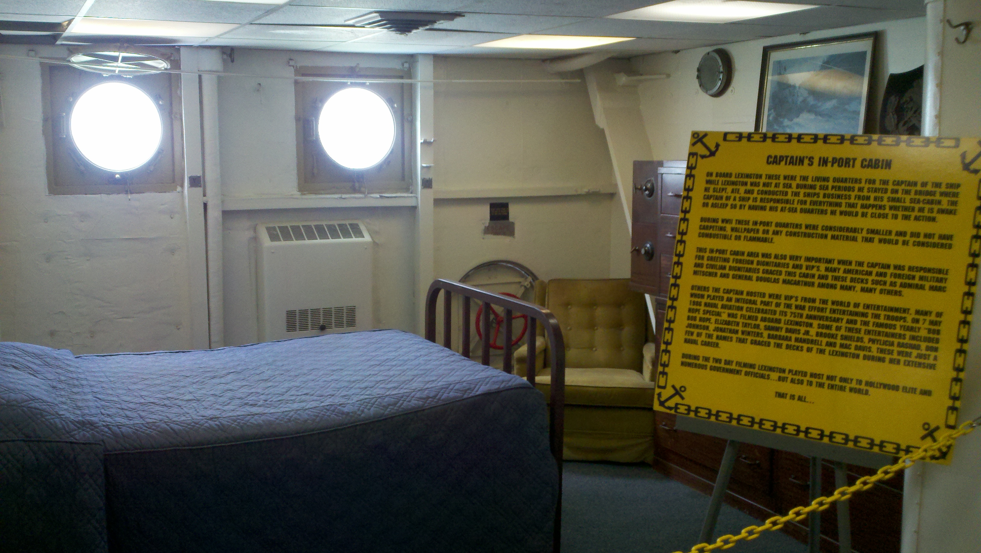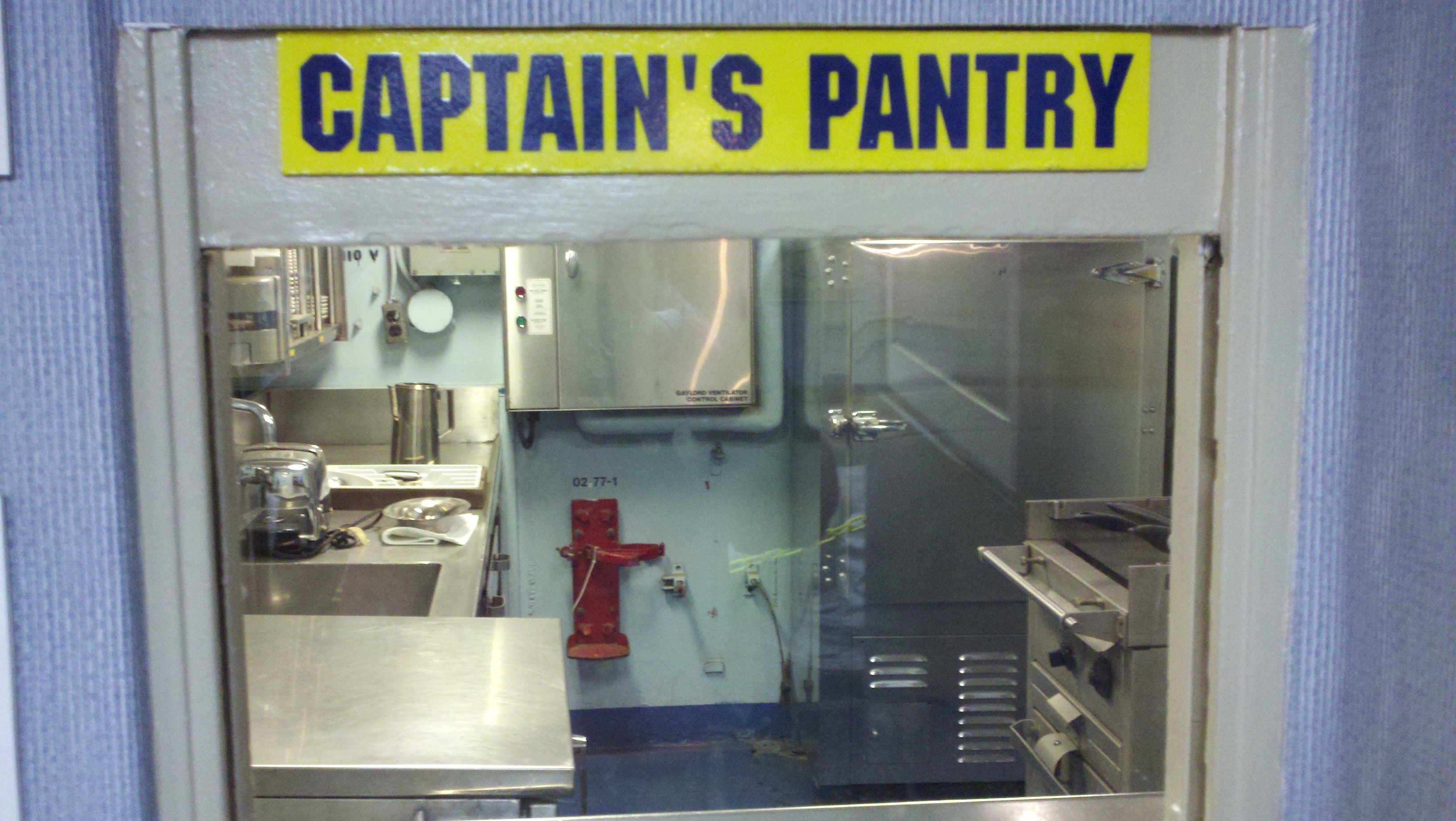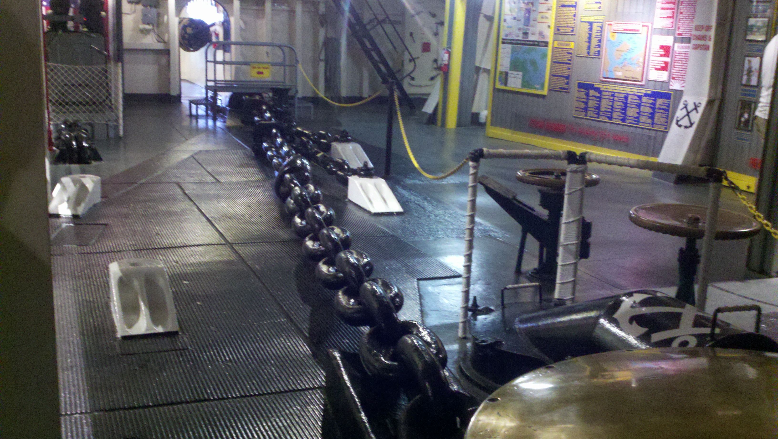 We saw the crews dental office, surgery room, sick call area, the captains in-dock and out at sea bedrooms, his personal food galley, officers lounging area, crews eating area, the engine room, the bridge (where Roy sat in the Captains chair and acted like he was guiding the ship!), the barber shop, the pilots ready rooms, the anchor room, crews quarters, female crew quarters, the Brig (where I stayed for a while! and Roy refused to enter!) and hundreds of steep steep stairs.
