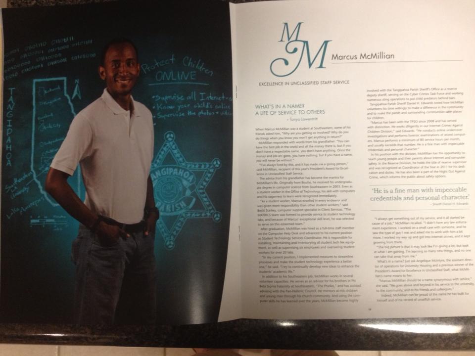 I could write a short book about Marcus’ accomplishment in his young life but I’ll just share that he won Southeastern’s Excellence in Unclassified Staff Service award last year.  This is a BIG DEAL to be chosen for this.  He’s dedicated countless hours to serving the Tangipahoa Sheriff’s Office in a reserve capacity (which sometimes was almost full time), hours in service to his God and hours giving of himself to all his friends who have called on him in their hour of need.  I know from times in our life we’ve called on him and he’s always come through.    The picture below is about him earning the Southeastern award.