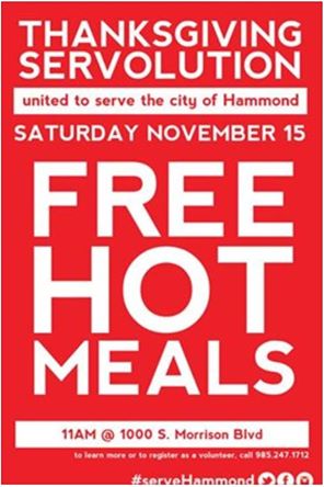 Our son Chip, his daughter Madisyn, his girlfriend Kim and his mom, ME volunteered to help serve free hot meals to 2400 Hammond residents. The event was called THANKSGIVING SERVOLUTION. Serving 2400 hot meals seemed to me to be a monumental task, but they were so very organized, thanks to Jason Granger from Soul’s Harbor, that everything went quite smoothly throughout the whole day.