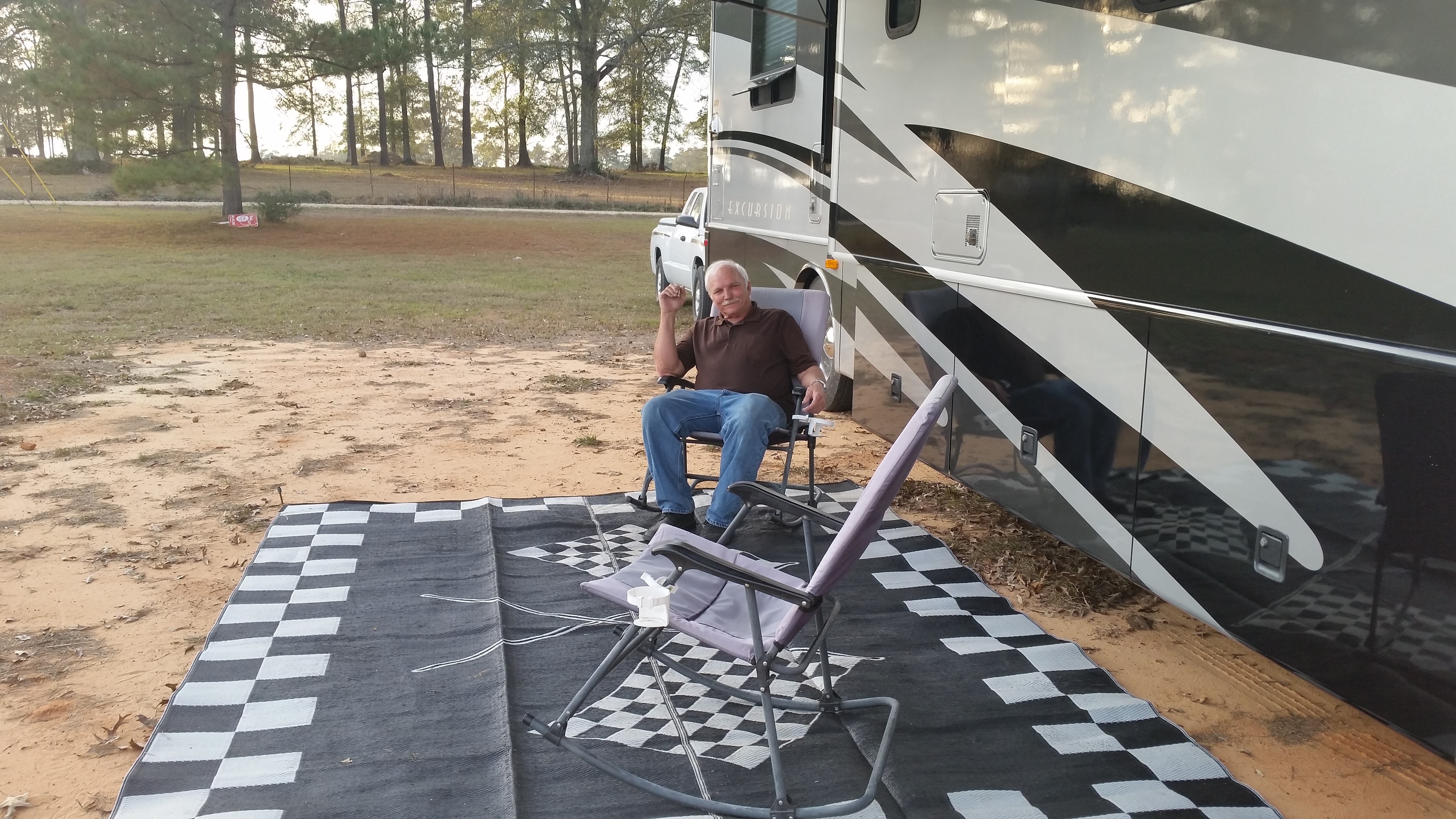 Our act of sale was this morning so we are now officially owners of the property in Amite, Louisiana. We packed up the RV and moved up I-55 and are now parked on the dirt pad where our new small house will one day stand. Roy’s building a fire outside while I do this! We are having to boondock (live off our own electricity and water) until we can get everything installed to be able to hook up to. We’ve never done that for more than one day so this will be a learning experience. I want to boondock often while we’re out west right in the middle of nowhere. One of the little girls from down the street came to meet us when we pulled in and right away wanted to know where Madisyn was. She makes friends everywhere!