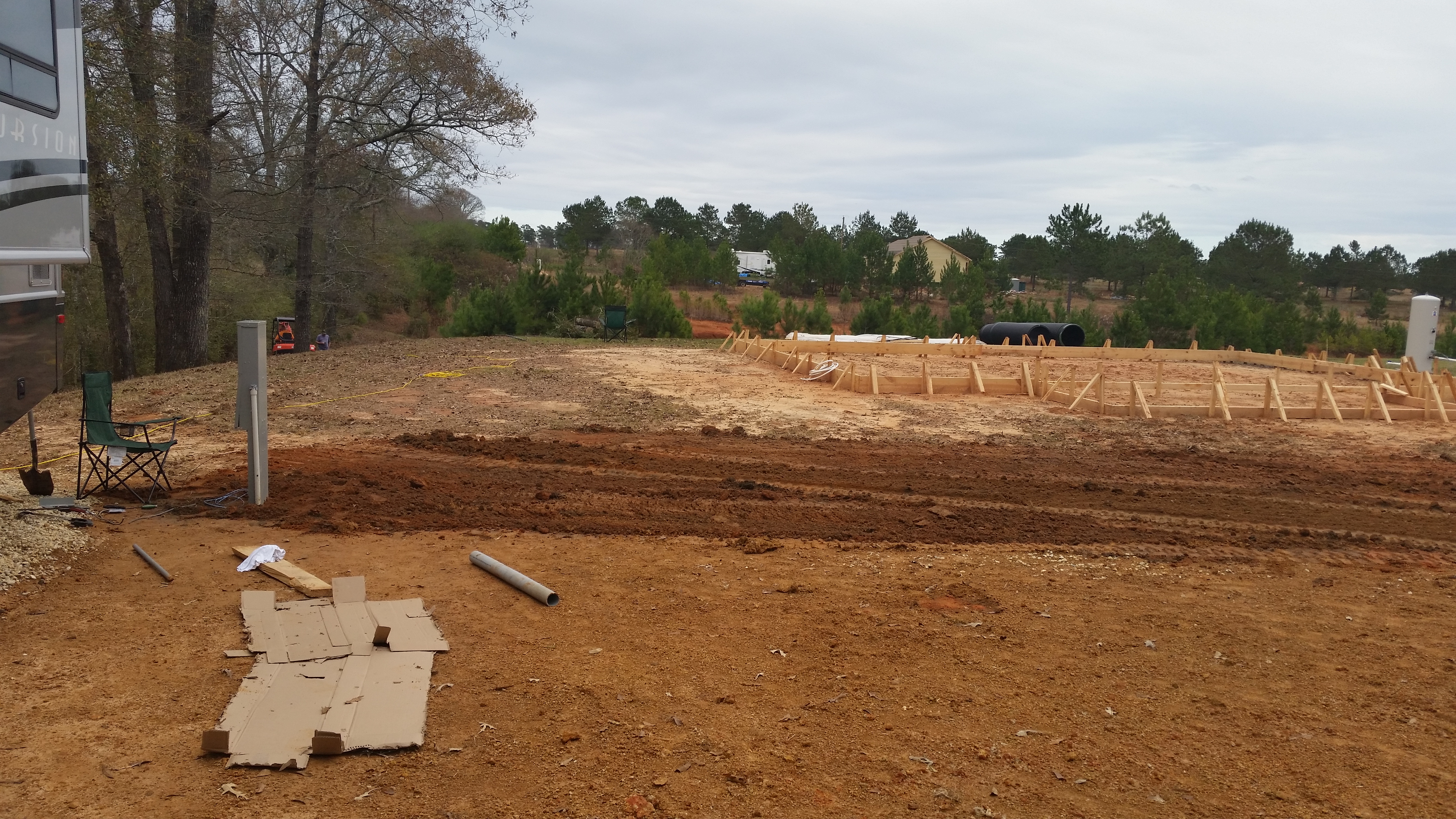 Today, Friday, Mark Lee came out to dig trenches for the plumbing and electrical wires. While they did that and helped Roy install our electrical pedestal (permanent power for the RV and temporary for building the house), I drove to Franklinton to set up an account with Washington St Tammany Electric Co-op. A very nice lady, Sandra, helped me and didn’t kick me out of the office even though I’m sure I didn’t smell or look the best on day three without a shower. This boon docking is not for the faint of heart. An engineer has to come out to check the work so far and then they’ll do whatever is next so we can have power which in turn will give us water! I asked Sandra to pass along to the engineer that we are in “dire need”! Oh what a happy day that will be. I hope I never take running water and electricity for granted.