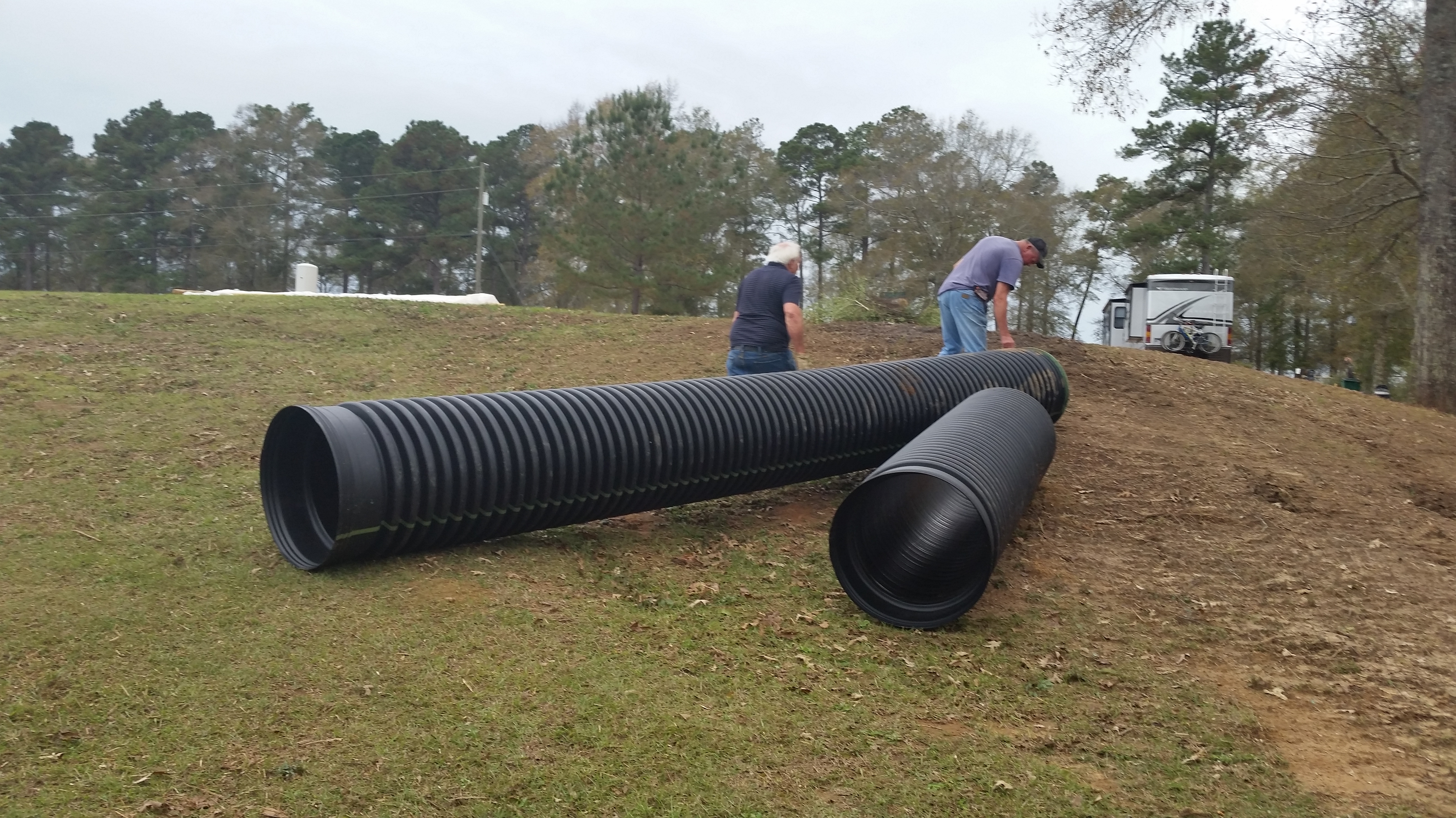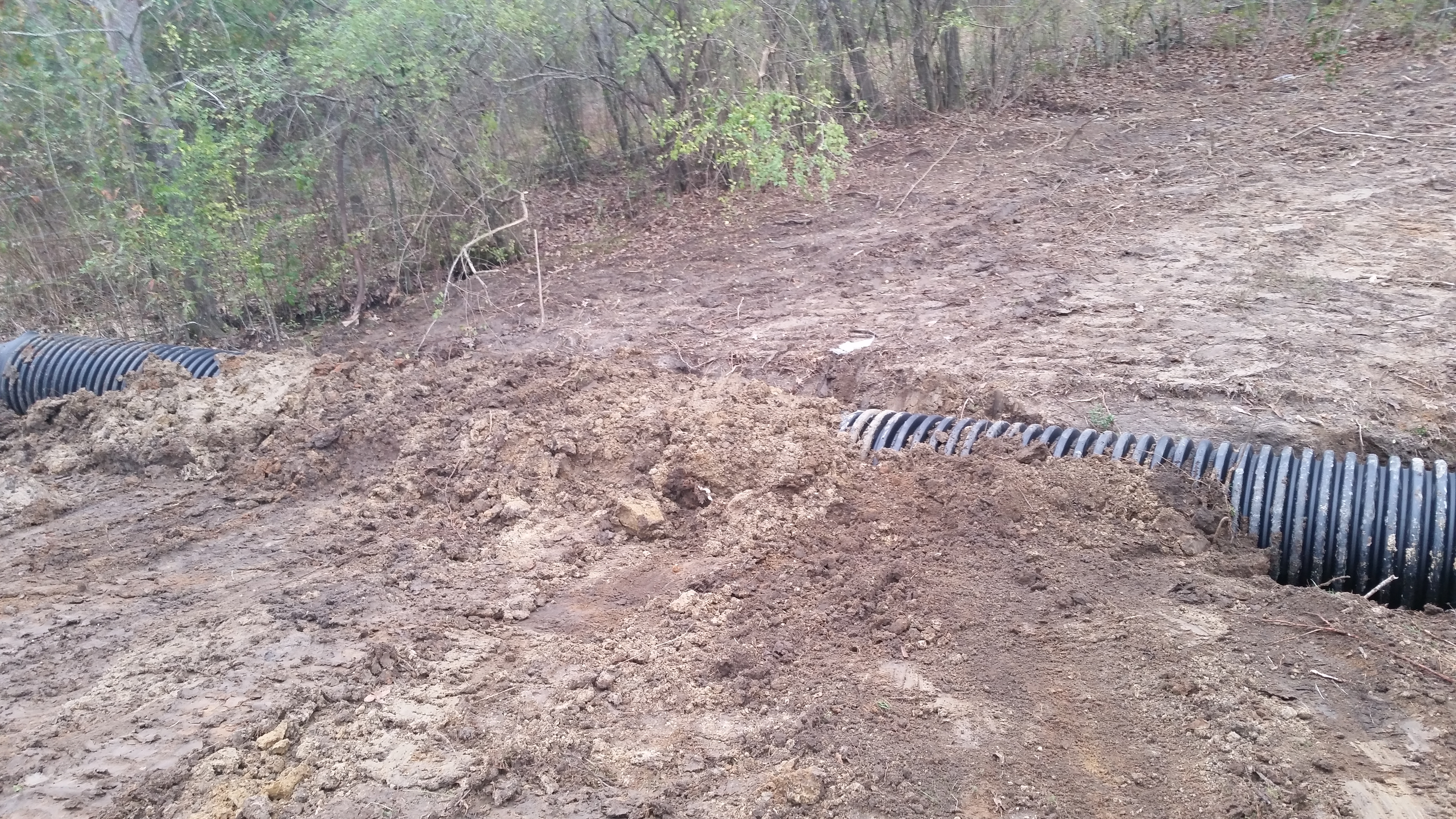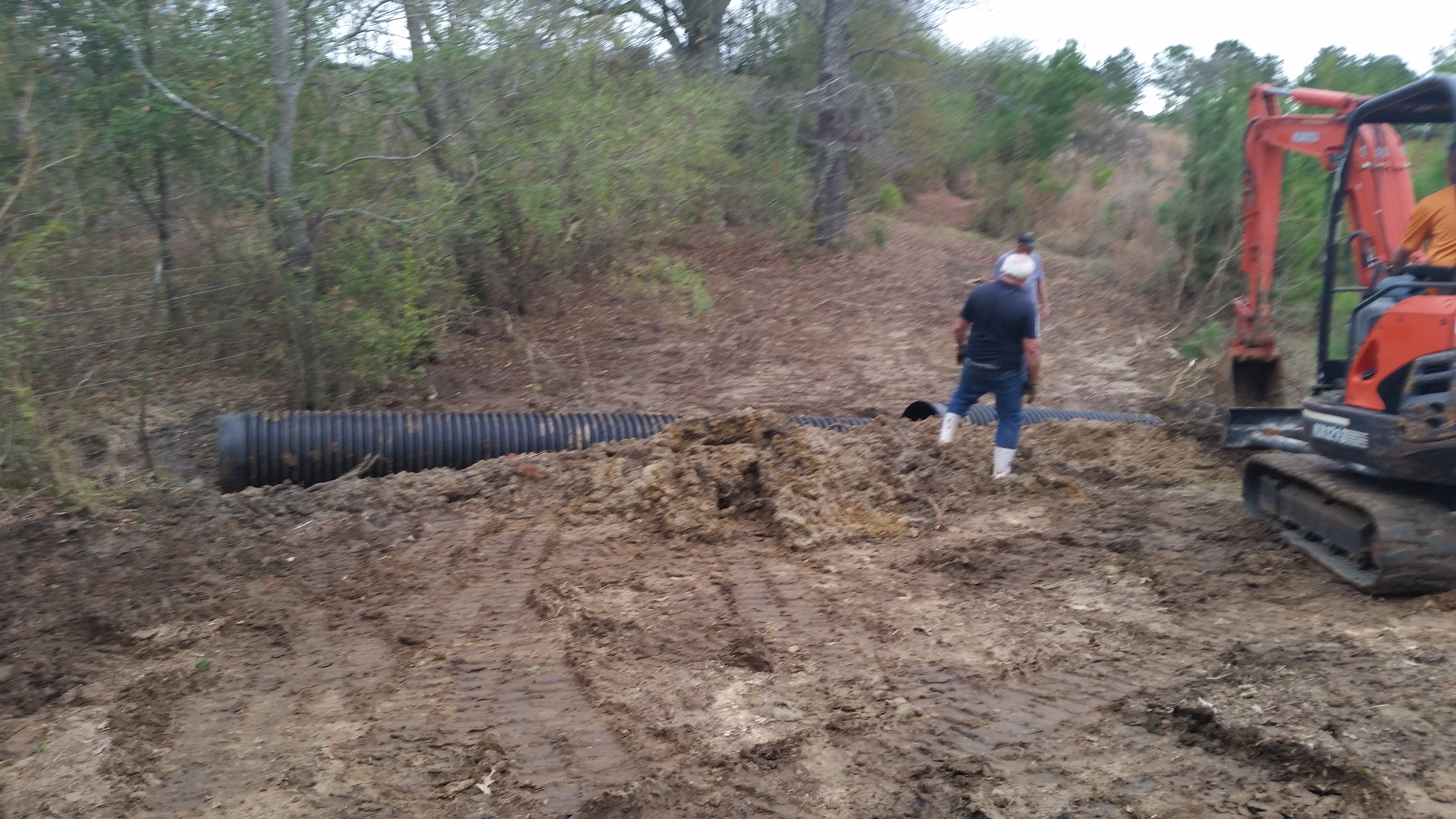 Wow what a big thing that was getting the two culverts to go together and stay together! I didn’t lift a finger except to click the pictures. Roy, Mark and the backhoe driver worked and worked until it finally stayed together, went in the hole and was covered up as much as could be with the dirt available.