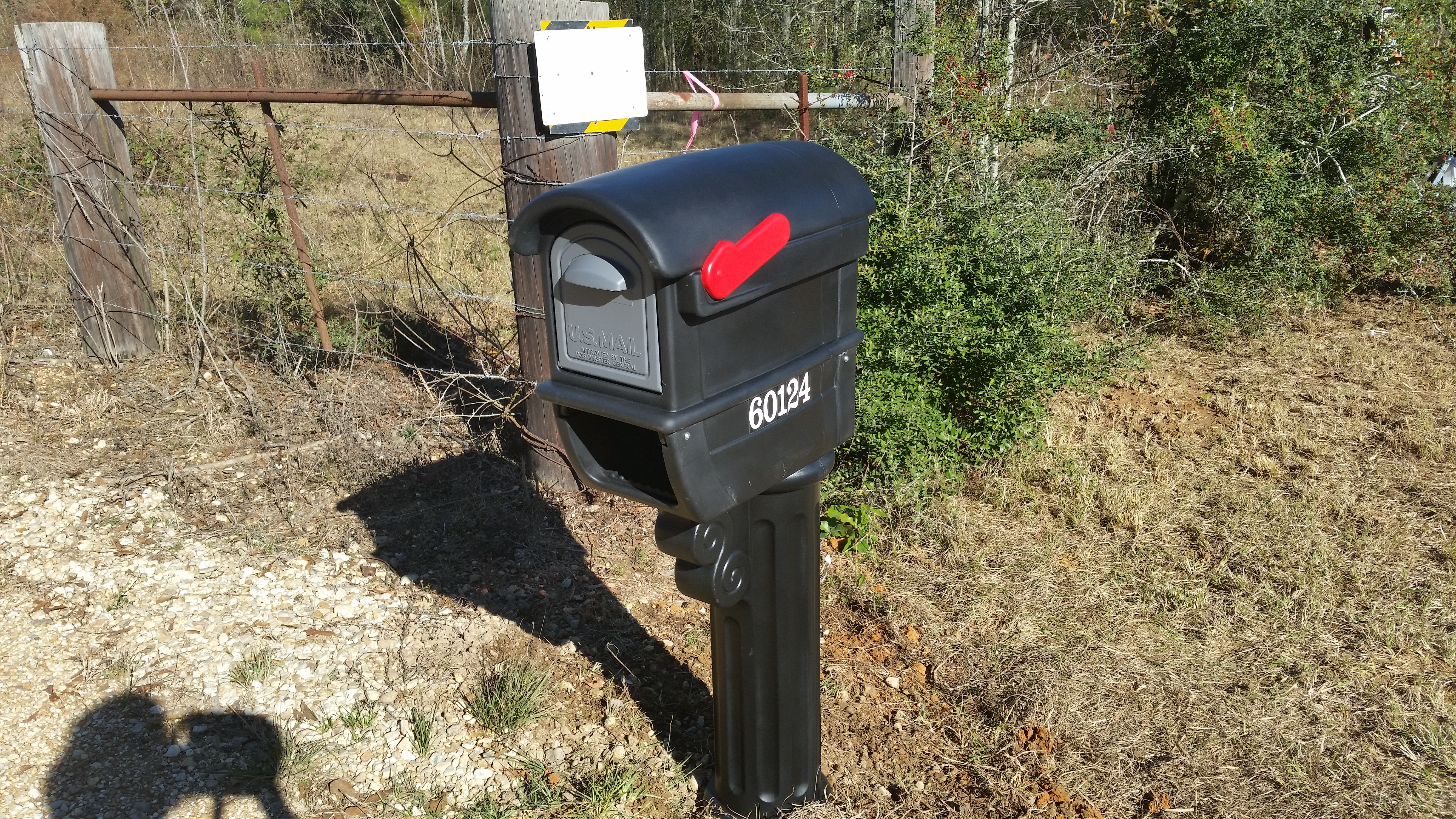 On Christmas day, for the first time in a while, we didn’t have to go anywhere. Roy got up early to set the post and put our new mailbox together for Dora. I wanted a pretty mailbox and he wanted one big enough to hold packages he seems to always be receiving! Roy found just the right one on the internet and we ordered two of them, one for Dora and one for the house. We have 911 addresses for both. Come to find out you can get a 911 street address for just about anything – barns, wells, culverts, radio and television transmitting towers and even billboards. Weird, right? So Dora getting her own address was no big deal!