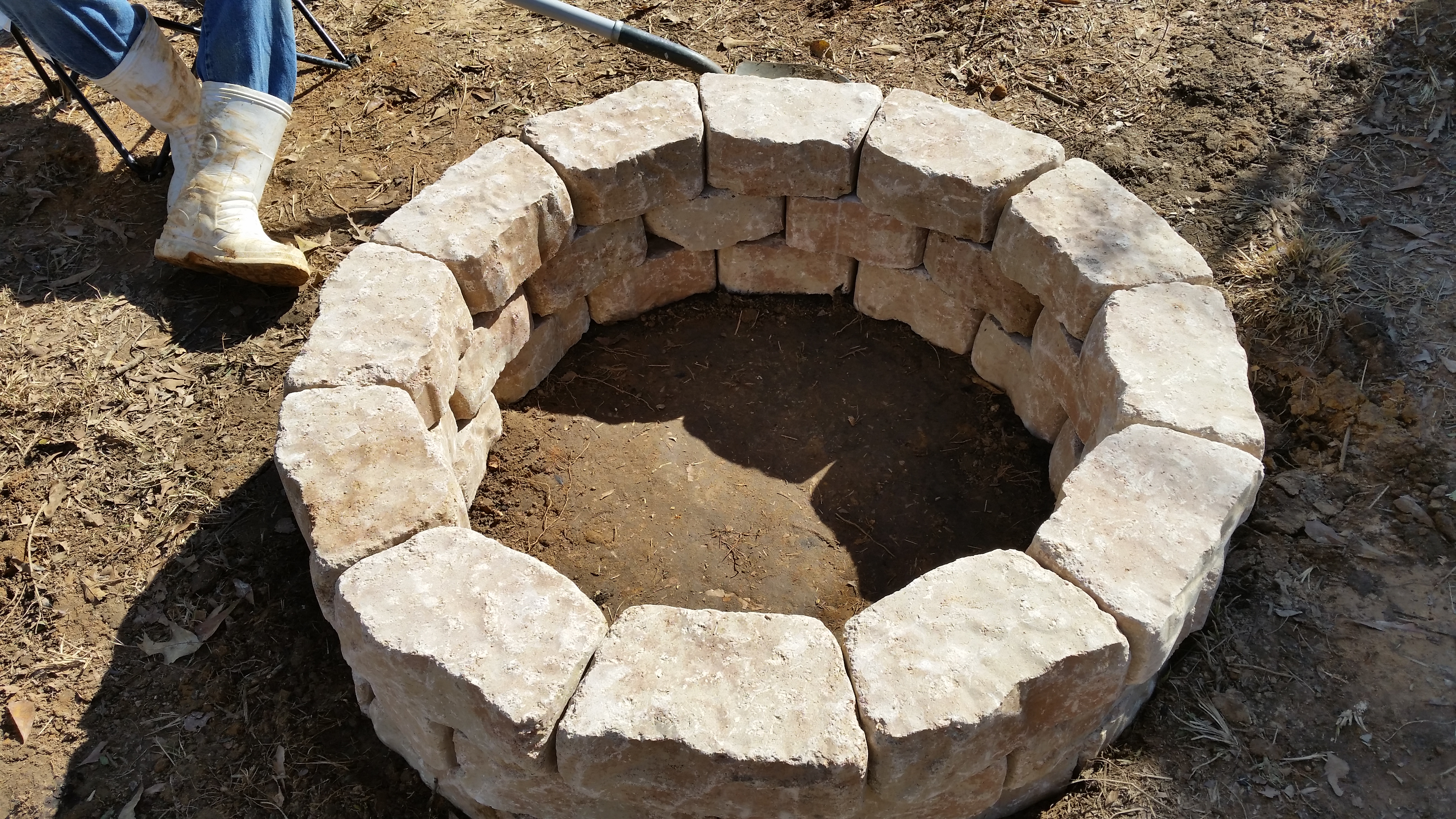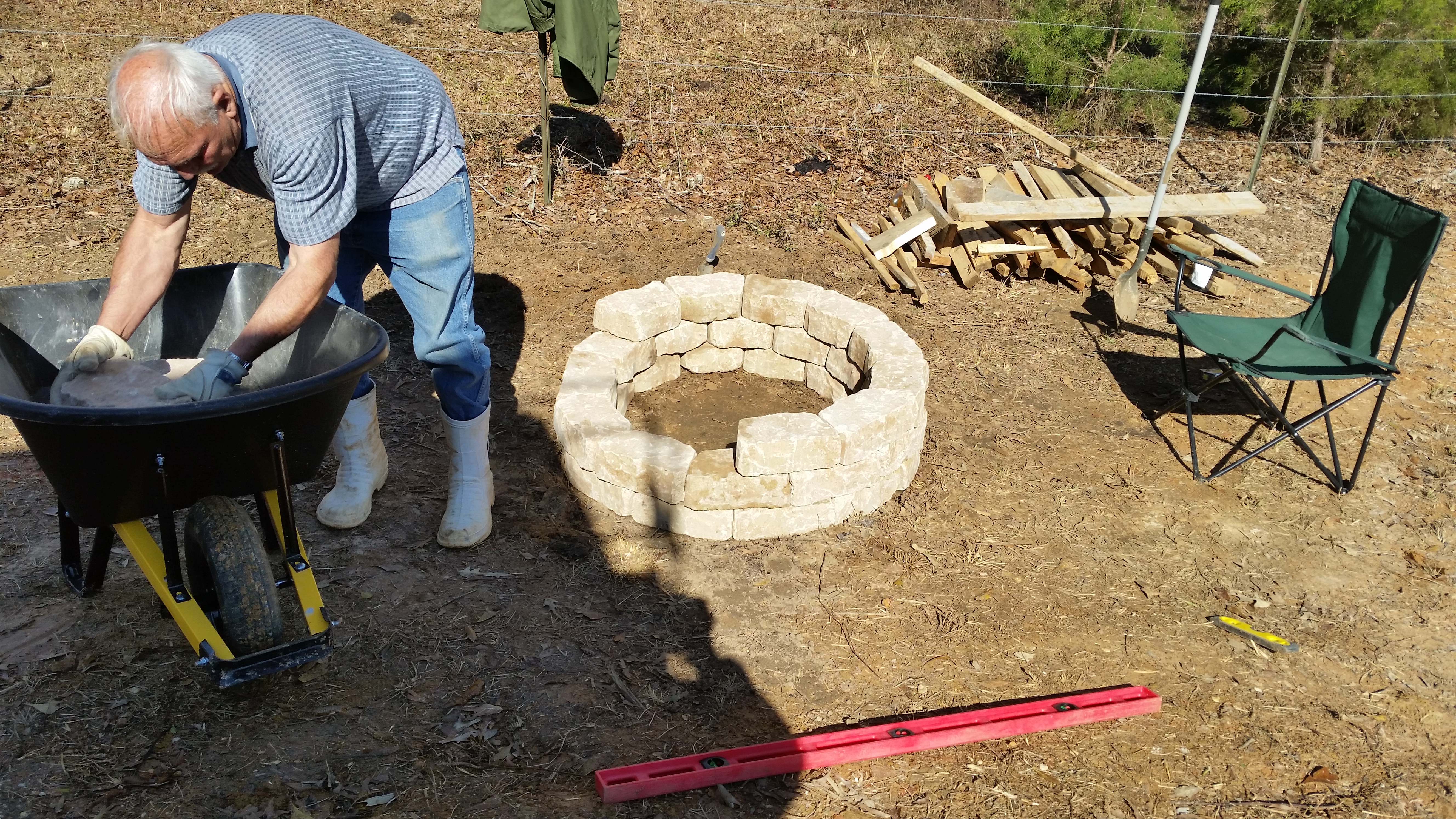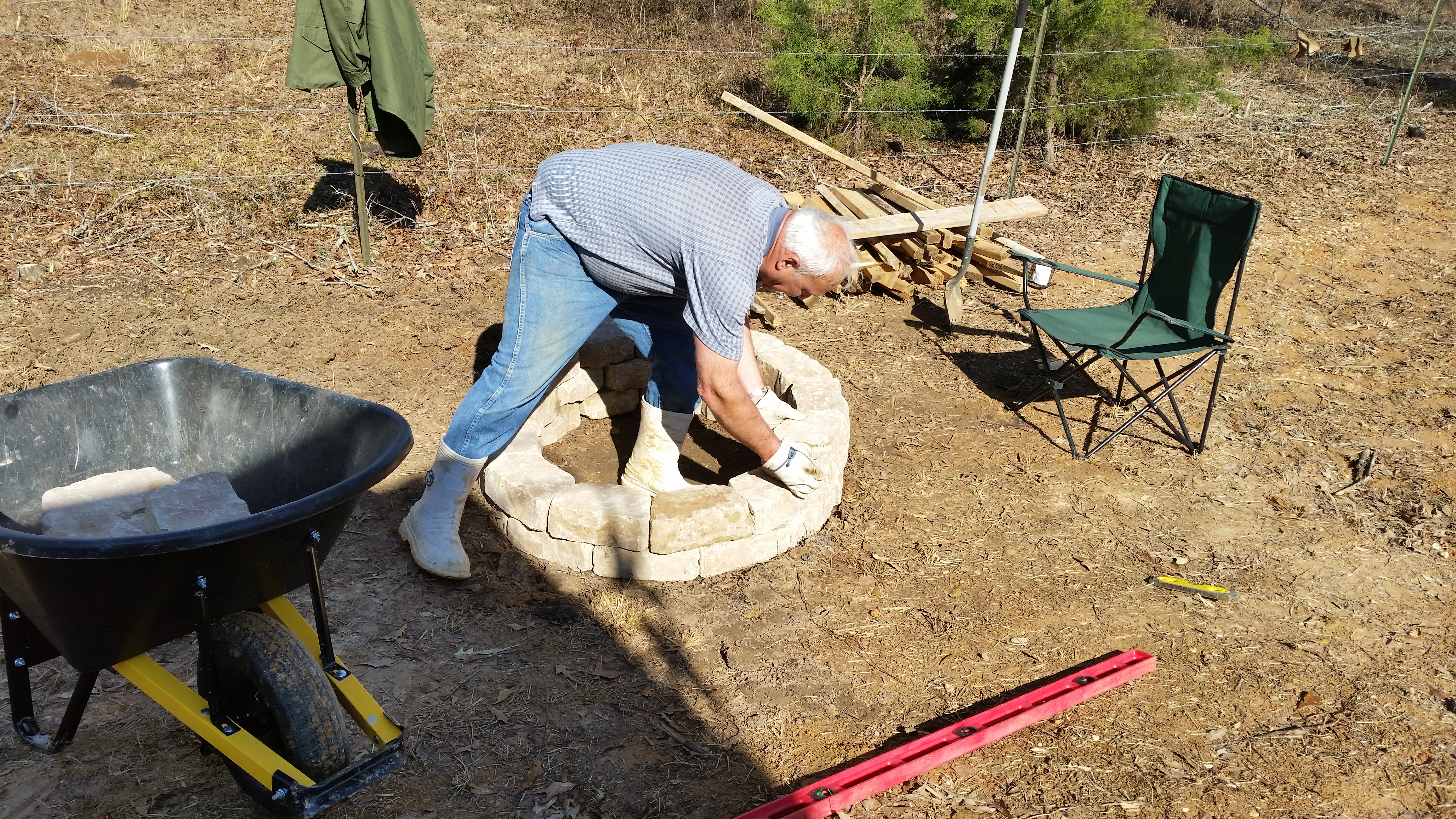 Saturday, January 24, 2015 – Roy jumped right into building our campfire pit this morning. Everything he does has to be just so and that showed in the time he spent on the pit. He put the first ring together and took it apart numerous times before being satisfied. Some of the dirt around it had to be dug out and leveled, then spread. My big contribution was breaking up some of the big lumps of dirt and supervising his work of course!