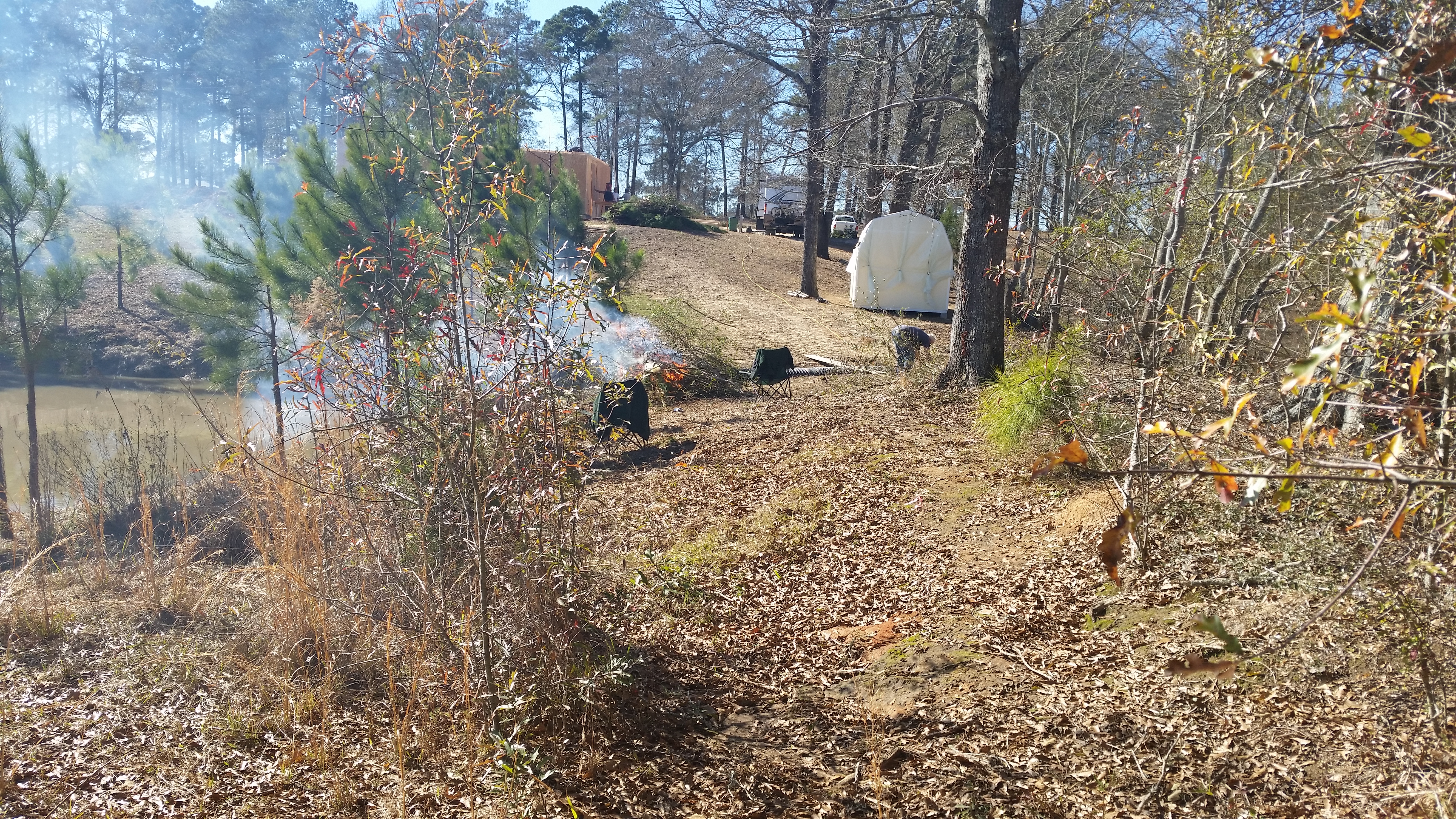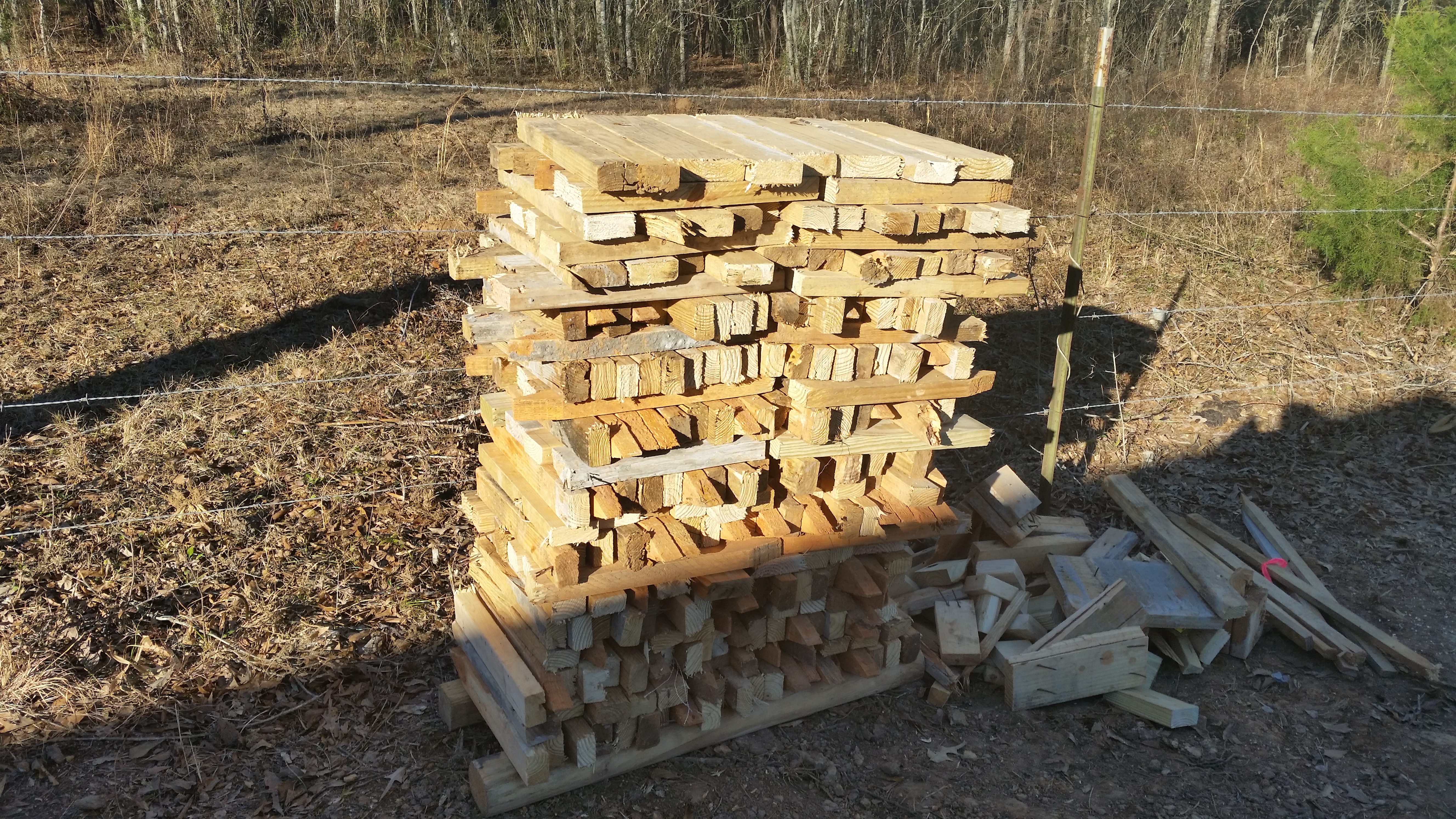 Roy built a big mound of trees, bushes, and thorny vines on our land just past the culverts and set it on fire. We are sitting out here by the fire right now, enjoying watching it burn and watching the construction workers work on the house.   There are several men working on the house and hearing them shout measurements to each other and discussing their work just warms my heart!