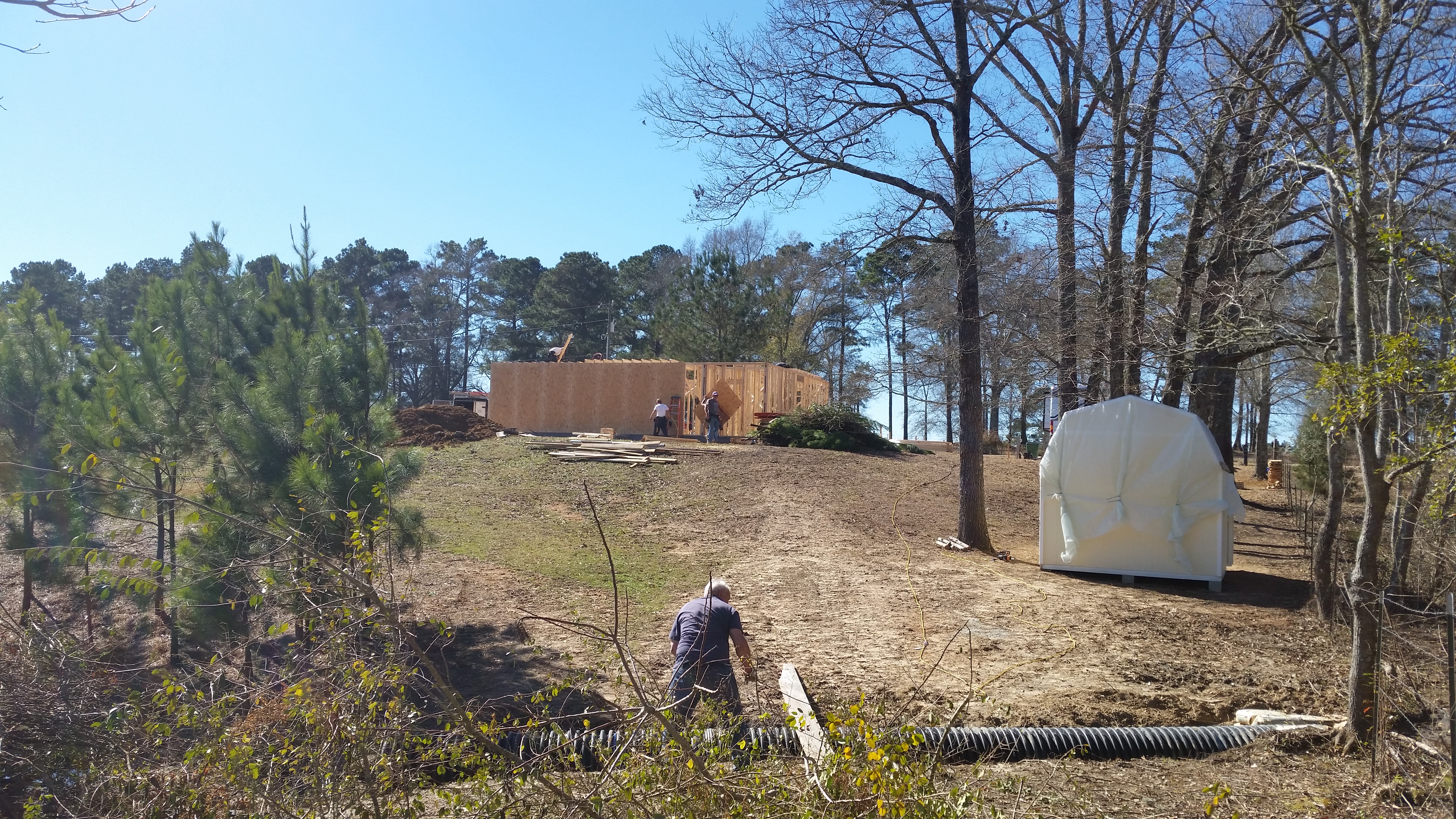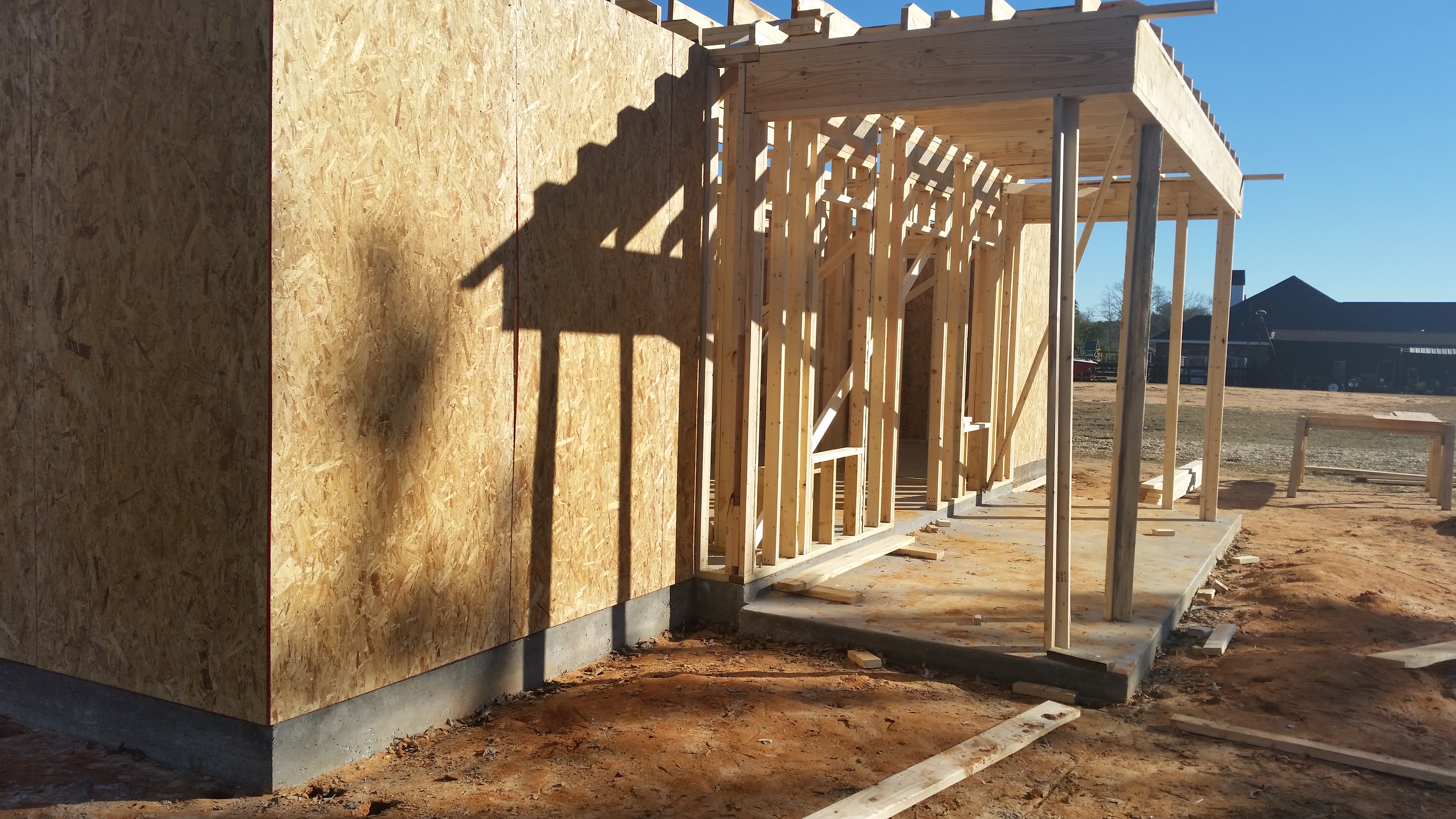 b4 a2a1 a4When the framers stopped working for the day at 3 pm they had sheets of boards (plywood?) around most of the exterior and the ceiling joists are going up also. Here’s pictures from their work today.  Great progress made and they say they will start on the roof tomorrow!!  With the interior walls studded and the exterior walls closed in you can get a better idea of the room sizes and they are not as small as I thought they may be!  It will be a  house before we know it!