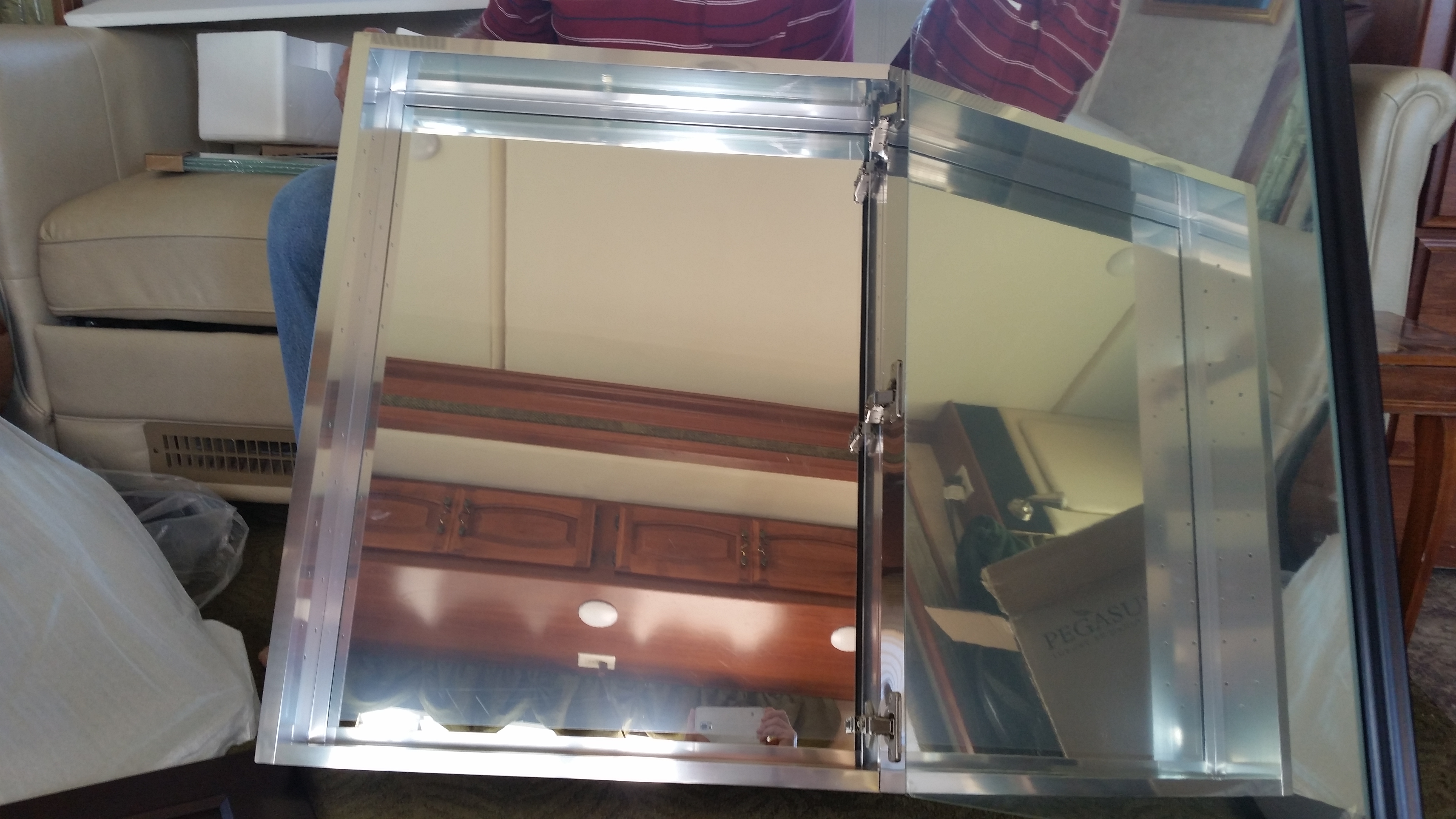 The second medicine cabinet arrived today. Here’s the front and interior of it. We love this one! We picked out a wall storage cabinet for over the toilet today that matches the medicine cabinet. There was no room in the basket for them today so that will be another day!