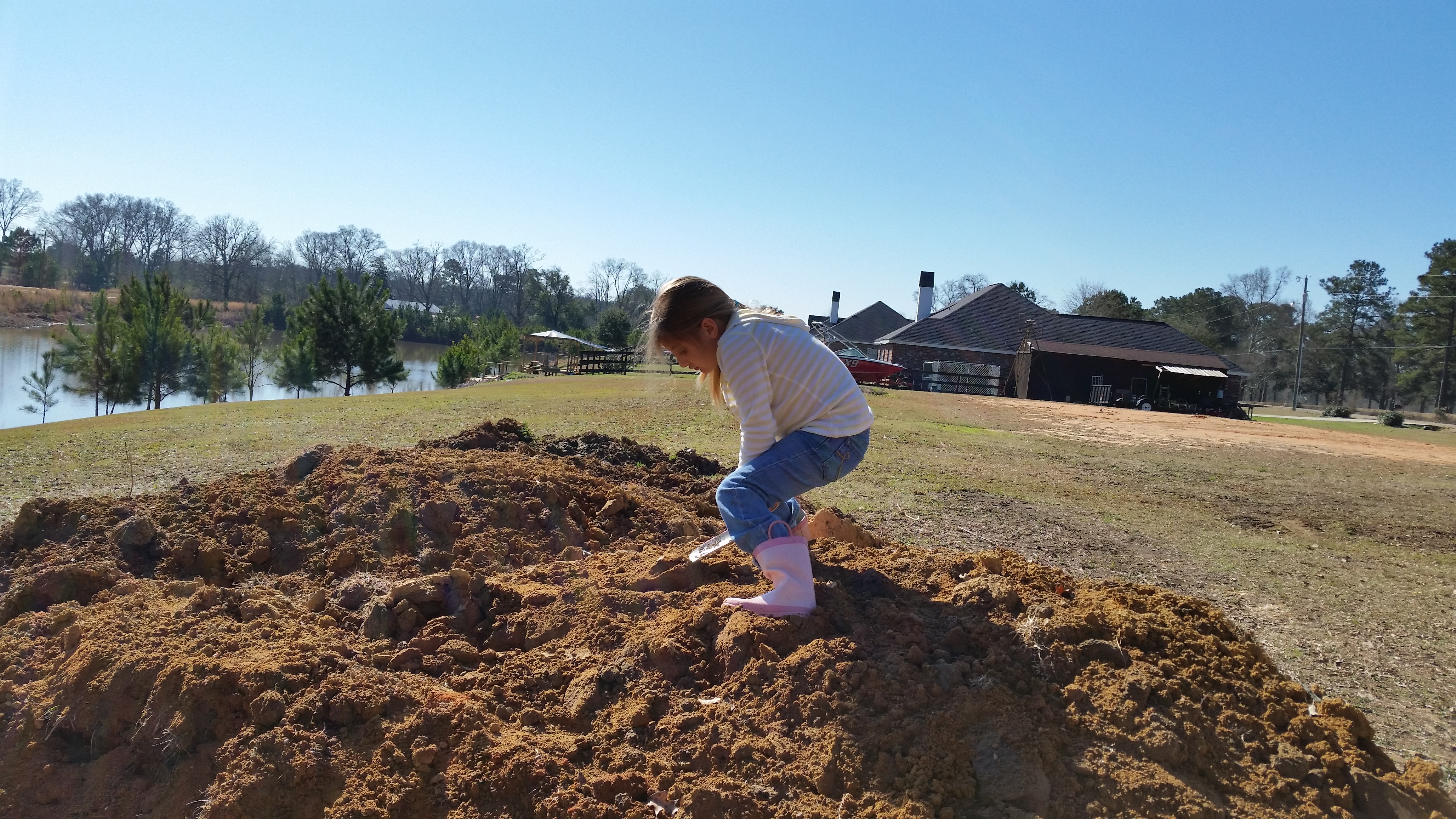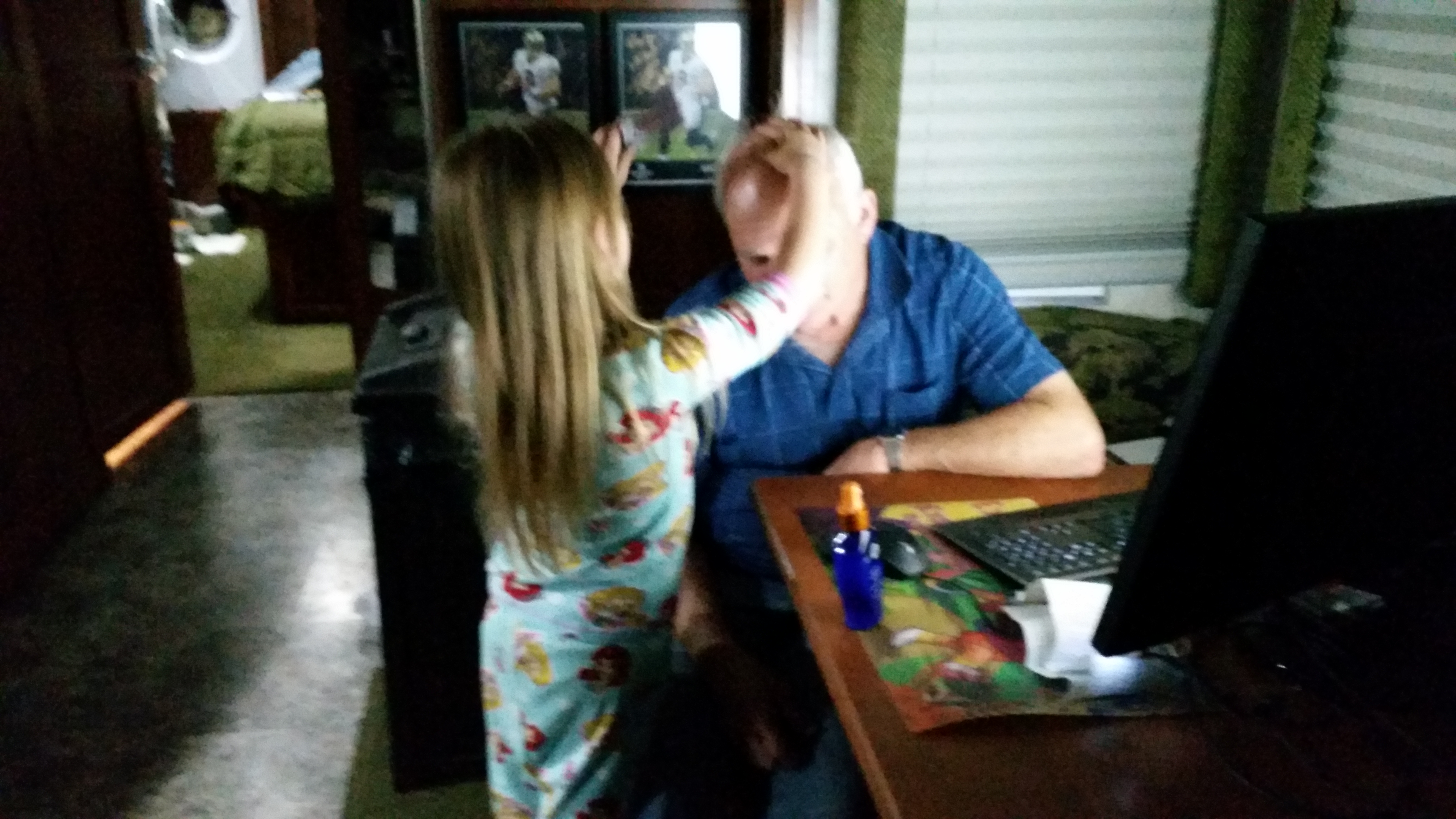 This is where our weekend with Madisyn ended when we brought her to her mama Liz at church. We had two very special nights and a whole fantastic day playing with her yesterday. We decorated heart shaped cookies, painted rainbows, flowers and us on a piece of roofing shingle while sitting down by the pond dipping our brushes in the flowing water, practiced skipping rocks, planted flowers near the RV patio, ran around A LOT, dug dirt from the big piles and hauled it in the wheelbarrow to the plants, watered the plants, searched for colored rocks in the ditch, watched Princess Diaries, made banana and mayonnaise sandwiches (ick!), mud pies, rolled down the hills and loved on each other a lot! She is growing up so fast and is so very independent at almost 6 years old. We hope to have her some during the Mardi Gras holiday when they have a week off of school – more fun and exhaustion!!!!!!