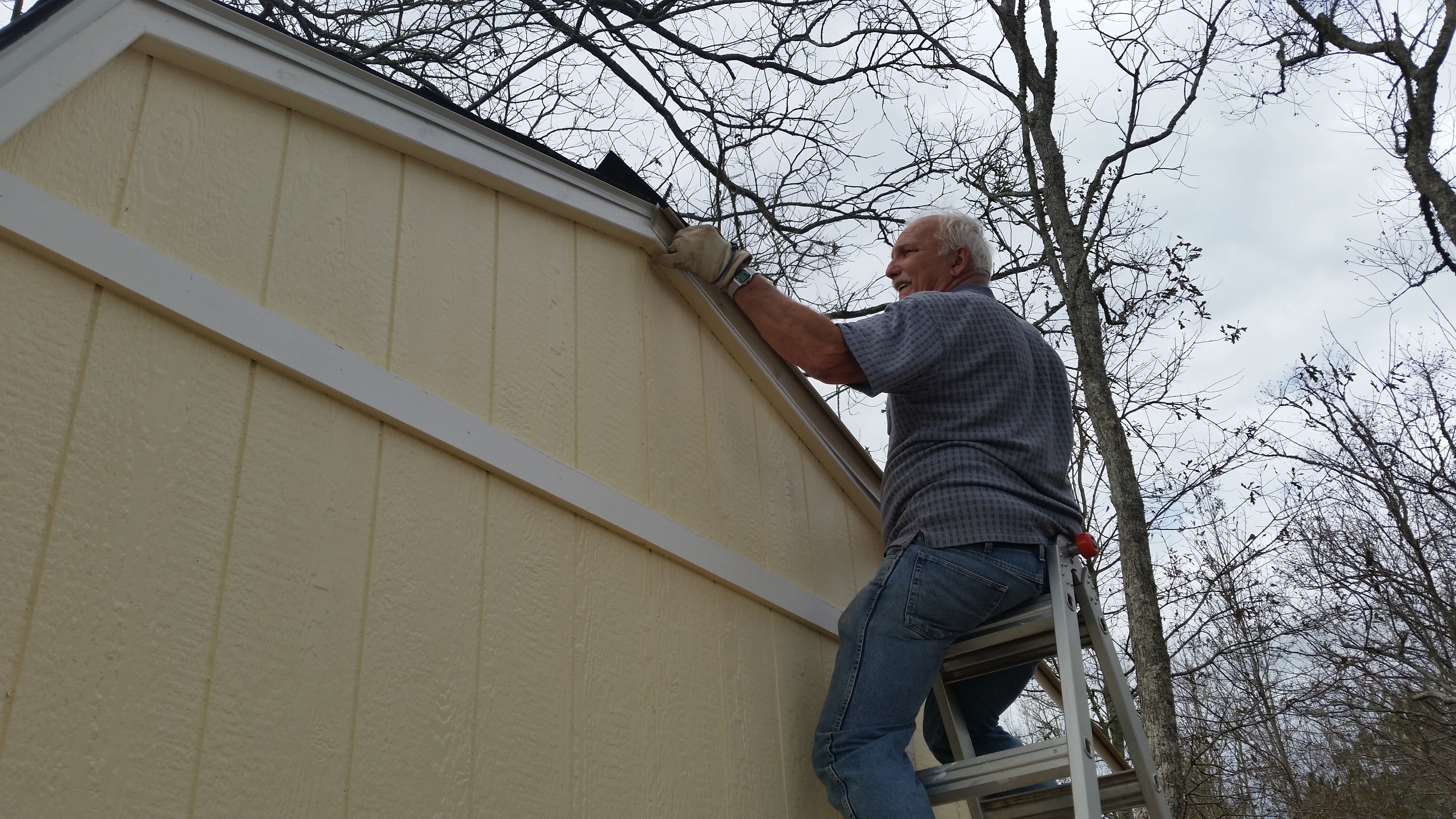 The roofers didn’t put the drip edge on the storage building roof in the correct place so Roy had to do that himself on Saturday.