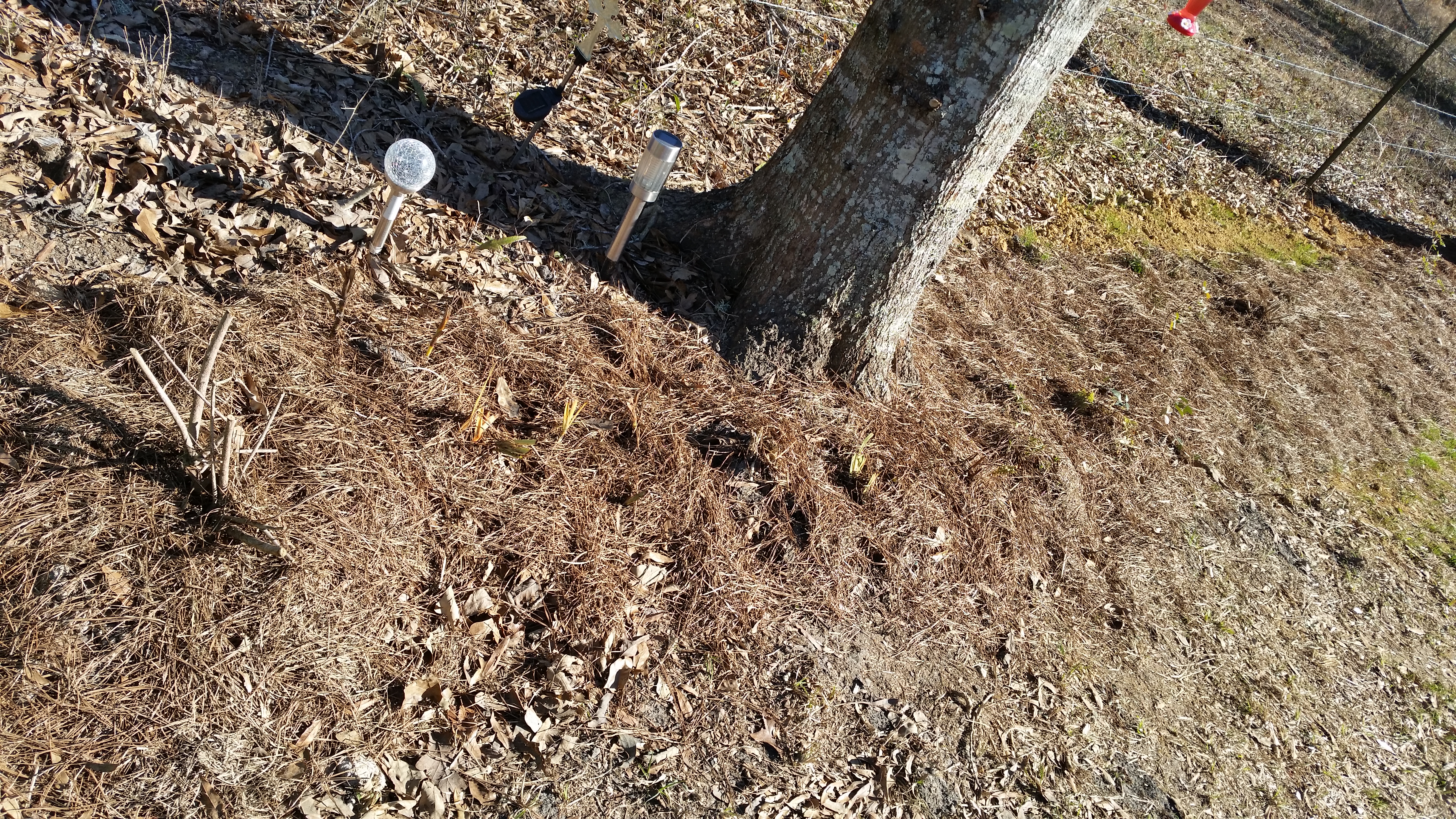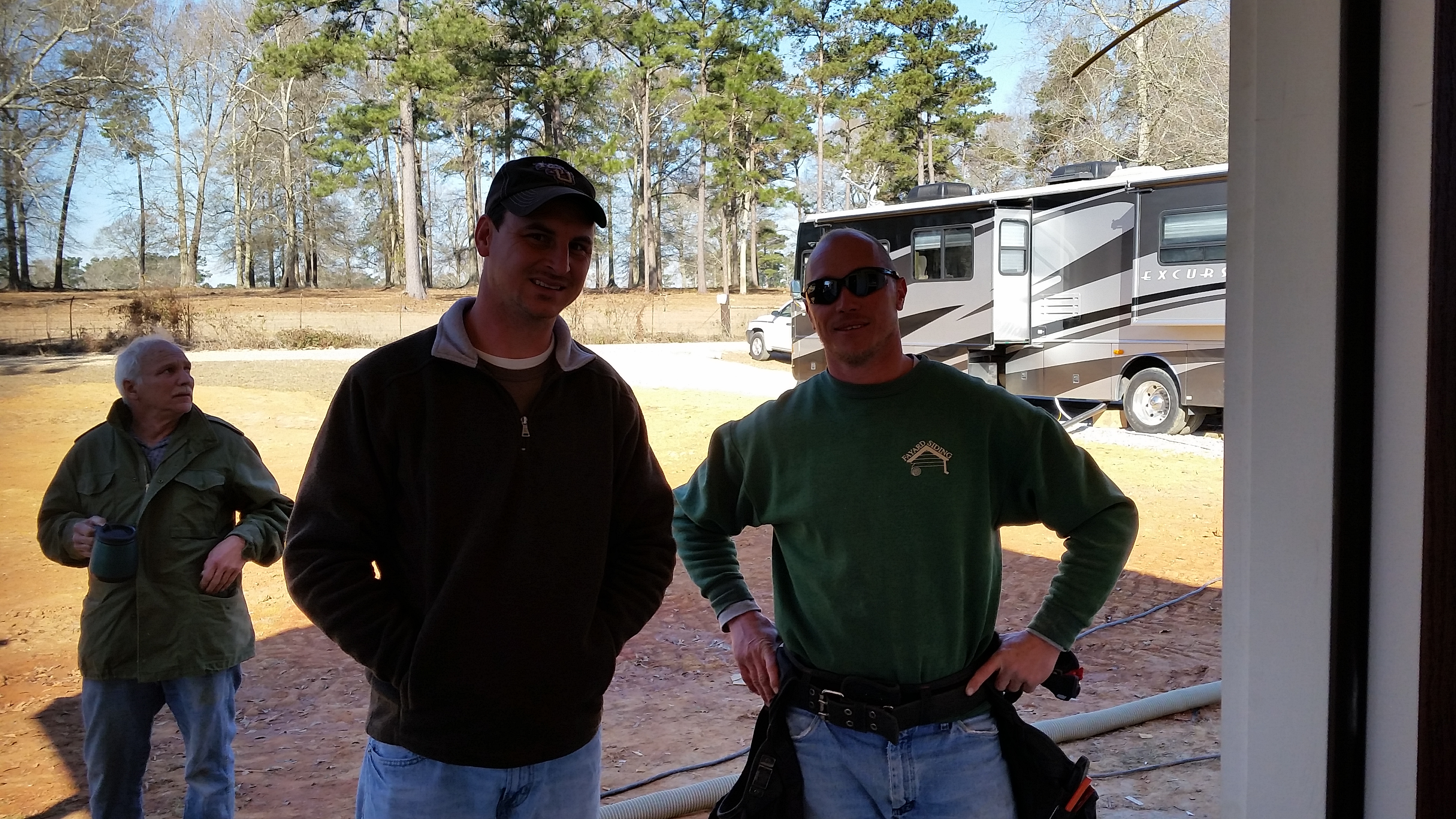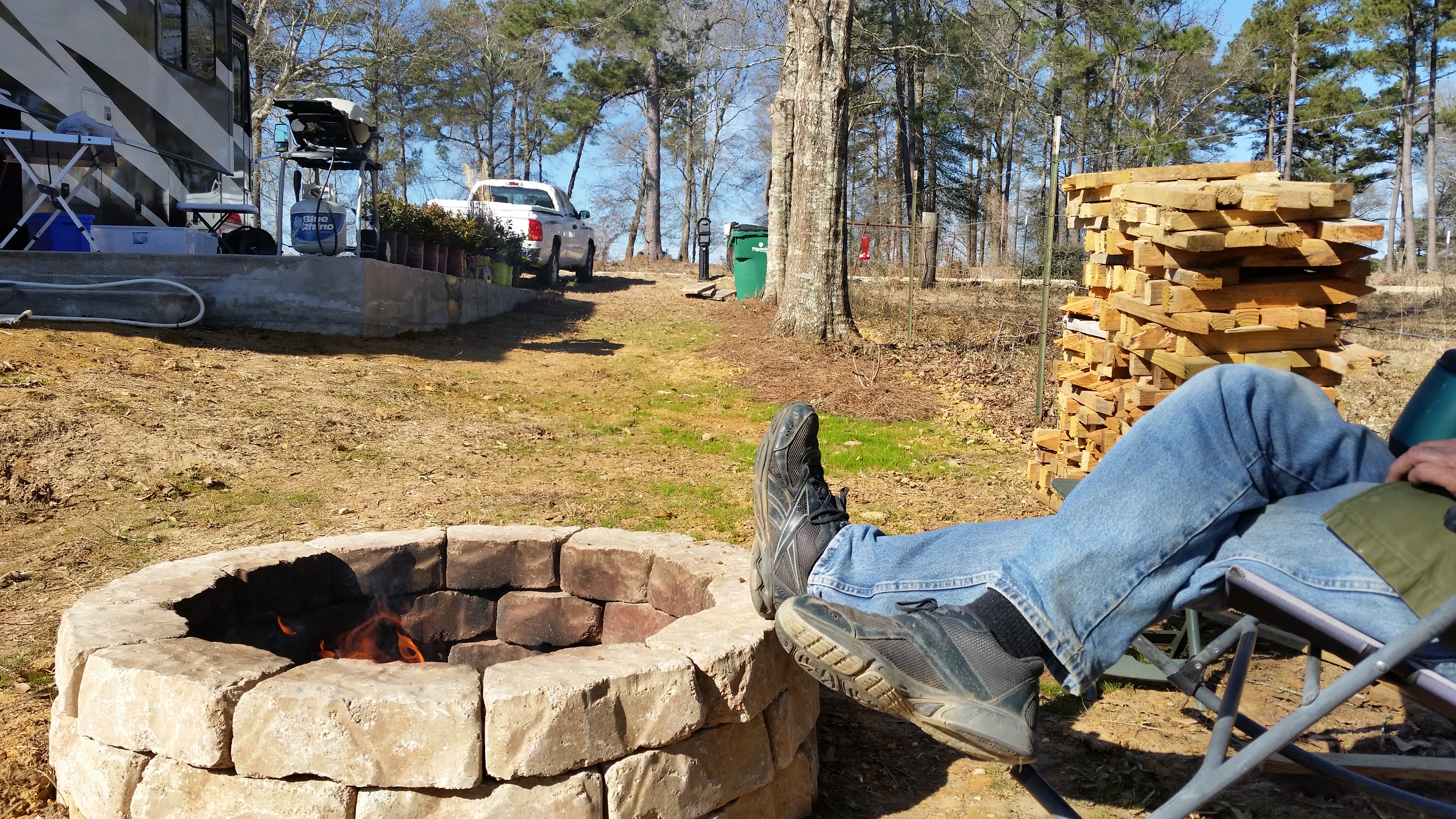 Roy rarely just sits around lately but this morning was so cold and he didn’t want to be in the way of the workers so we built a campfire and I took a shot of him actually chillin! There is also a picture of the flower bed I created next to the RV patio with all the little clippings I brought with us from our Wardline house! There are regular azaleas, orange/yellow lantanas, gardenias, ferns and other random small plants! Most are hidden right now by the pine mulched I covered them all with. By the time we get back here later this year or next they should all be growing well. Might even happen before we leave! Check out the signs of green rye grass starting to FINALLY sprout!