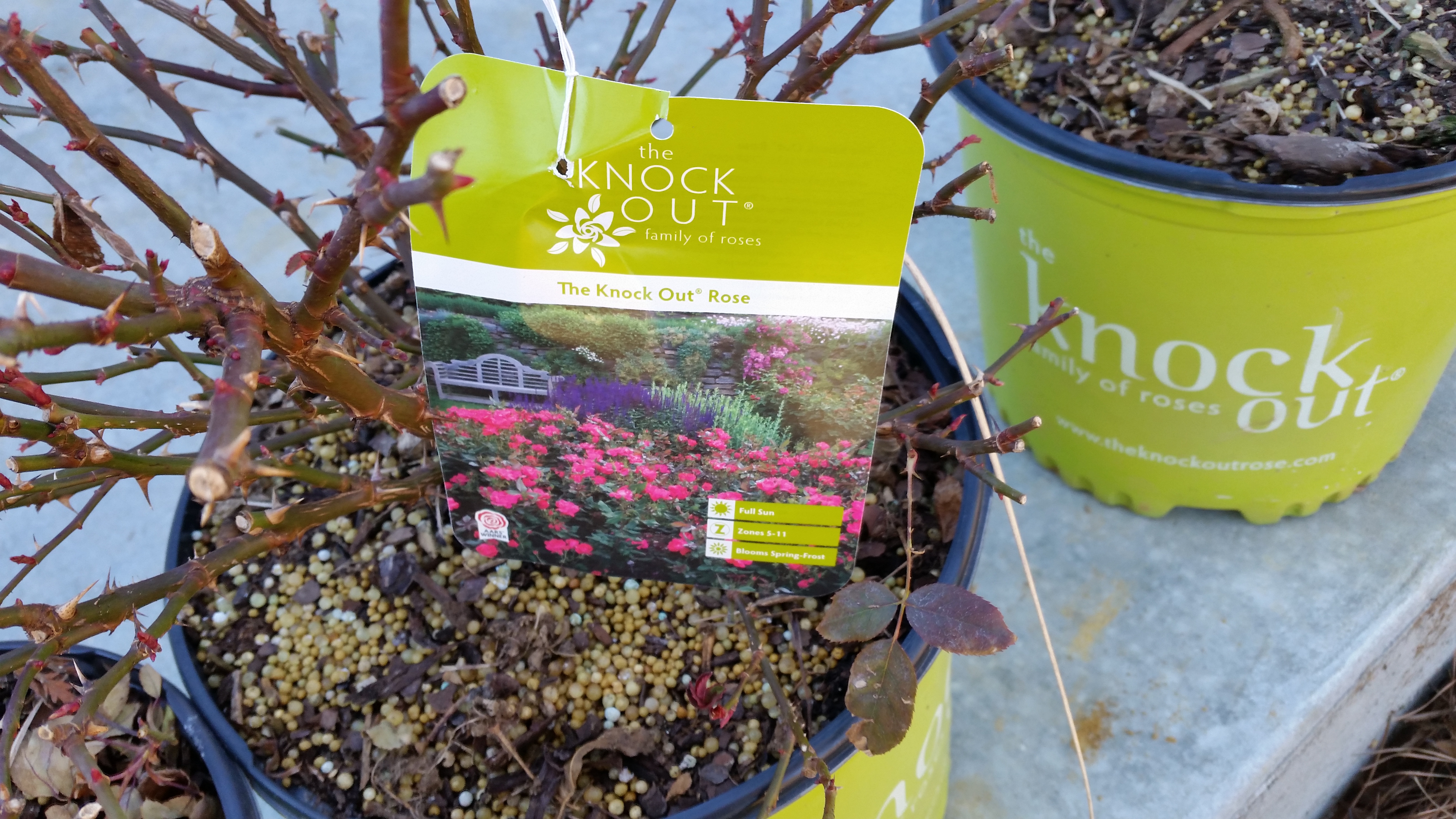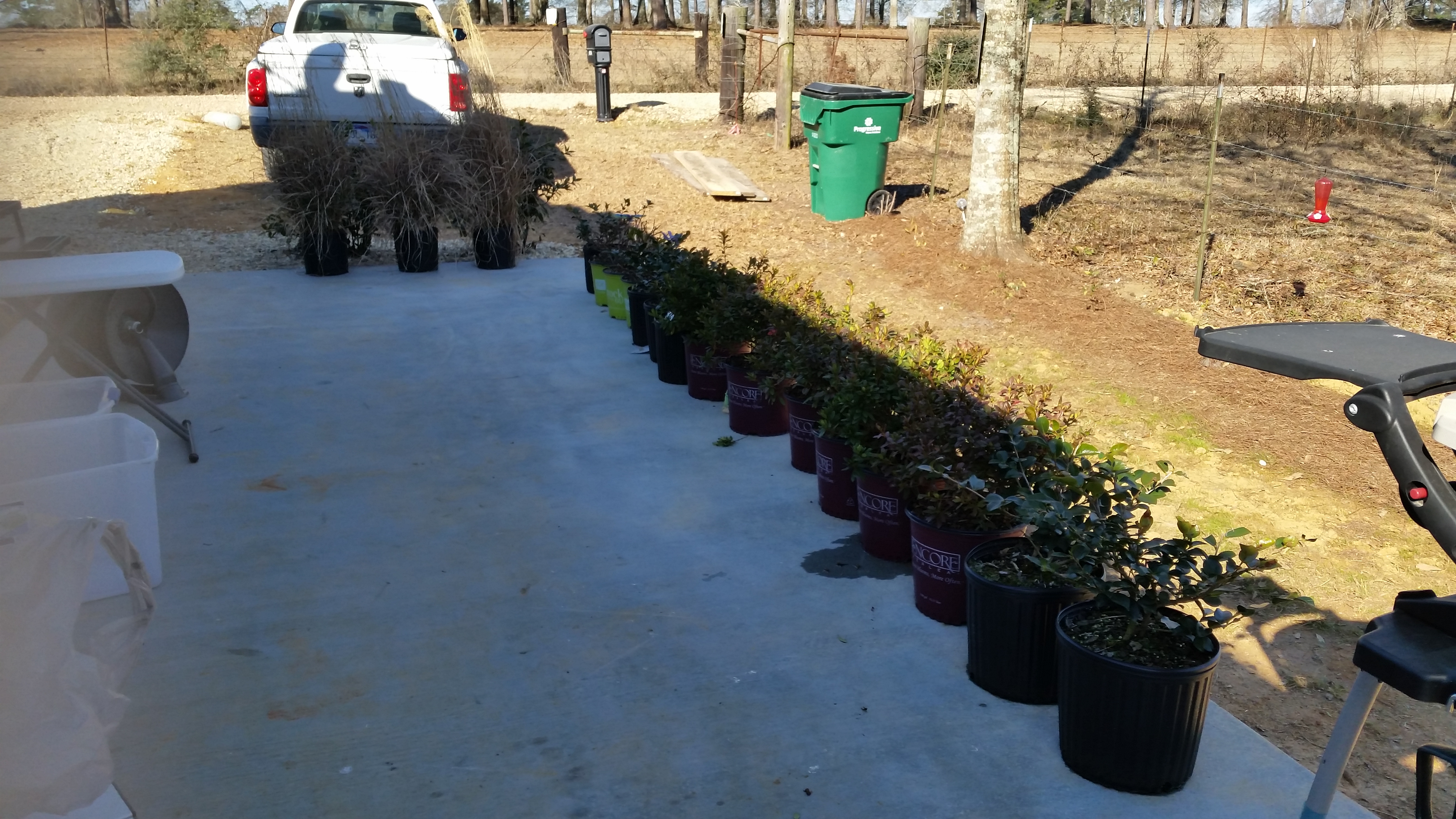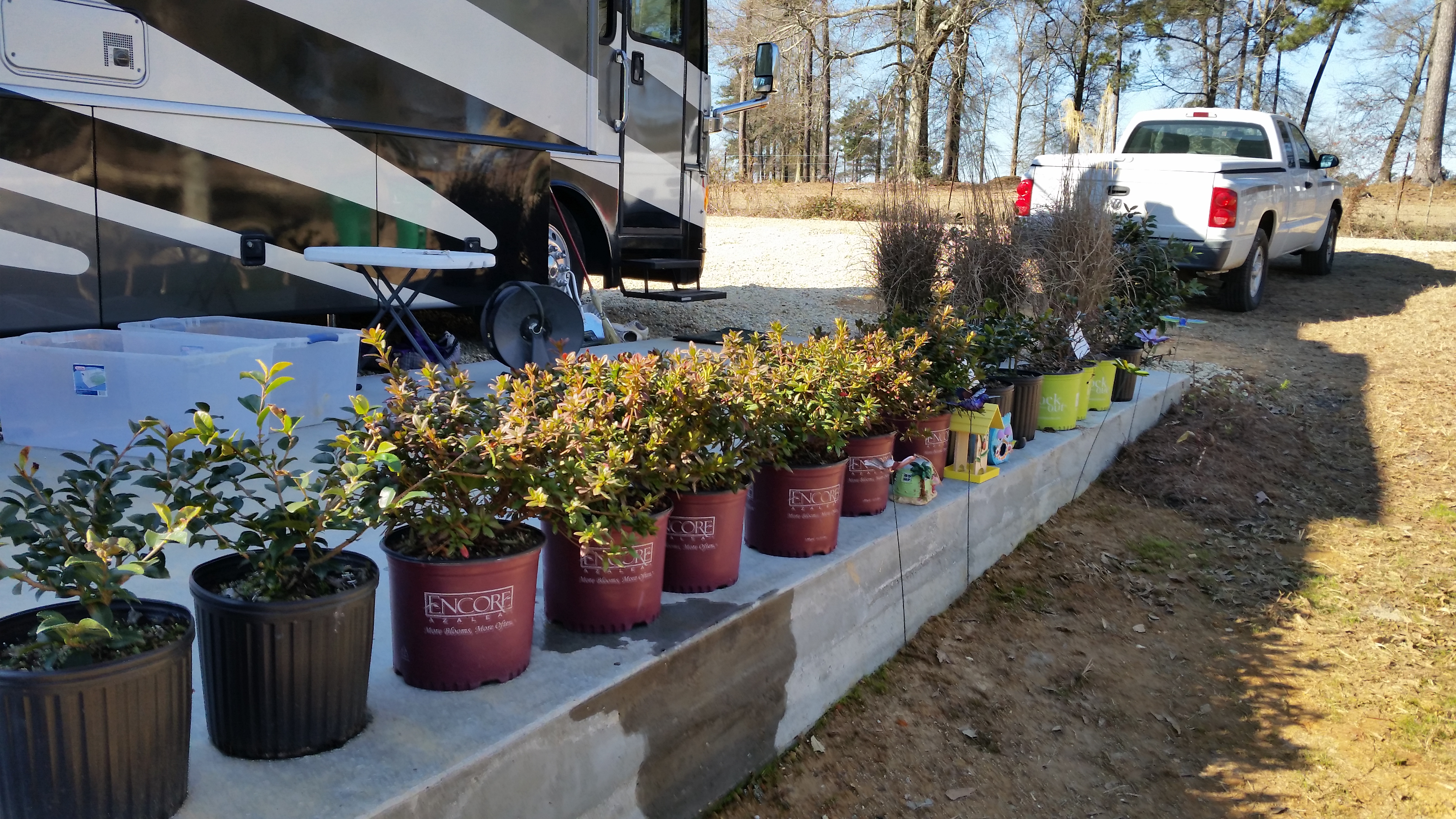 Thursday, February 12, 2015 – I went to a local wholesale nursery, where I use to work, to buy all the shrubs for the front of our house and to hide the air conditioning unit and the water well shed. I bought 6 Encore Azaleas (they flower all summer unlike regular azaleas that only flower for less than a month.) Also bought 3 Knock Out Rose bushes, 6 Camellias and 3 Adagio Grass. The Adagio Grass is the three dead looking tall grass things on the end. The grass plants be cut back shortly and will come out beautiful, green and luscious! All the bushes are all lined up on the RV’s patio waiting for the yard to be graded and beds prepared. We hope to have the grading done soon which will give the freshly planted bushes a while before we leave to take hold.
