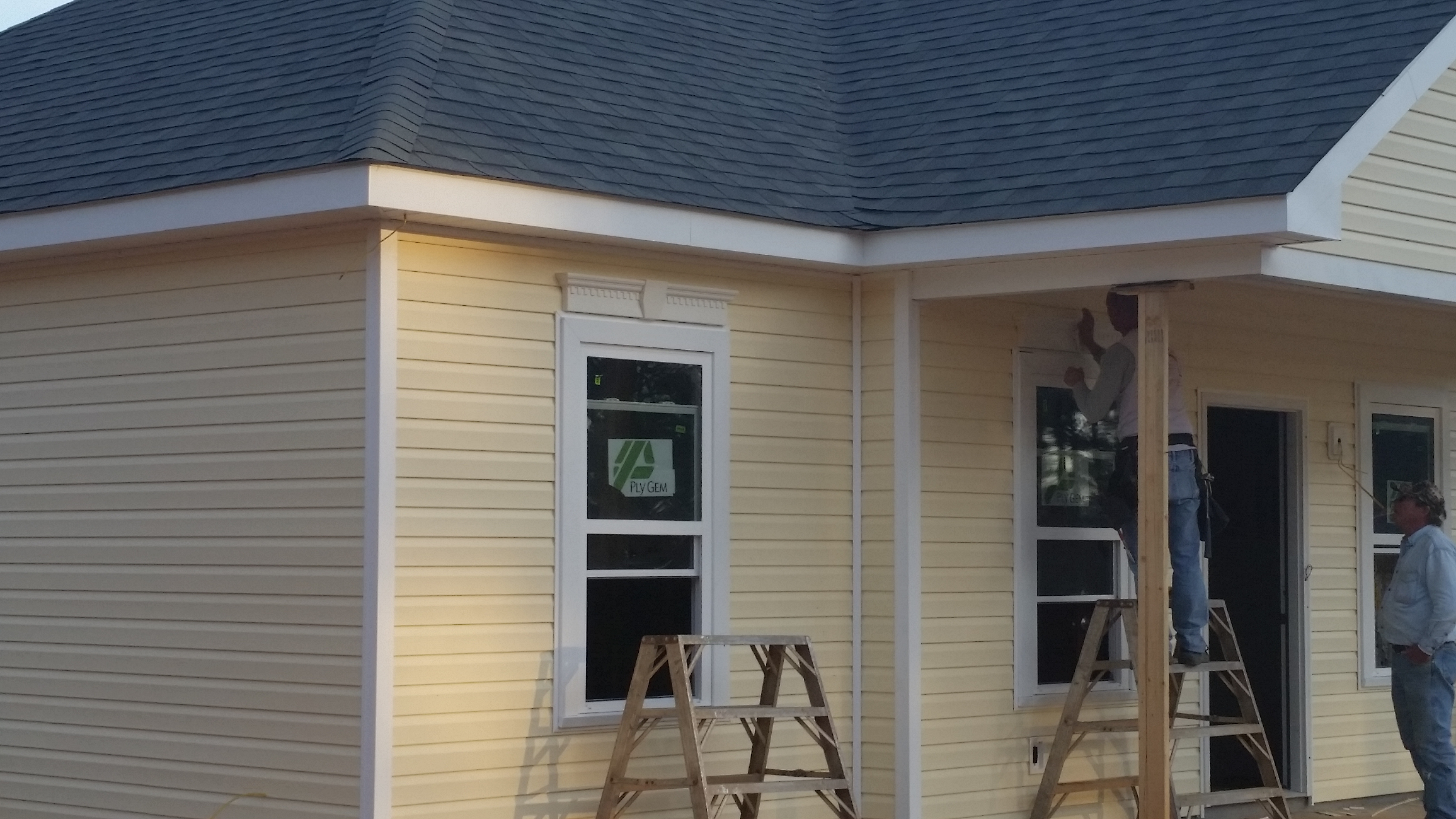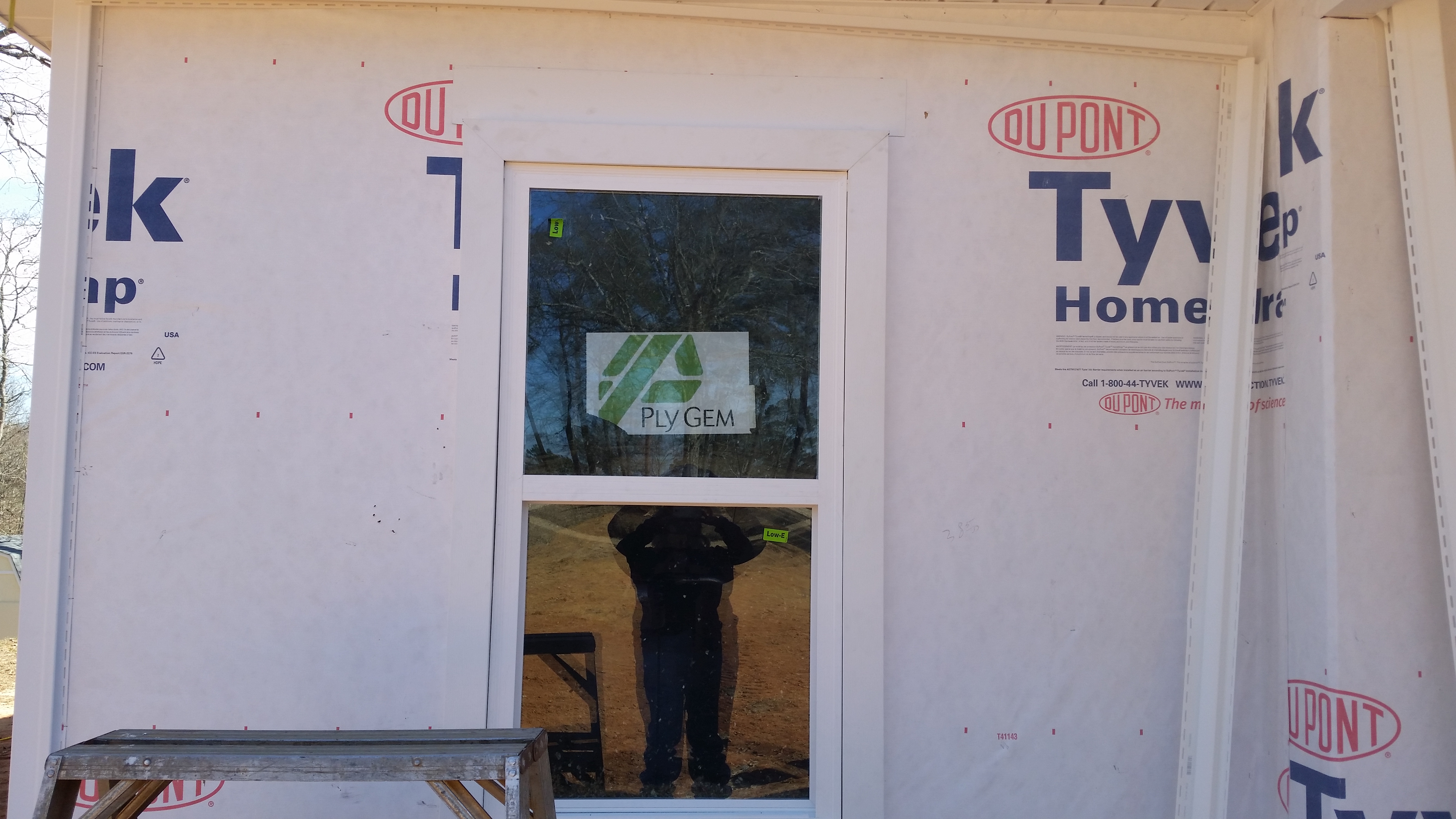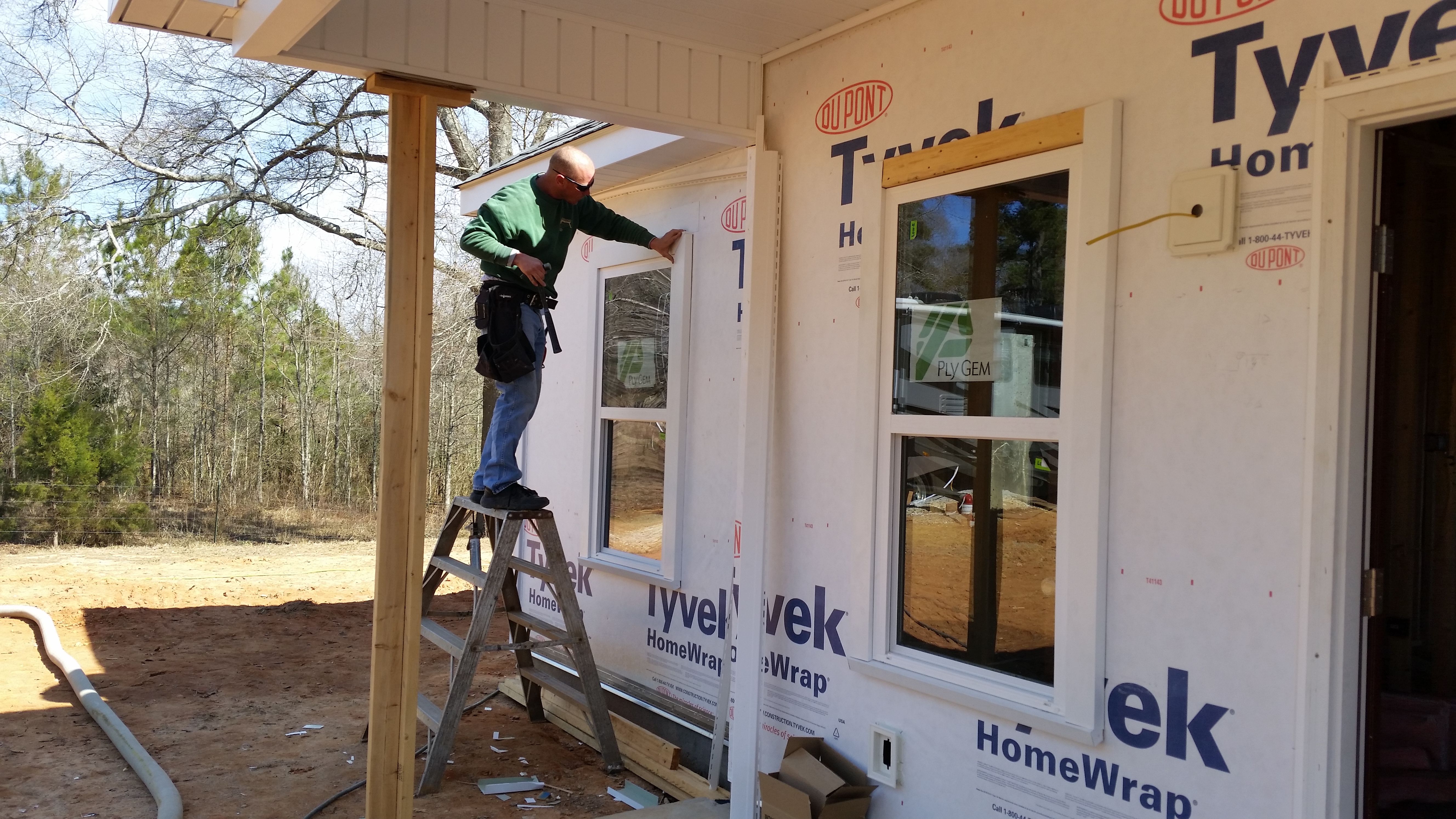 The sun is setting now and the columns are not finished so I’ll not try to take a picture of anything now, but take them in the morning and post the finished result then in the next blog. Earlier, Roy had to ask the guys to stop putting in the window headers since they are narrower than the windows and not connected to the top of the window. They just look weird so we’ll have to wait for larger ones to come in before the whole exterior is finished. There is a picture below that has the weird looking header installed but remember it’s going away! I also took a picture of one of the side windows without the window wrapping so you could see the difference between regular and wrapped. Once the columns are finished, the house exterior will be almost finished except for the correct headers and the porch railings. Roy will be installing the railings soon.