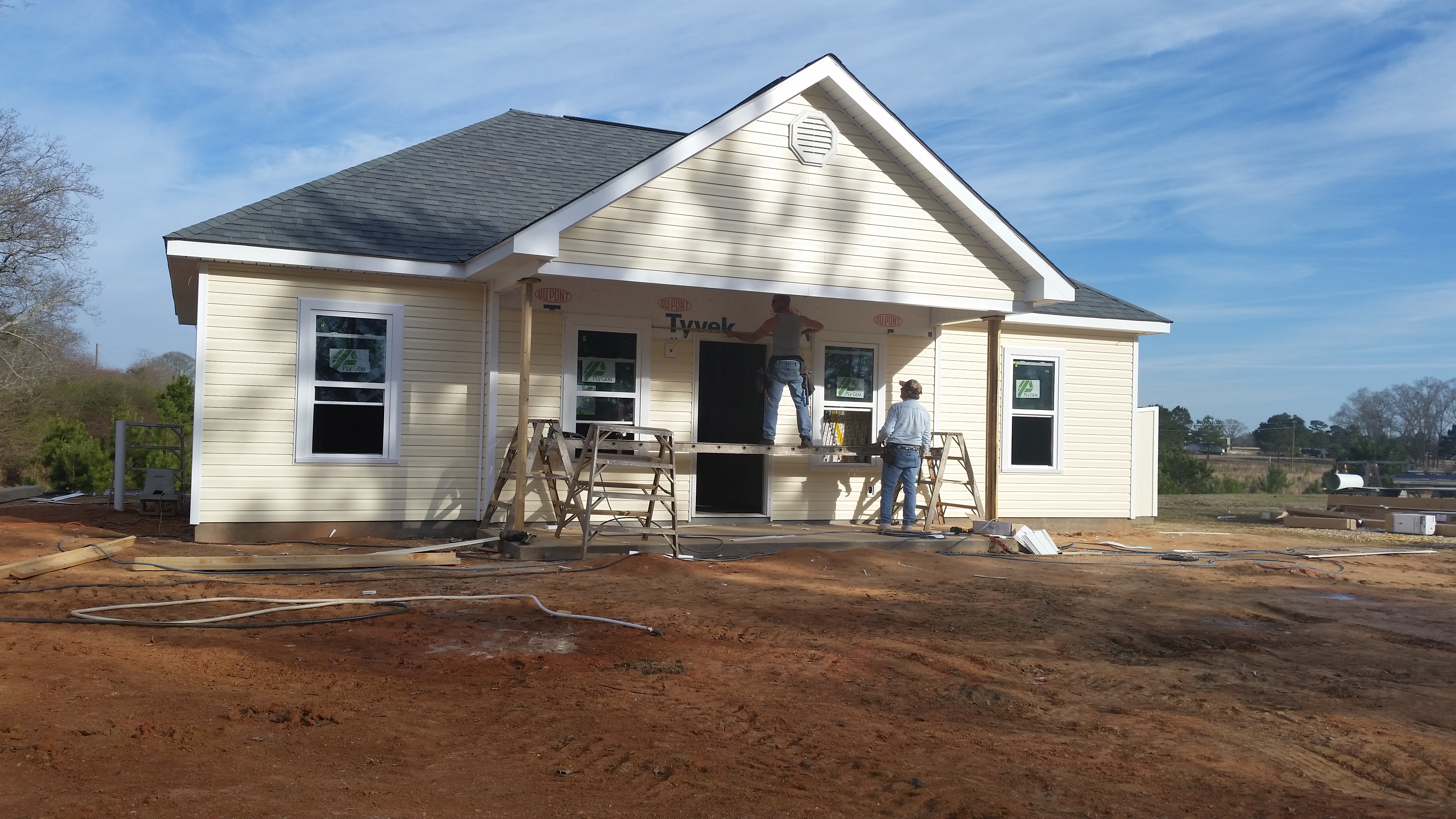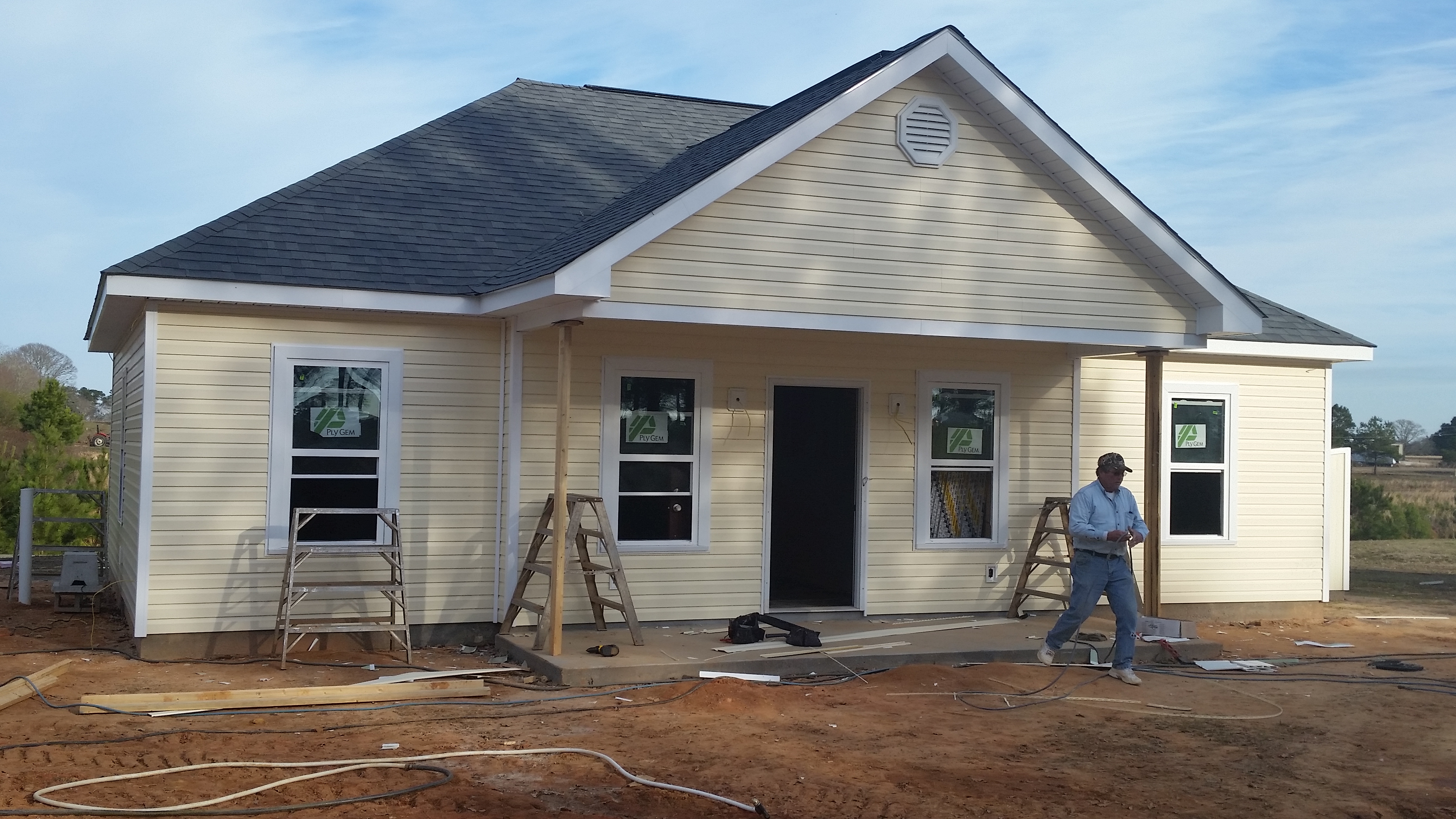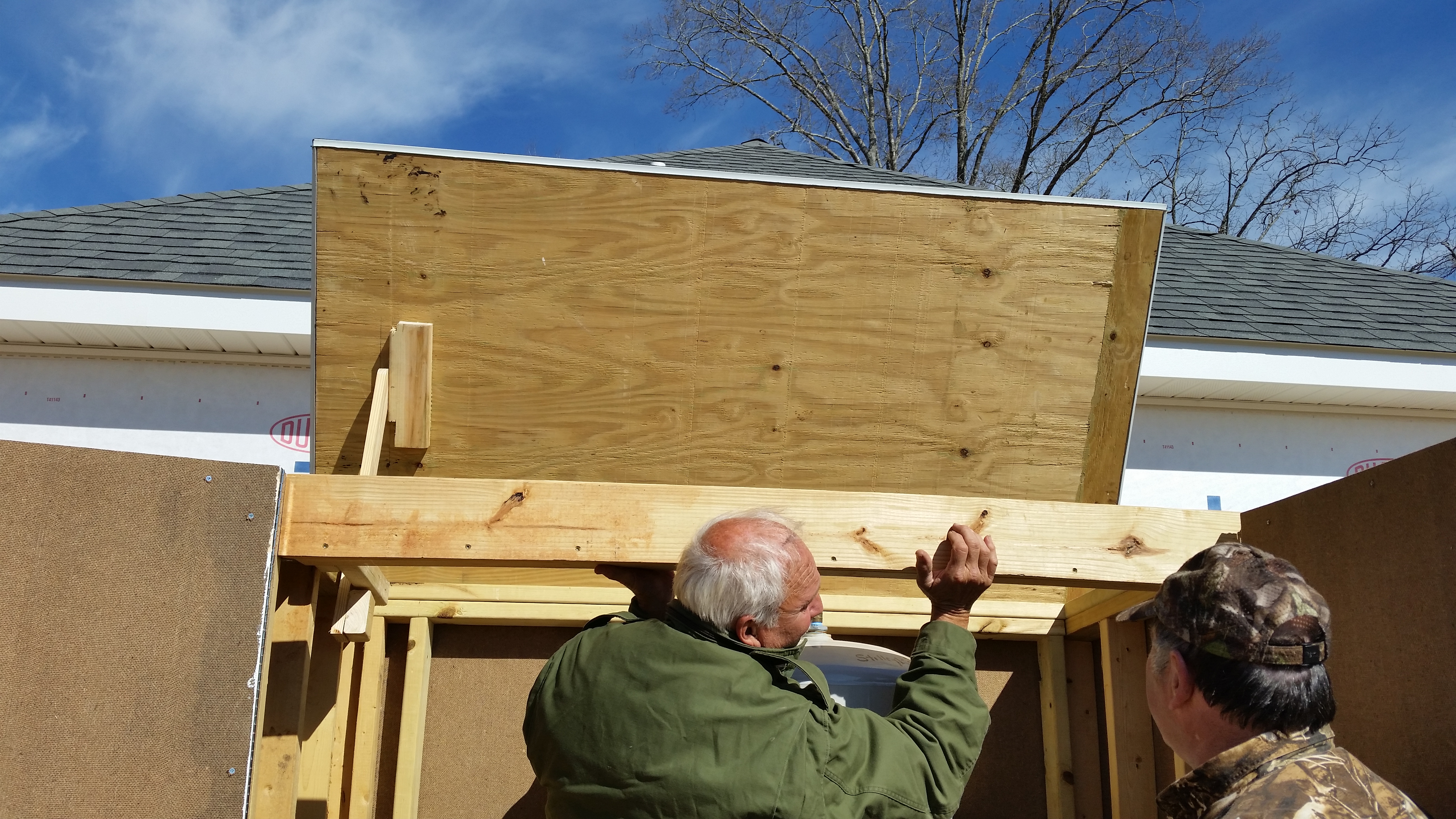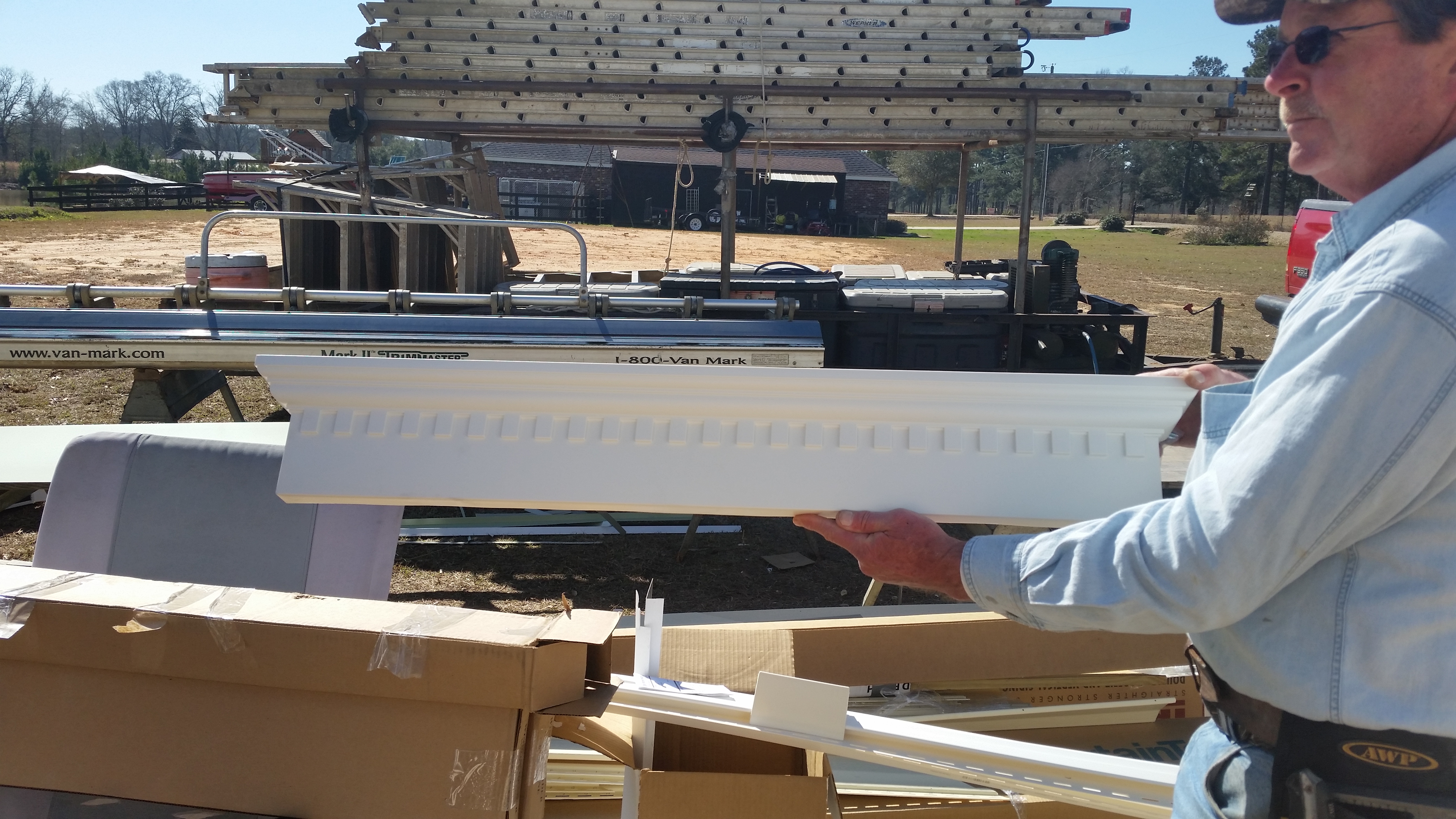 The sun is setting now and the columns are not finished so I’ll not try to take a picture of anything now, but take them in the morning and post the finished result then in the next blog. Earlier, Roy had to ask the guys to stop putting in the window headers since they are narrower than the windows and not connected to the top of the window. They just look weird so we’ll have to wait for larger ones to come in before the whole exterior is finished. There is a picture below that has the weird looking header installed but remember it’s going away! I also took a picture of one of the side windows without the window wrapping so you could see the difference between regular and wrapped. Once the columns are finished, the house exterior will be almost finished except for the correct headers and the porch railings. Roy will be installing the railings soon.