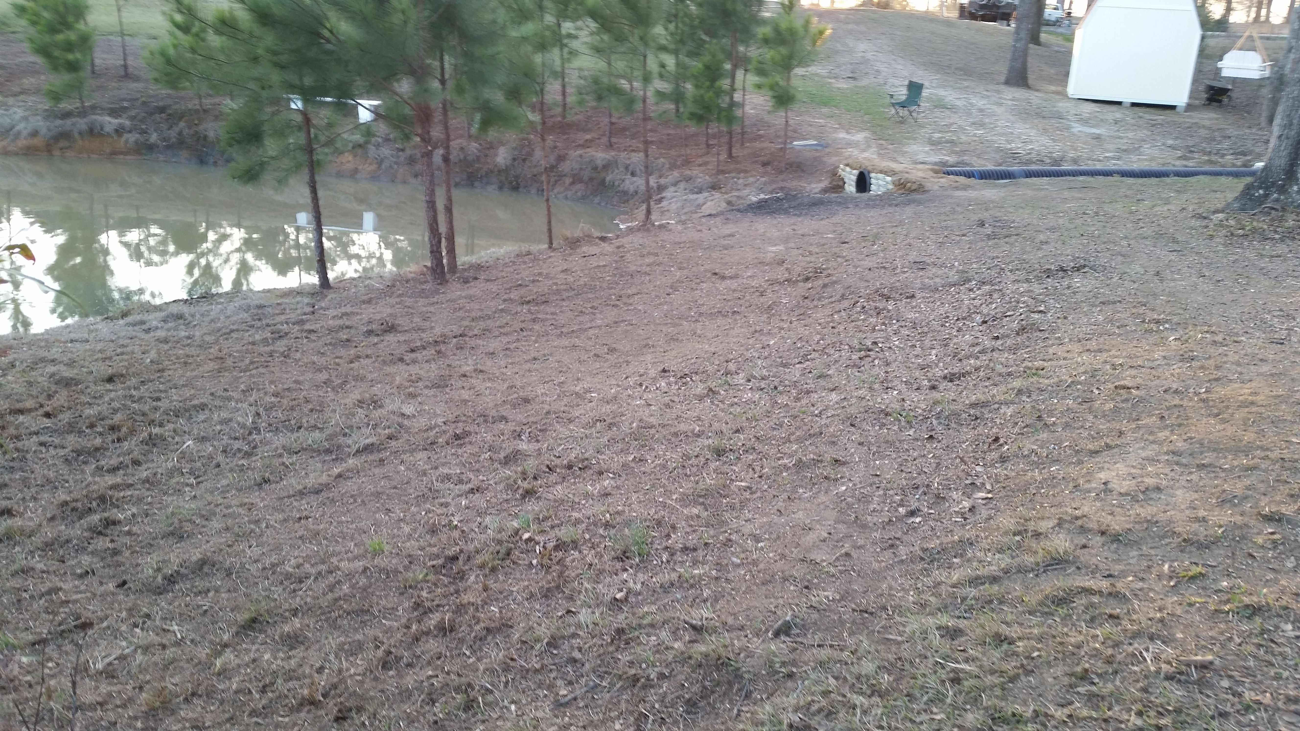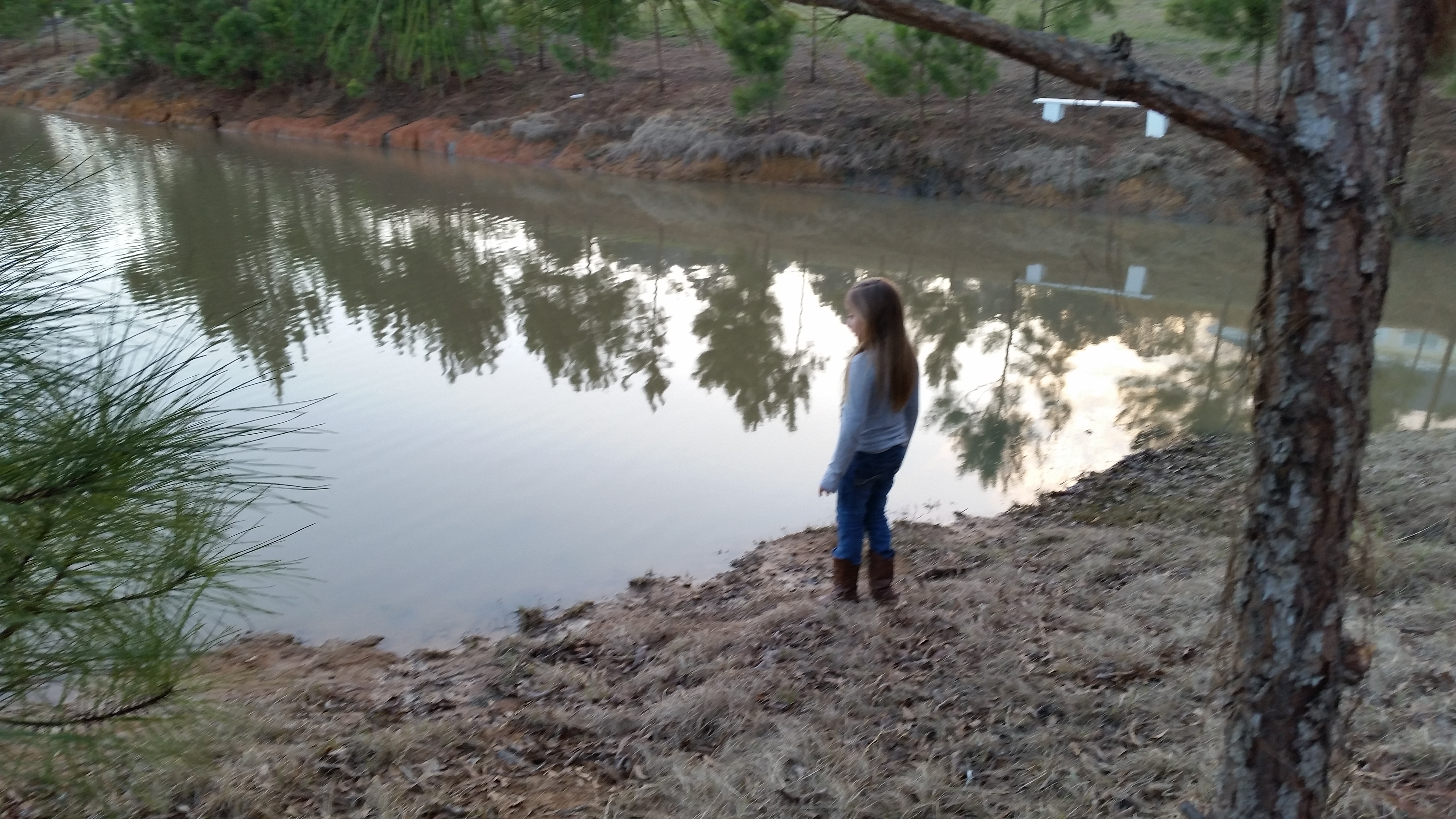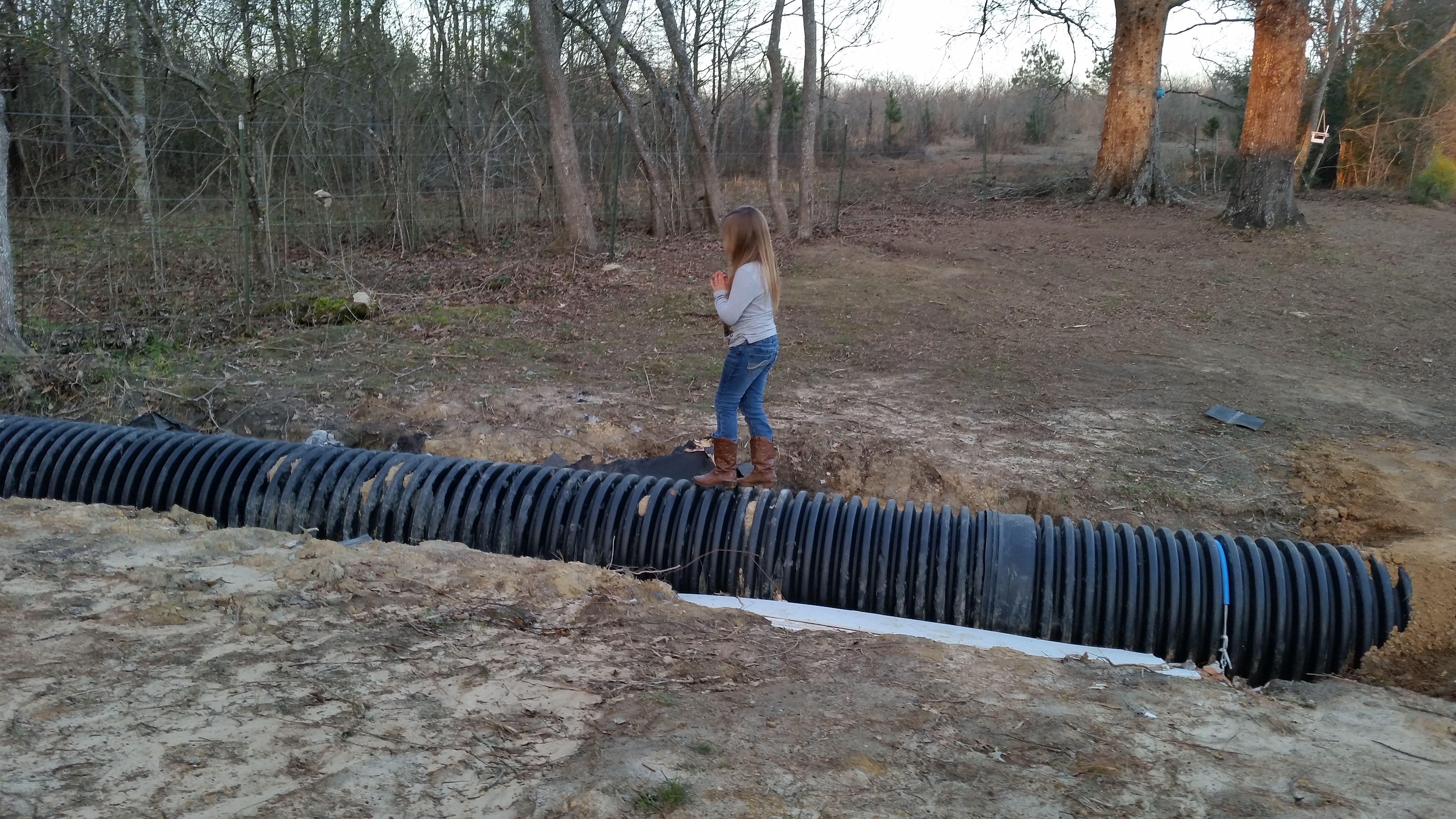 We played outside while there was still light on Saturday. I also took pictures of the newly cleared area on our land next to the pond. Now that Roy’s built a partial bridge over the culvert he was able to ride the lawnmower over there and cut back a lot of brush.