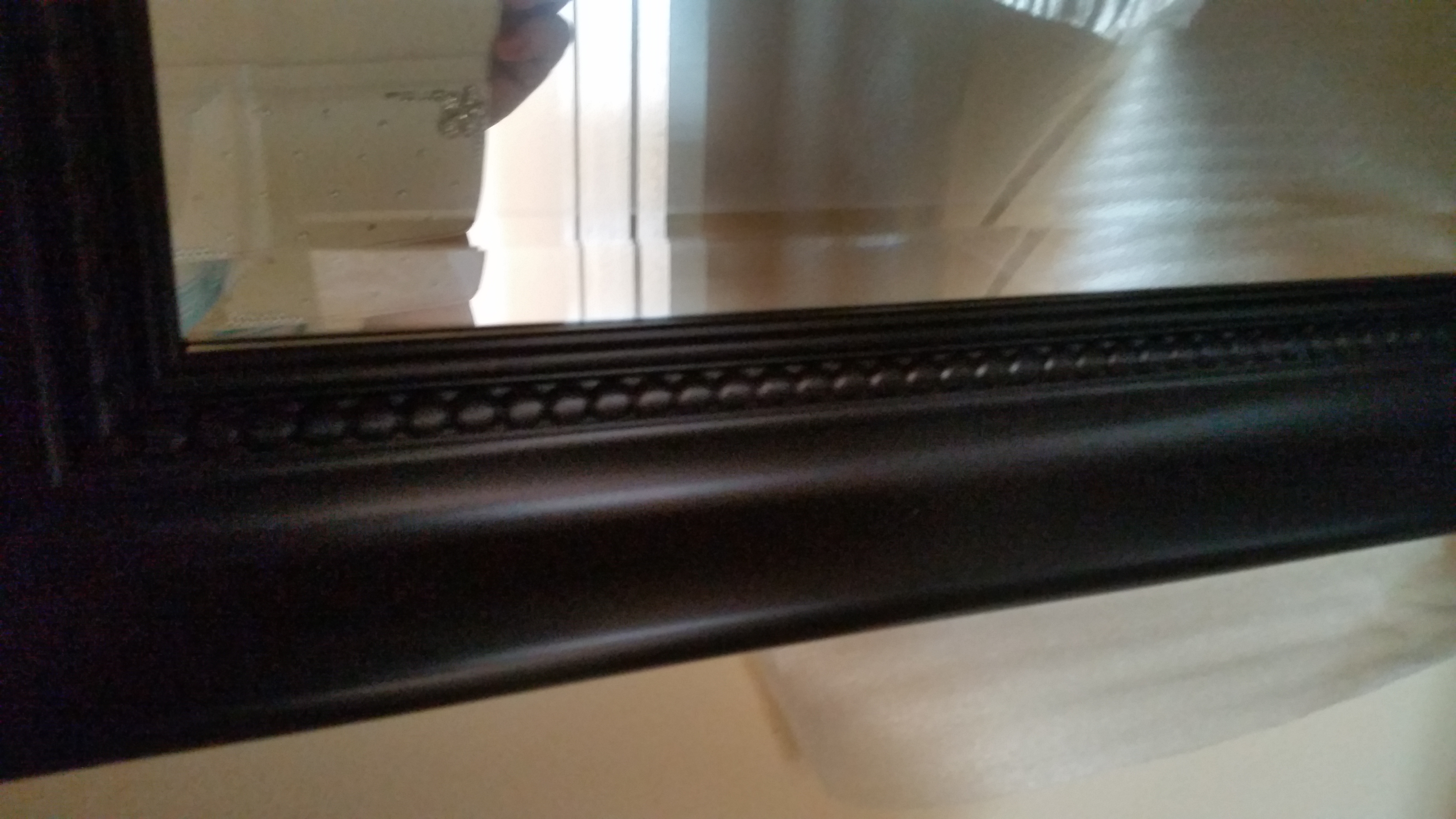 This is a close up of one of our medicine cabinets. It has beveled glass on the front, a beautiful black frame and mirrored insides with glass shelves.