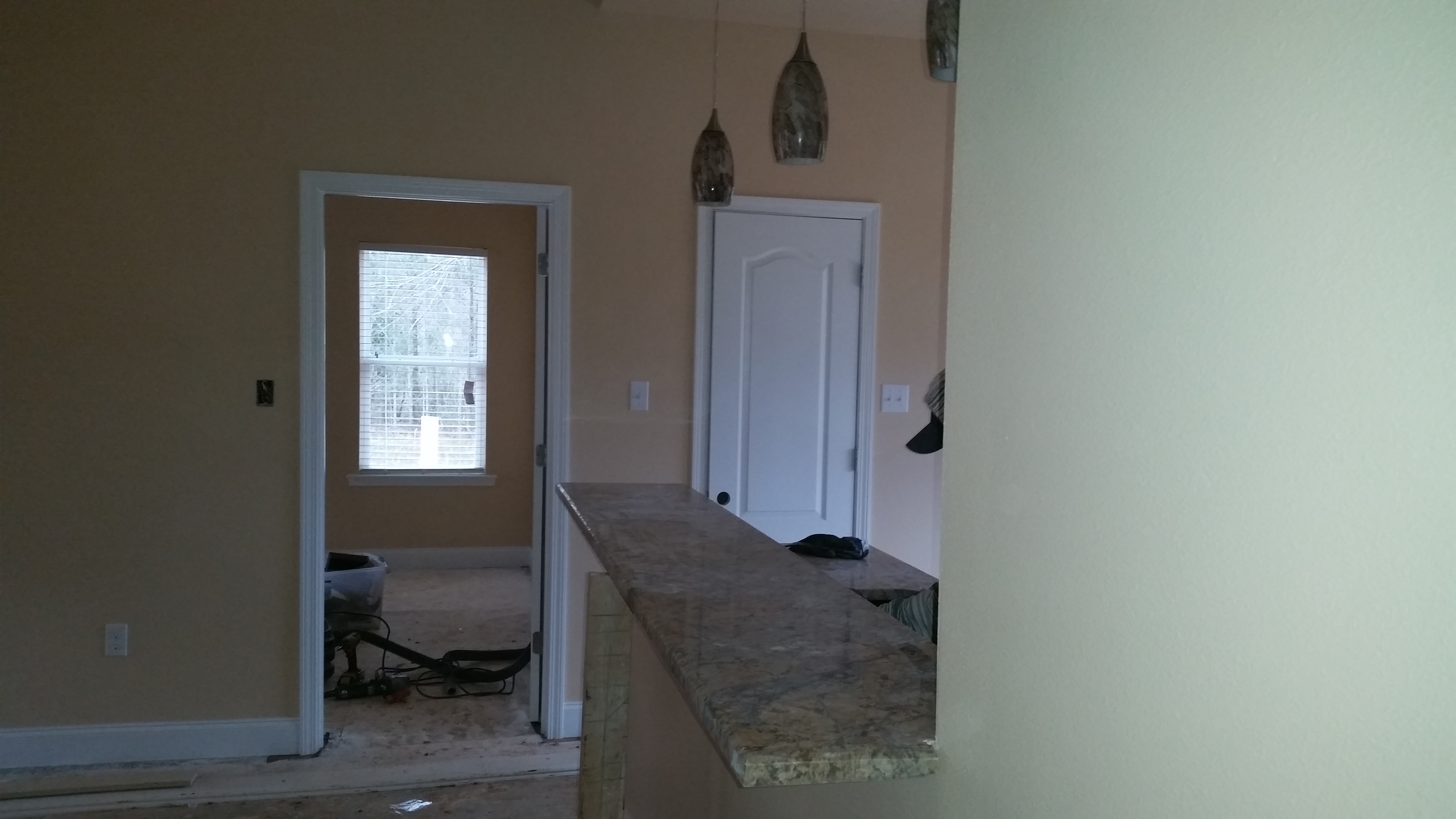 The counter top/cabinet workers came back this afternoon to correct all the problems which included replacing the entire back splash behind the sink under the breakfast bar. They also smoothed out some rough spots in different places and added a strip of wood for the dishwasher to be screwed into. They ran out of time so they didn’t install the trim or change the door around.