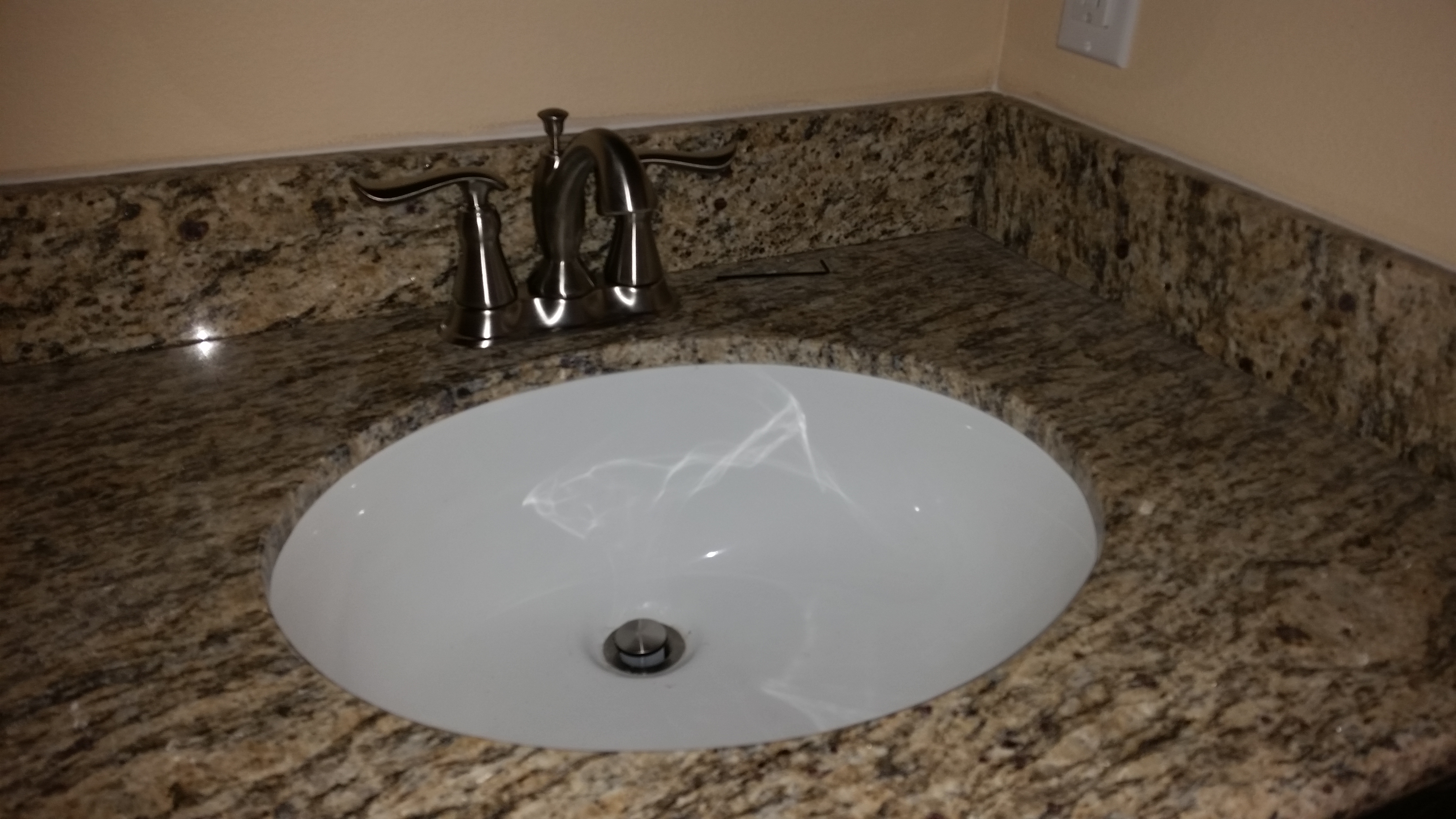 The counter tops were finished yesterday and holes drilled for the faucets and soap dispenser. The pictures were taken after yesterday’s blog post but before they wrapped up their work. We LOVE the counter tops and how they look! Only thing better would have been if they were free!